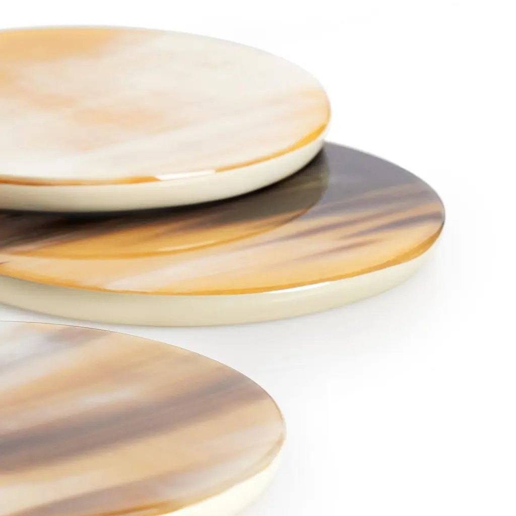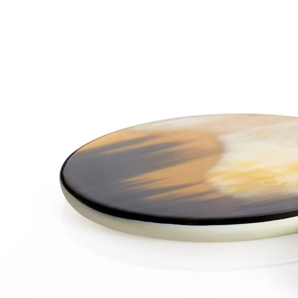 Playing a funtional yet decorative role, these round coasters are a clever blend of exclusive materials and gentle shapes. Handcrafted from lacquered wood with cream-colored finish, each coaster's top showcases the signature patterns and the unique colour tones of natural Corno Italiano. Coming in a set of two pieces, these coasters are available in glossy finish and promise to tastefully protect your tabletops. Note: Colors and shades of Corno Italiano processed by our Company are unique and due to the natural origin of raw material. For this reason Corno Italiano tones that can be seen in pictures are indicative and cannot be reproduced in finished products.