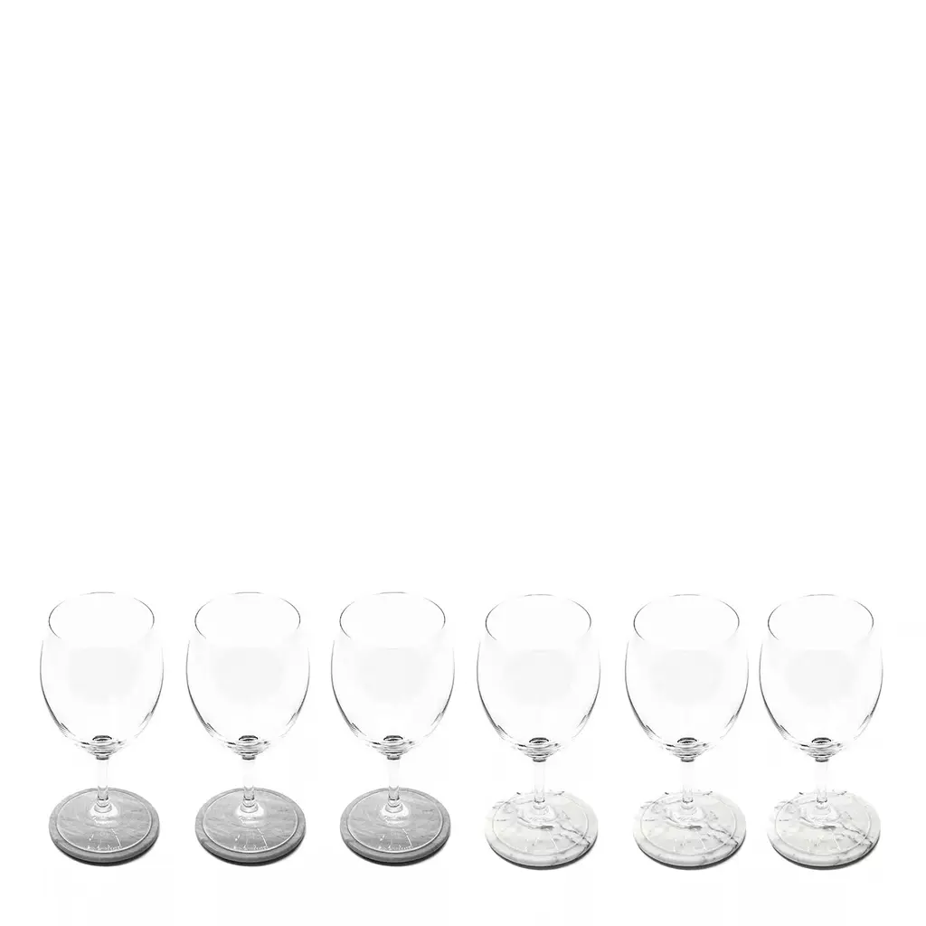 A spot-on choice to add an accent of restrained elegance to contemporary tables, this set is composed of four round coasters respectively in grey and white marble. Its seductive, natural veining in contrasting colors contributes to the uniqueness of each piece. A layer of cork placed on the back ensures the necessary grip, completing this refined set.