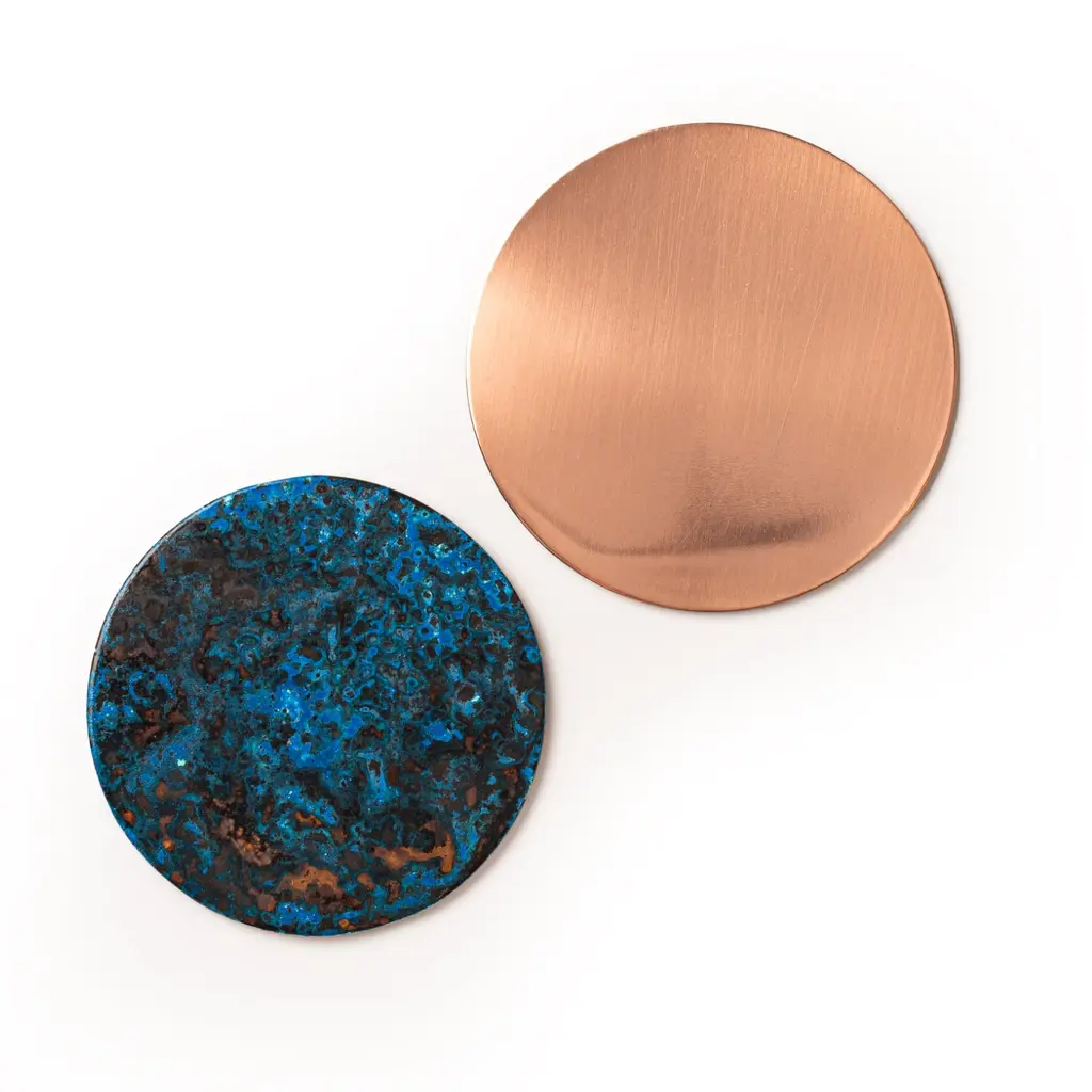 Elevate your table setting with the artisanal beauty of this Handcrafted Copper & Patina Coaster Set. Featuring a striking combination of polished copper and a richly textured blue patina, these coasters bring a touch of rustic charm and sophistication to your home décor. The earthy tones of the patina create a unique, organic pattern on each piece, while the polished copper side adds a sleek, modern contrast. Ideal for both everyday use and special occasions, these coasters protect surfaces while offering an elegant visual statement.