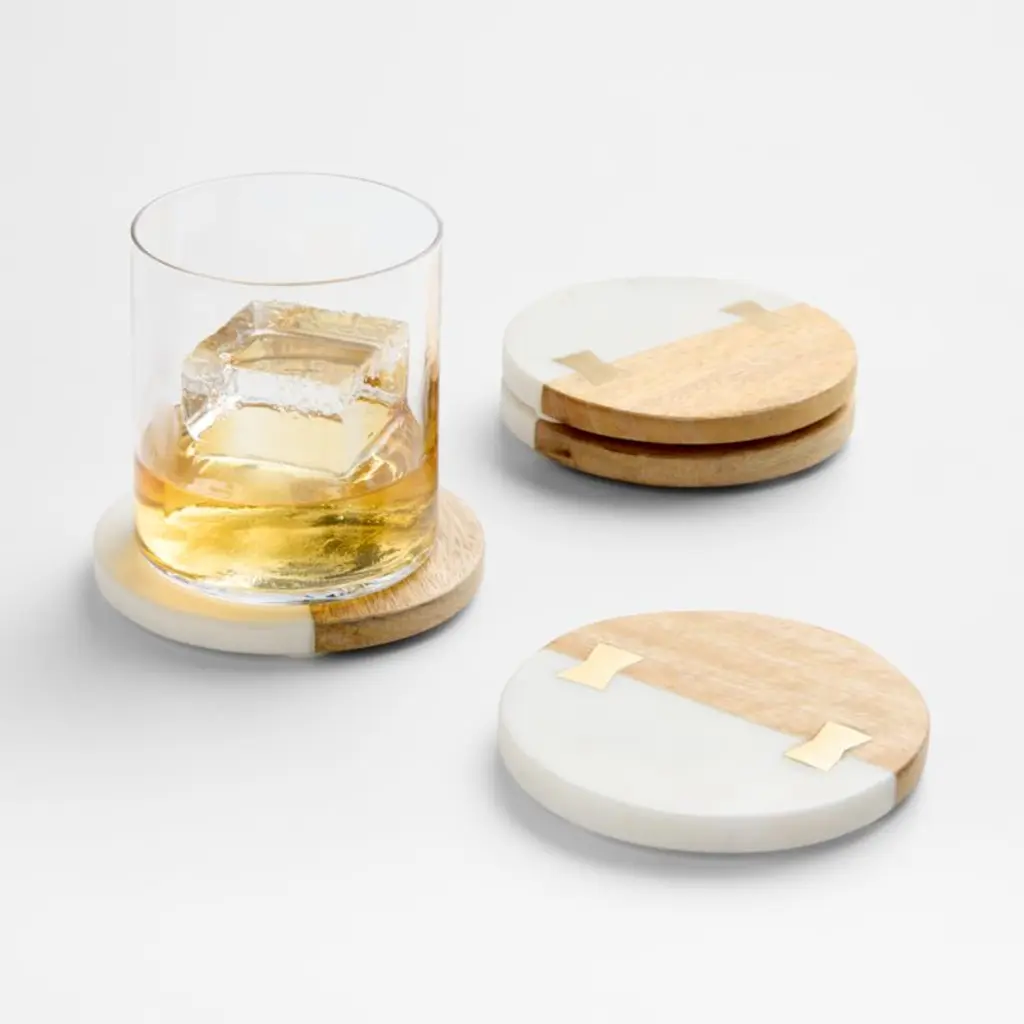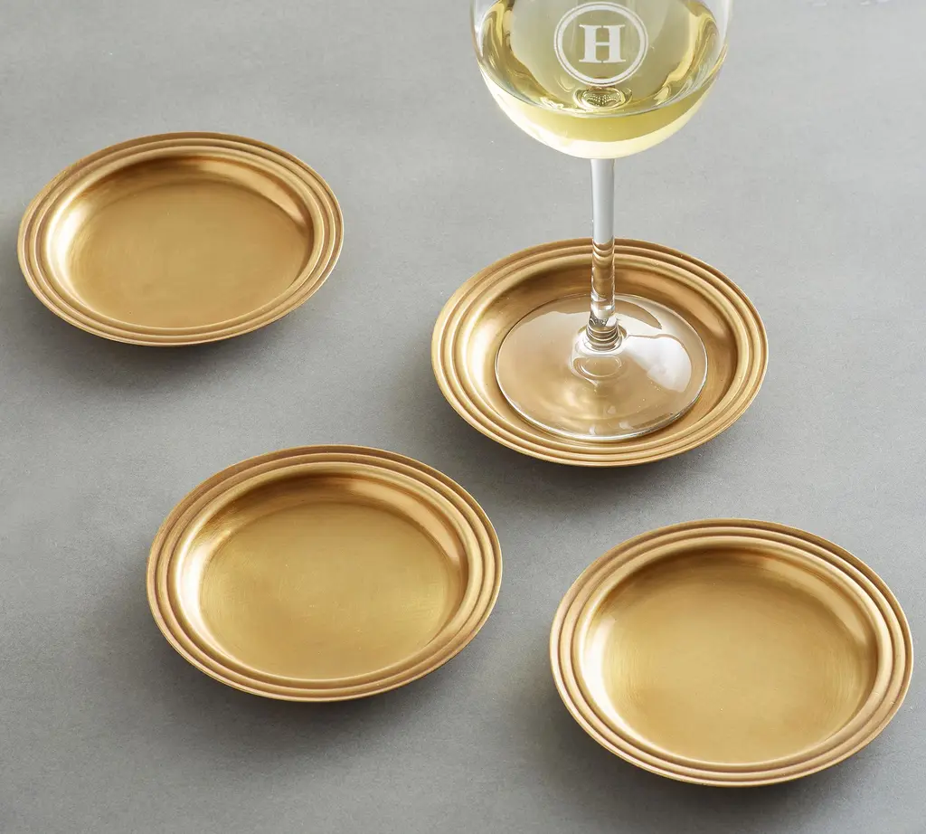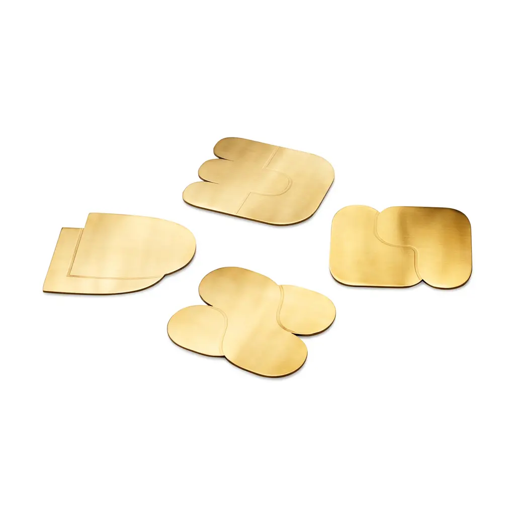 Designer Dan Covert conceived this set of Together Coasters composed of interlocked abstract shapes to signify connection and togetherness. Made from brass-plated stainless steel, their weightiness ensures that they will not stick when you and your guests pick up their glasses. The coasters are backed with cork to protect your surfaces. These designs are a chic conversation starter when everyone is together and objets d’art whenever you’re apart. Each coaster in this set of four is in a different shape and measures 3.5l x 4”w.
