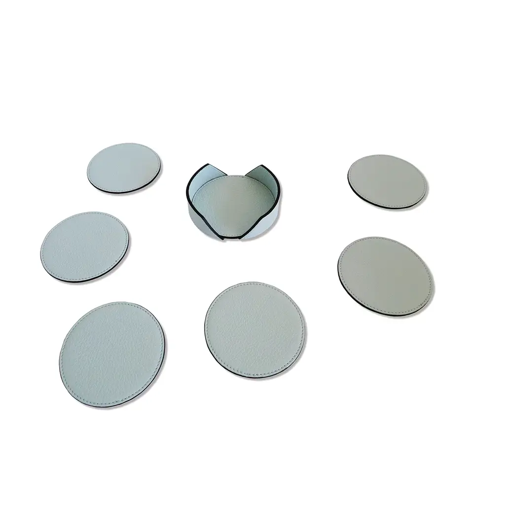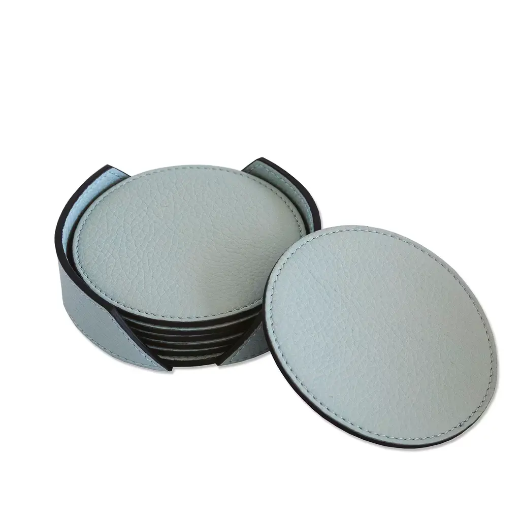 This stunning set of six coasters with a box is characterized by a mesmerizing and utterly stylish light blue shade, which will effortlessly decorate modern and contemporary decors. Handcrafted of fine and soft genuine full-grain leather enhanced with tone-on-tone stitching. Available in 14 colors, please check the Artemest catalog for details.
