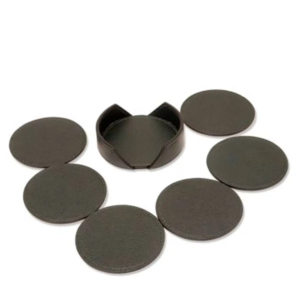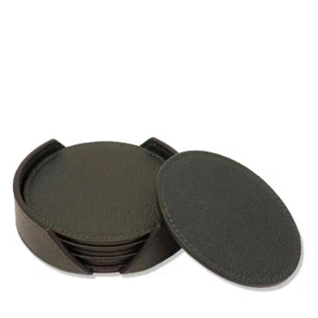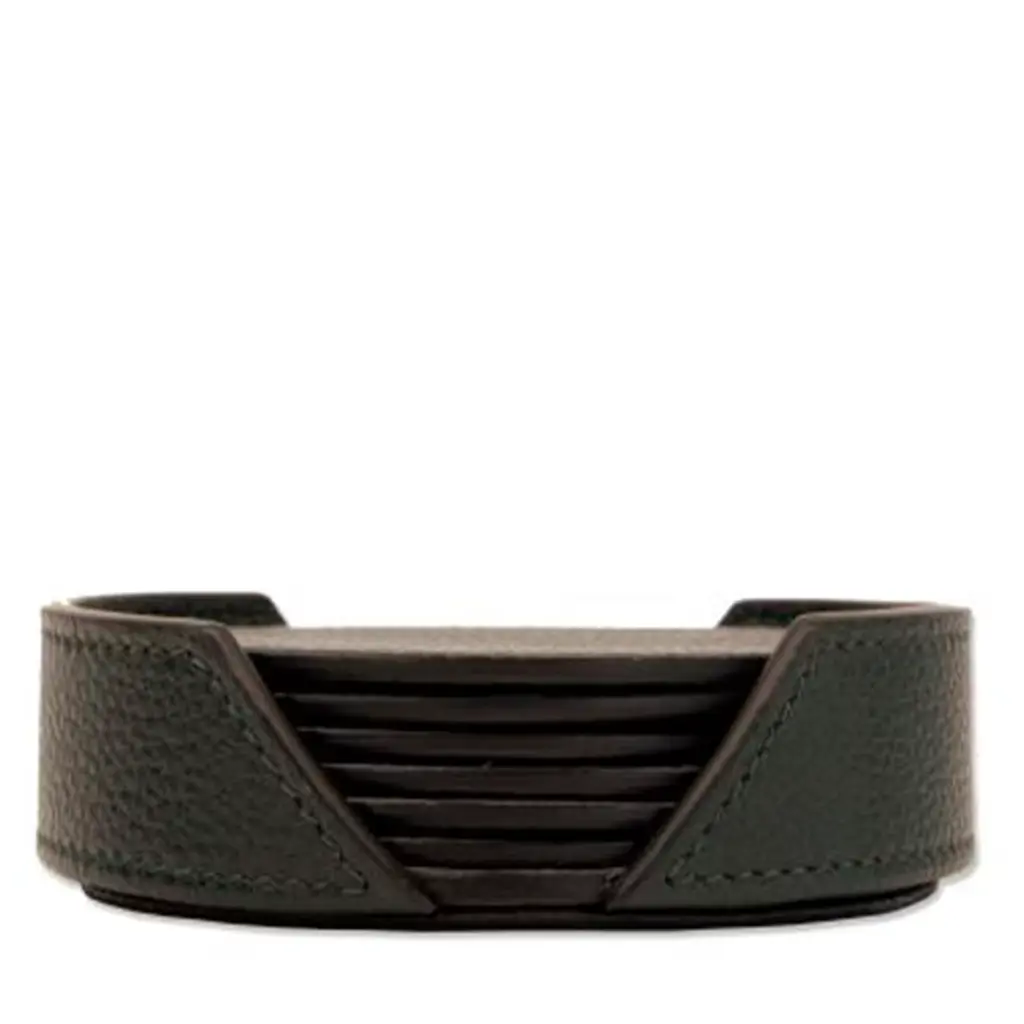 A timeless and versatile addition to a modern tableware collection, this exquisite set of six coasters with their holder flaunts clean and sophisticated lines. Entirely handcrafted of soft genuine grain leather in a green hue, each piece is marked by a round shape that perfectly fits the round-shaped holder (storage). This set is available in 14 different colors, please contact the Concierge for options.