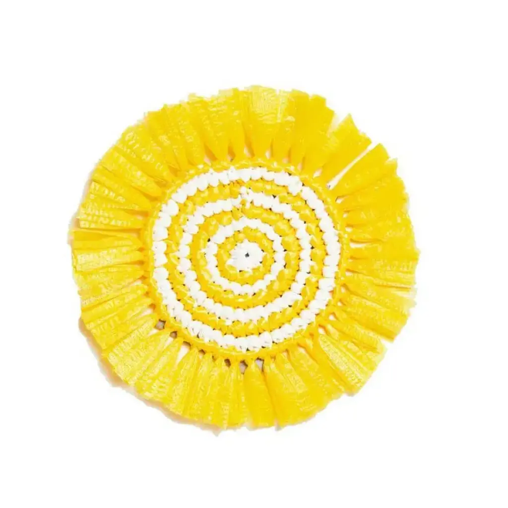 Eye-catching colors, the power of a bold stripe, and the fun of fringe all combine to create these cheery coasters hand-woven from recycled plastic twine. These unique coasters look stunning paired with colorful cocktails. Enjoy with coordinating Woven Fringe Placemats or have fun mixing and matching.