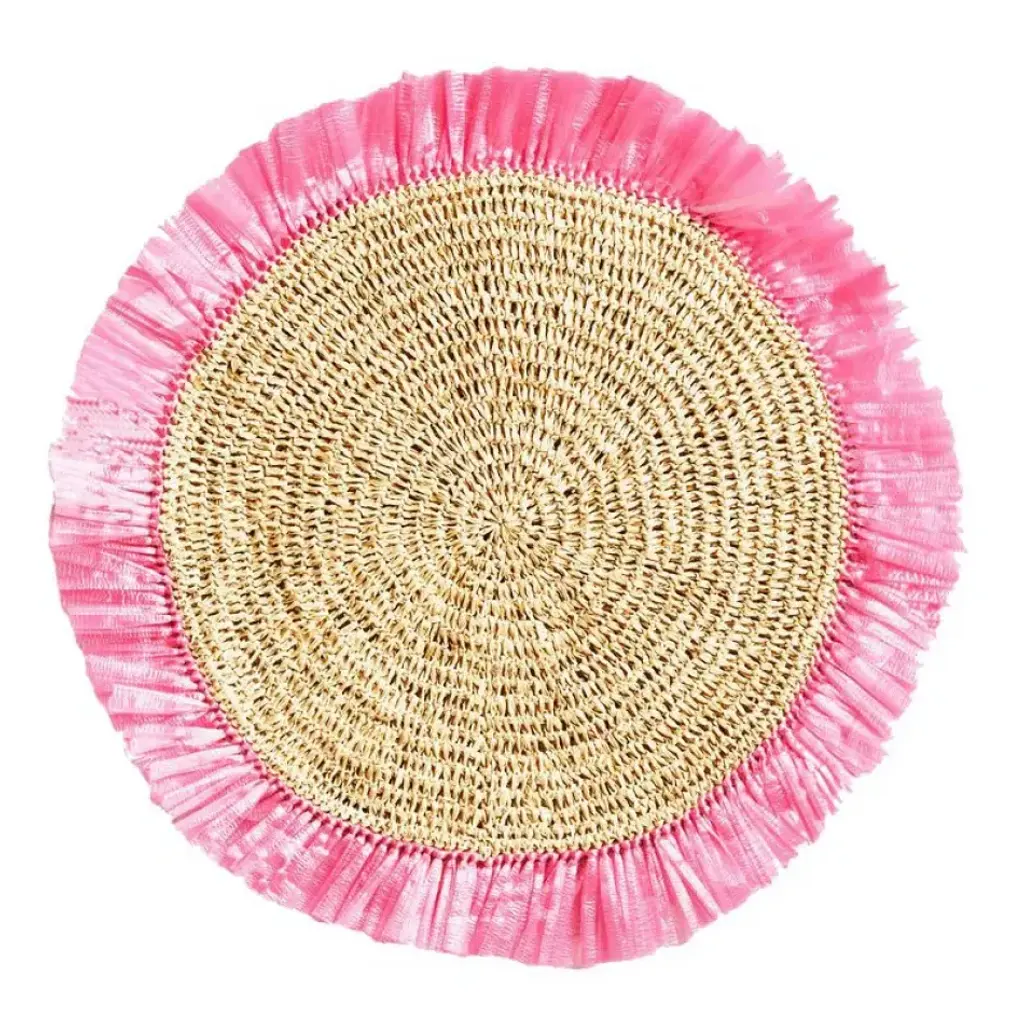 Woven Rattan Fringe Pink Rattan 5.5" Round Coasters, Set Of 4
