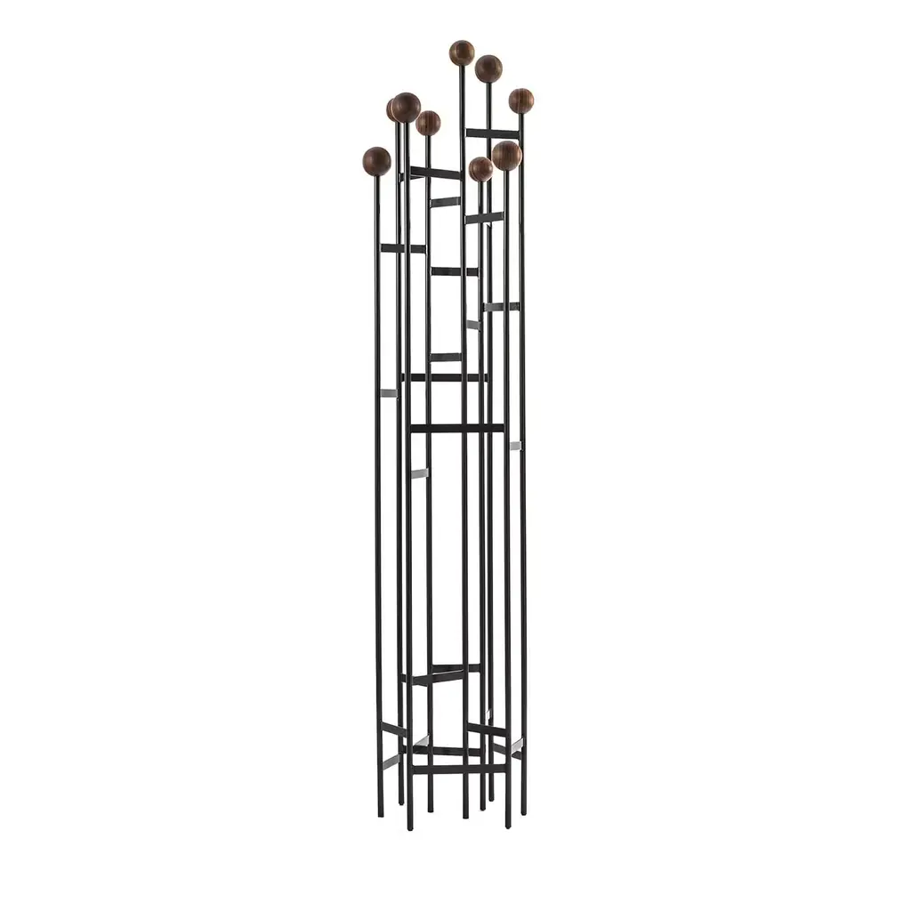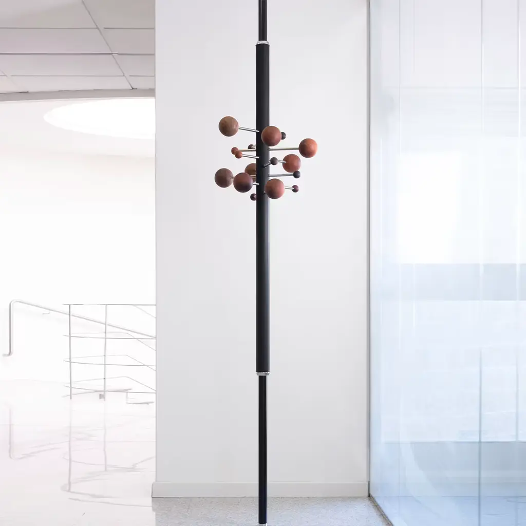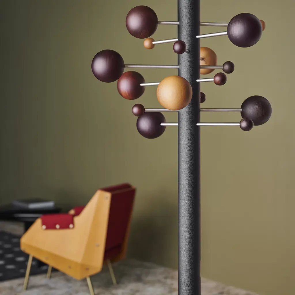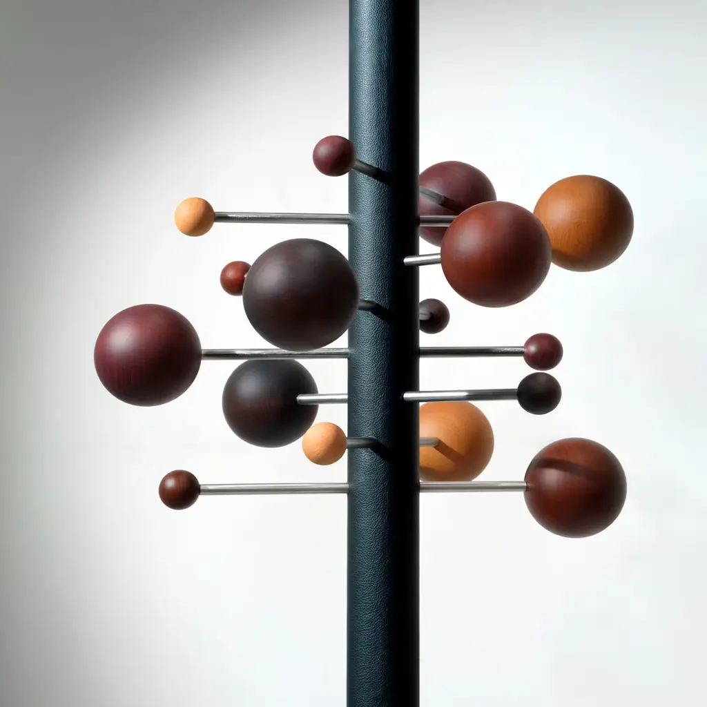 Part of "ABV Collection", this one-off coat rack, designed in 1961, recalls the solar system model and is a lovely homage to the grandeur of our universe - and our special place in it - whenever hanging a jacket or bag after a long day. Its slender silhouette consists of a rotating, black-painted aluminum column partially upholstered in leather from which extend eight arms. Each arm features a different-size globe in durmast (with different finishes) per extremity and can glide as if orbiting in space.