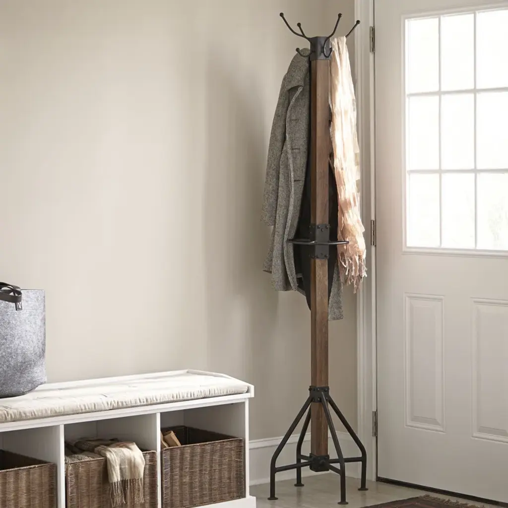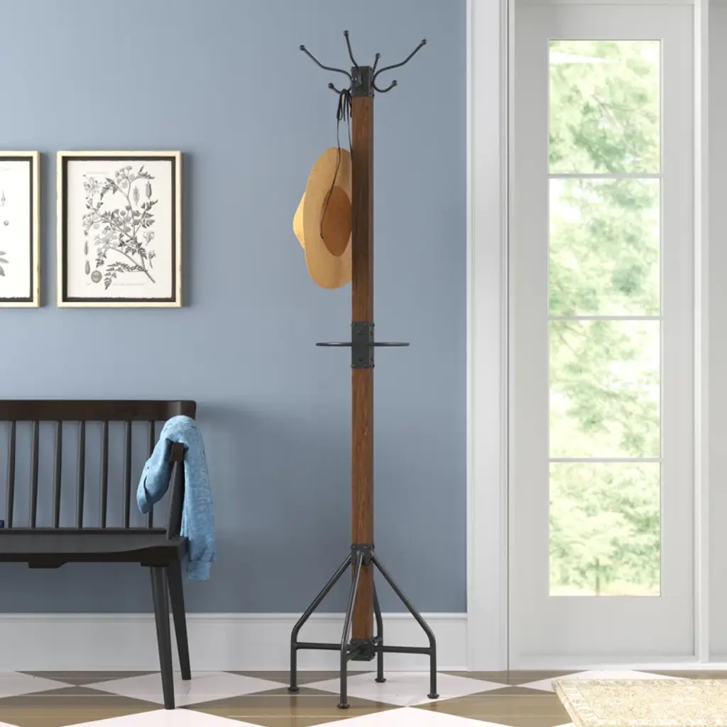 This coat rack is made from solid mango wood and iron, giving it a stylish mixed-material look that's sure to complement your entryway. The base is made from metal and supports the center wooden rod with a finish for a hint of rustic flair. A center ring gives you a spot to hang your umbrellas, while four C-shaped hooks can catch your coats, scarves, and hats. It measures 74" tall and 18" wide, so it won't take up too much room in your foyer or mudroom.