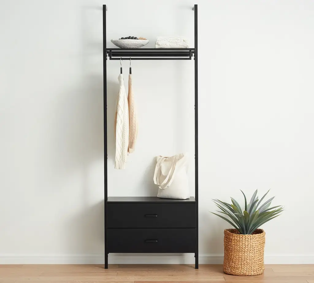 When your closet can’t handle it all, this clothing rack steps up. It looks great organizing coats by the door, or in the bath with towels and robes. Bolted detailing enhances the industrial style.