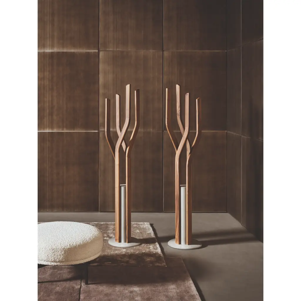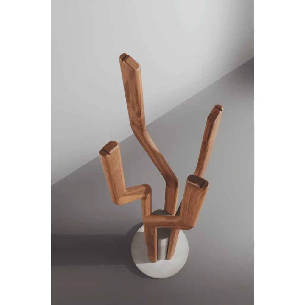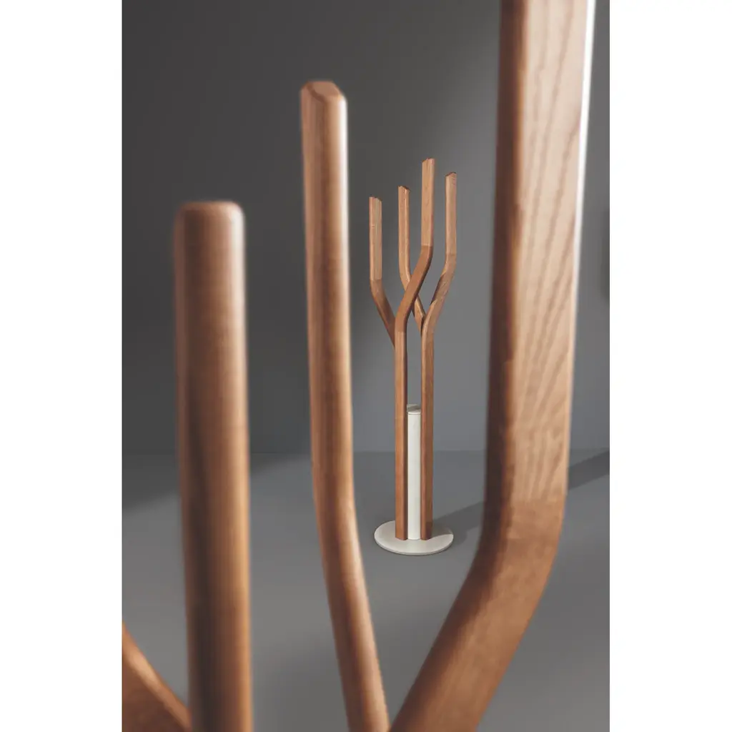 Alma is an elegant floor-mounted clothes hanger that draws inspiration from the fascinating world of plants, whose natural vitality it evokes through rigorous formal research. It consists of a concrete base on which the four solid wood stems with geometric profiles stand in contrast and which come in different heights. Thanks to the different orientations and sinuous lines, a highly dynamic spiral effect is created, in which the concrete base acts as a pivot. Alma is an accessory with a sophisticated and elegant personality that becomes a totemic presence, ideal for “enlivening" both residential environments and accommodation facilities.