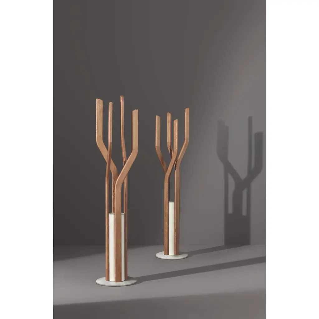 Alma is an elegant floor-mounted clothes hanger that draws inspiration from the fascinating world of plants, whose natural vitality it evokes through rigorous formal research. It consists of a concrete base on which the four solid wood stems with geometric profiles stand in contrast and which come in different heights. Thanks to the different orientations and sinuous lines, a highly dynamic spiral effect is created, in which the concrete base acts as a pivot. Alma is an accessory with a sophisticated and elegant personality that becomes a totemic presence, ideal for “enlivening" both residential environments and accommodation facilities.