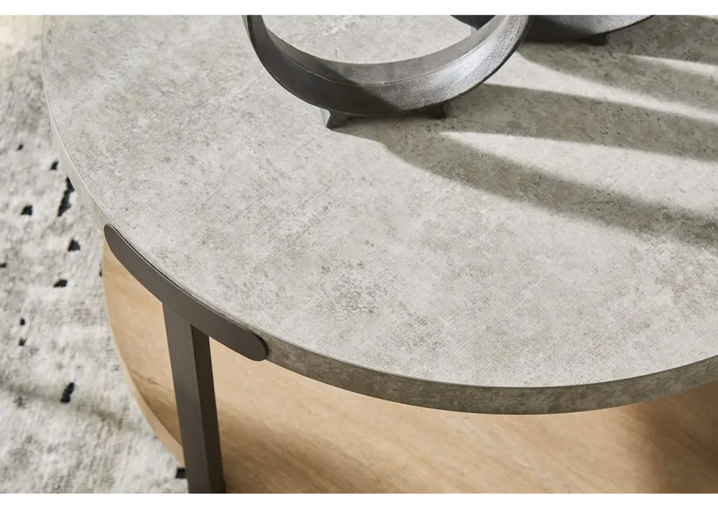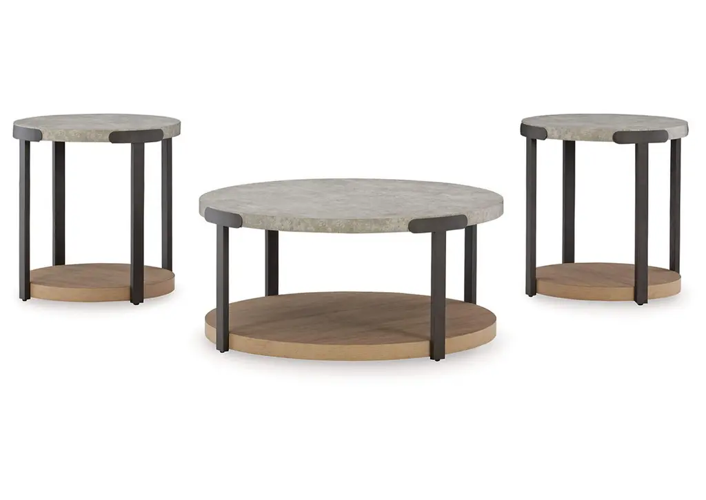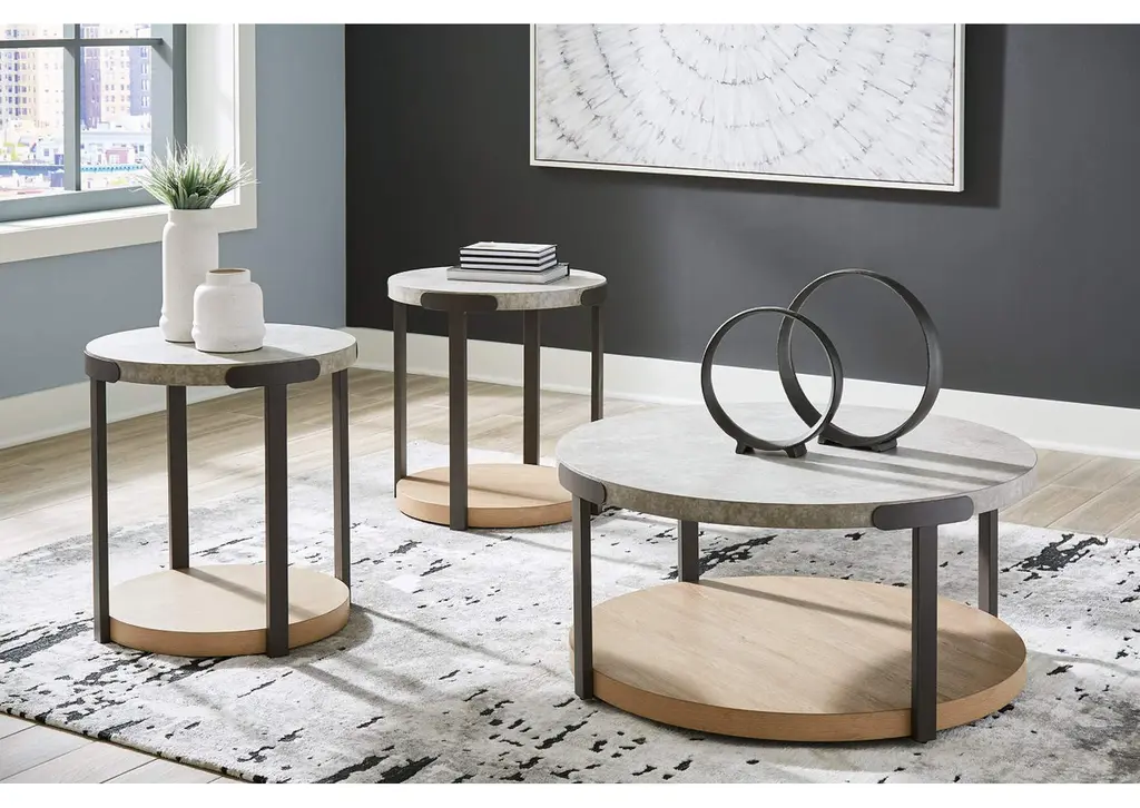 A living room essential, occasional tables are perfect for keeping your snacks close and design books displayed. So why settle for a traditional design when you can mix it up a little? The Darthurst table set showcases a clean-lined round silhouette, founded atop an open shelf base with a light natural oak wood grain look. The thick tabletop adds modern appeal—perfect for placing in contemporary surroundings. Weight 109.000 lbs. (49.05kgs.)
