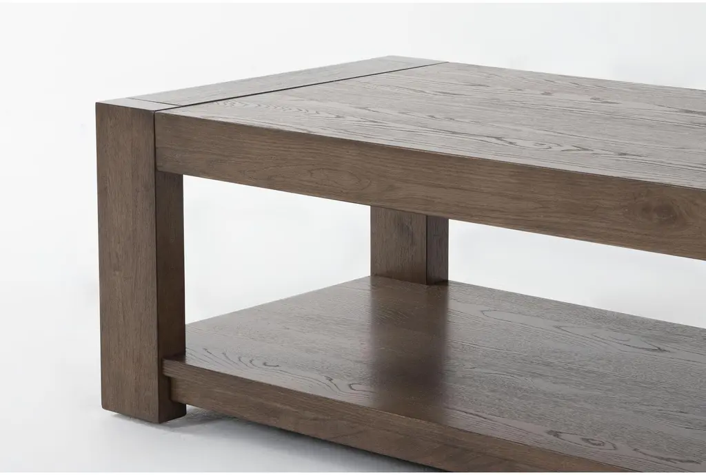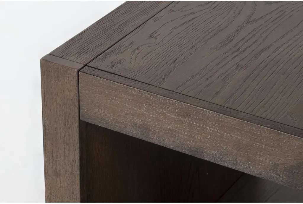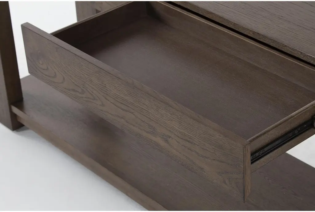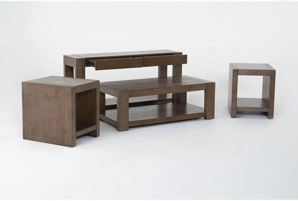Elevate your living room with the Voyage Brown Wood 4 Piece Coffee Table Set with End + Console by Nate Berkus + Jeremiah Brent. This modern set, finished in a rich new brown, includes a rectangle-shaped coffee table, console, and end tables. Crafted from cathedral oak veneers and solid hardwood, it offers both durability and style.
