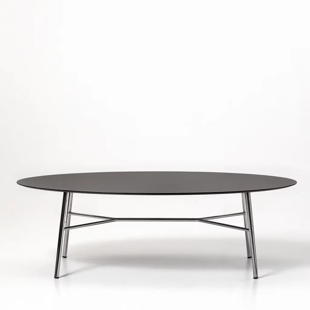 This oval coffee table allows for enjoying the simple pleasure of a tea or coffee break with effortless elegance. The black HPL top rests on a glaring chromed base comprised of tubular legs connect by means of a branched, matching element. Please refer to the Concierge for inquiries on available finishing options and top variants.