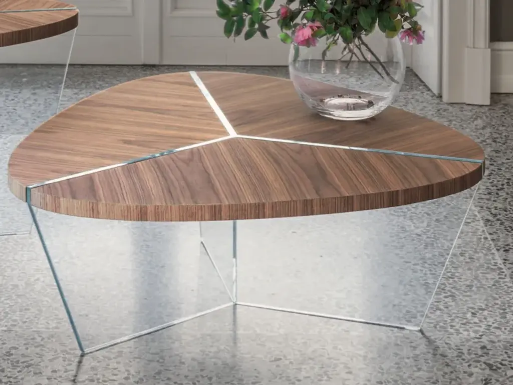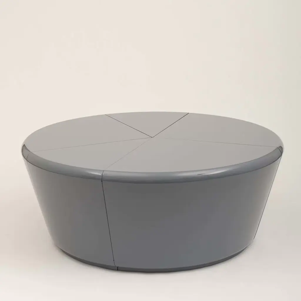 This original coffee table designed by Davide Rizzo in collaboration with AVD is a versatile and glamorous piece of functional decor whose minimal and modern design will suit a contemporary interior. When assembled, the wooded frame creates a drum-like round shape with tapered sides. Covered entirely in gray polyester with a glossy lacquered finish, this table features detachable wedges with a brushed copper interior lining that provides a color and textural contrast of great visual effect. The pieces can be set individually to bookend a sofa or distributed in the room to create a cohesive style.