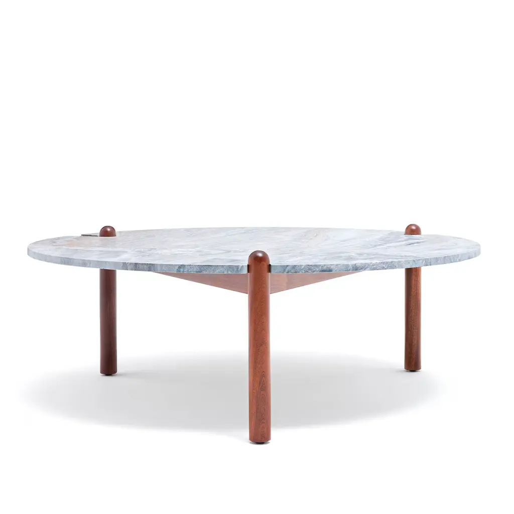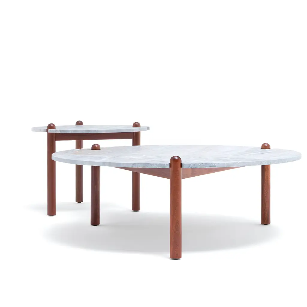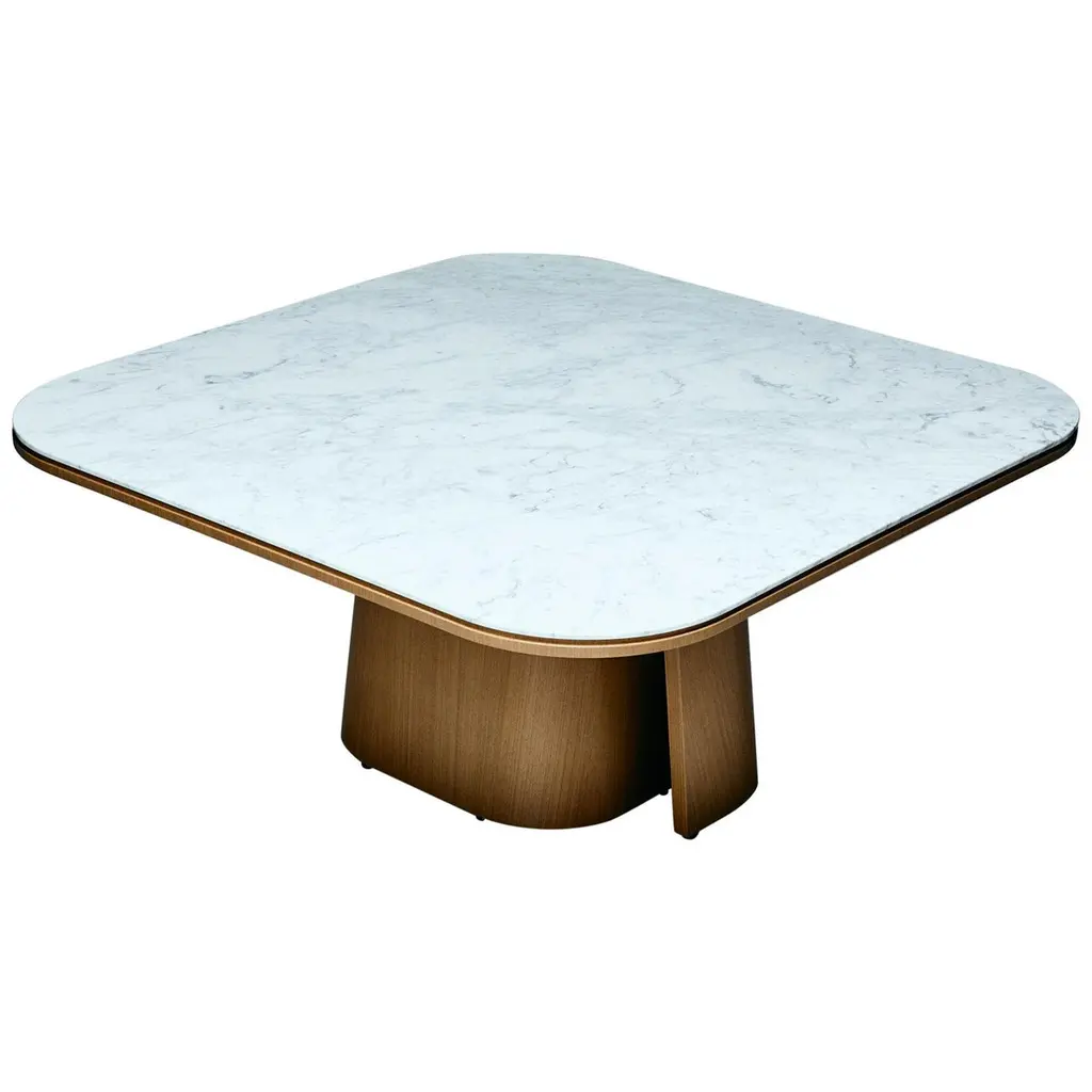 A celebration of wood and marble in a precious design of first-rate quality, this coffee table belongs to the 10th Caprarara series designed by Massimo Castagna. Characterized by an asymmetrical cut of round white marble top adding dynamism to the piece, the fascinating structure is fashioned of mahogany wood. Entirely customizable. A night cover is recommended to protect the item if placed outdoors, please ask the Concierge for pricing details. If the products are placed completely outside, nightcovers that can be purchased at an extra price are recommended. Please contact the Concierge for further information and options.