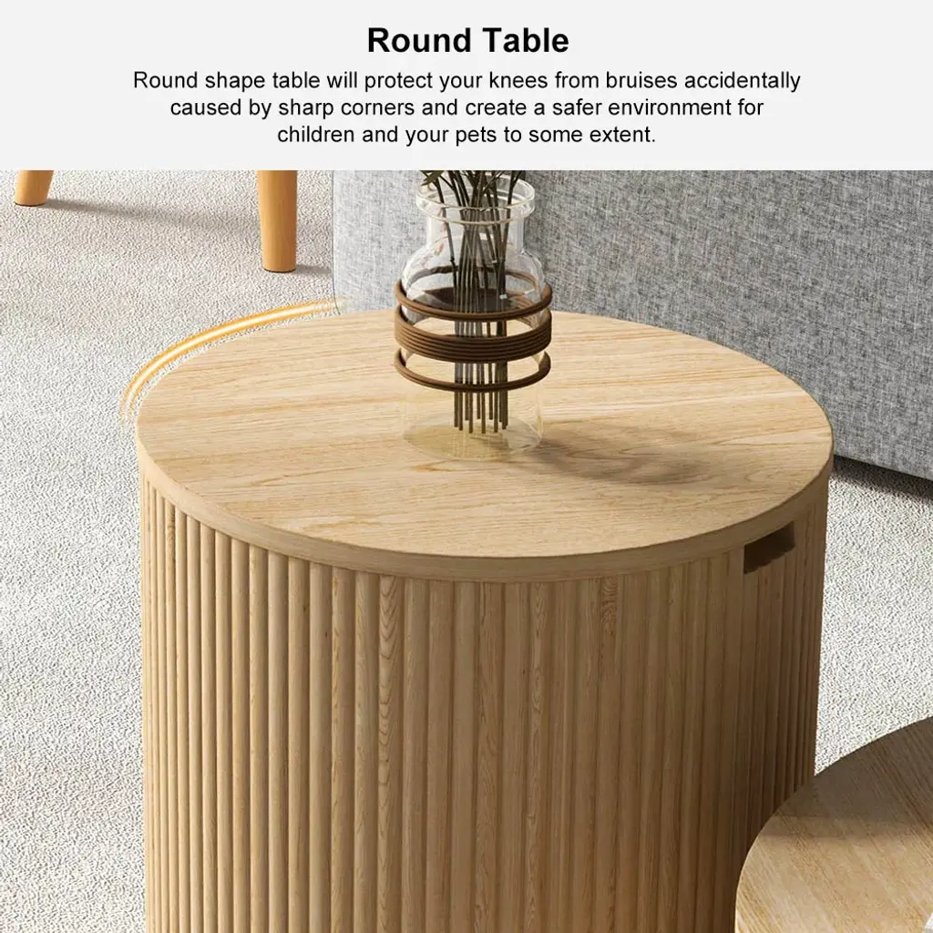 16" Round Natural Wood Fluted Coffee Table With Storage