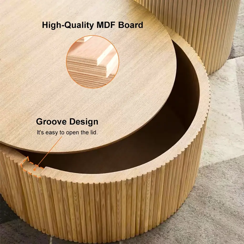 Add warmth and functionality to your living room with this modern round coffee table Crafted from premium board, it features hidden storage, perfect for organizing essentials The sleek, versatile design complements a variety of interior styles effortlessly