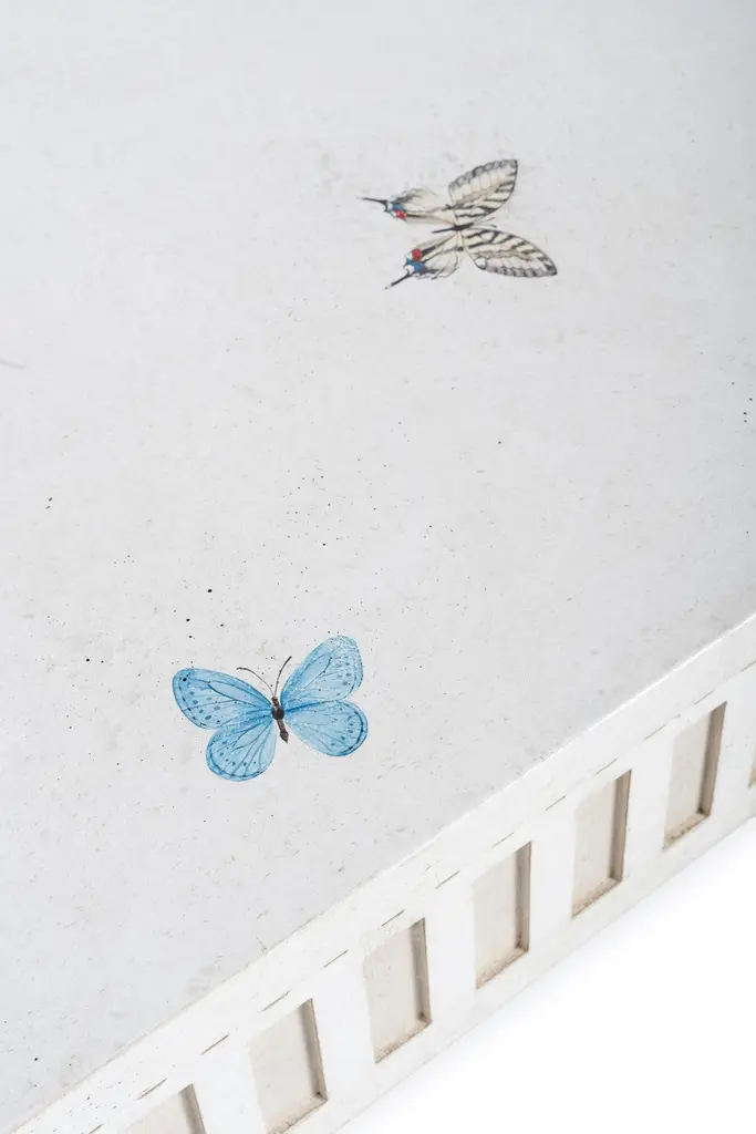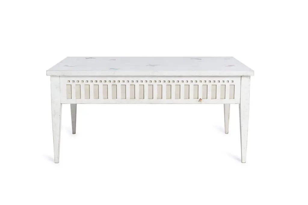 From our Hand-Painted Furniture Collection, we are pleased to introduce you to our Chalky White Arena Coffee Table with carved apron and butterflies. In a refined solid wood structure, this beautiful coffe table becomes a canvas in the hands of our artists, who hand-painted it with a colorful kaleidoscope of butterflies, flying freely on every side of the piece. Each Piece from our Collections is entirely hand-painted on every side of the Furniture by using the very best 18th Century Craftsmanship Venetian Techniques. Colors, decors and size can be customised at requested.