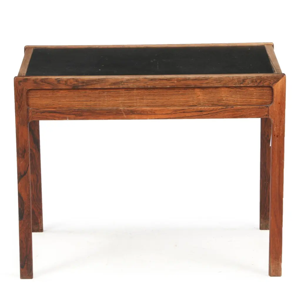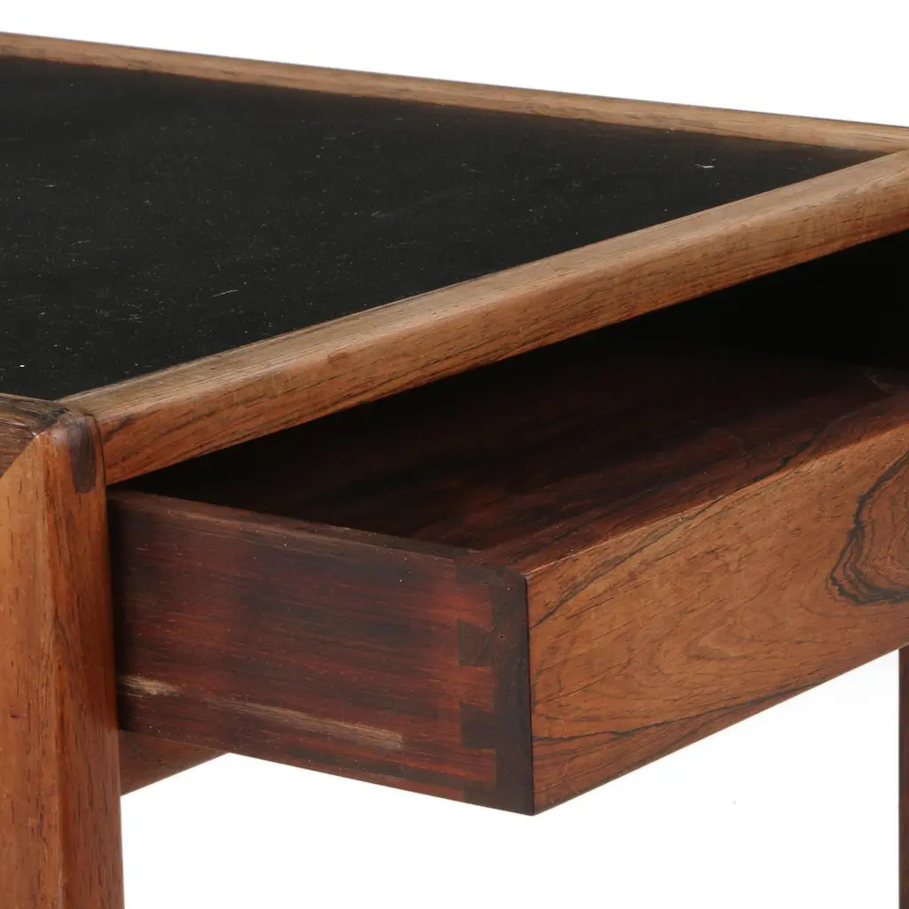 1960s Helge Vestergaard Jensen Solid Wood Coffee Table, side with drawer and table top with black formica. Manufactured by cabinetmaker Jason Mogler. H. 54. W. 44. L. 70 cm. 2 Available. Literature: Mobilia nr. 133, 1966.Restoration and Re-polishing included in price, although pictures may show condition prior to this.