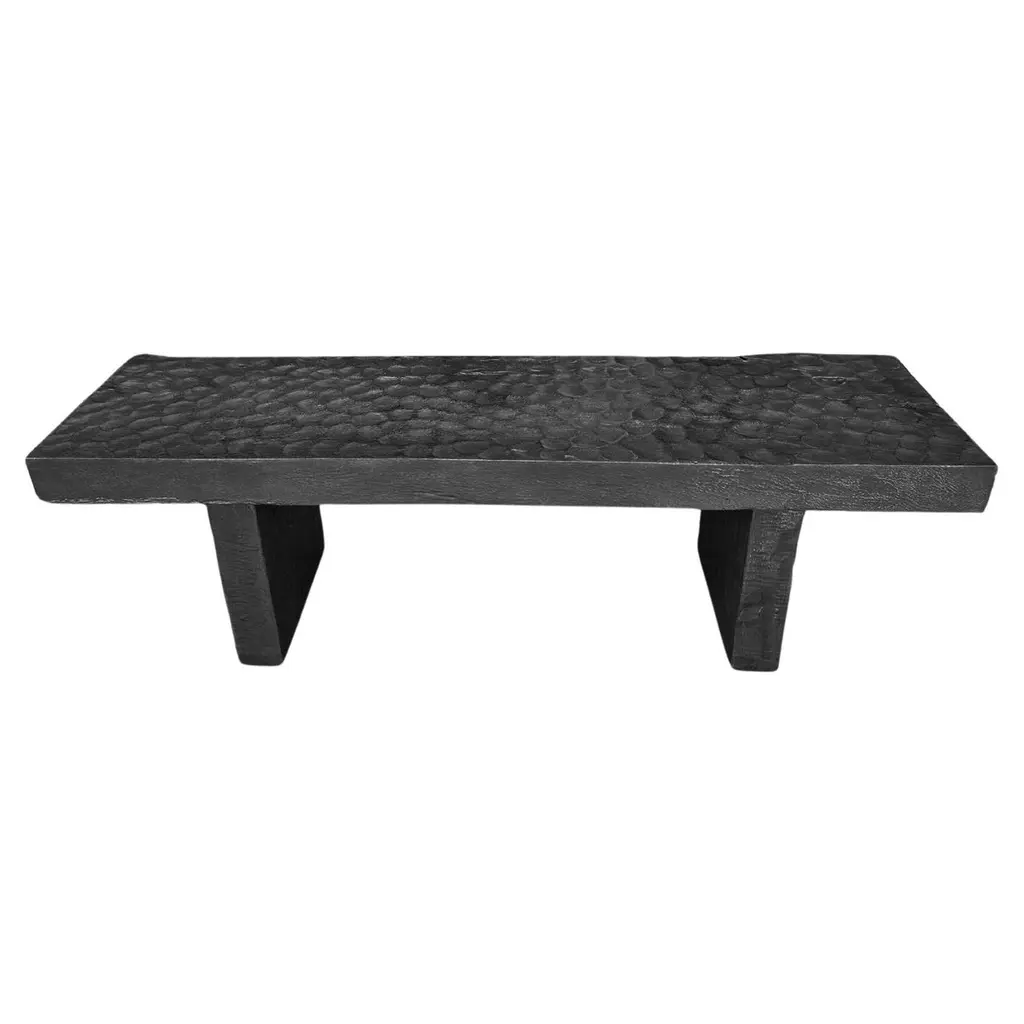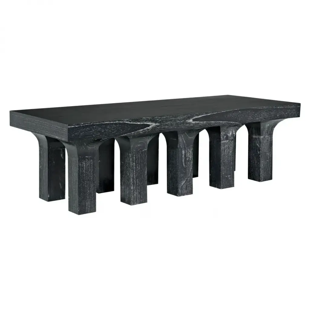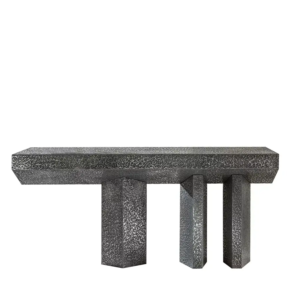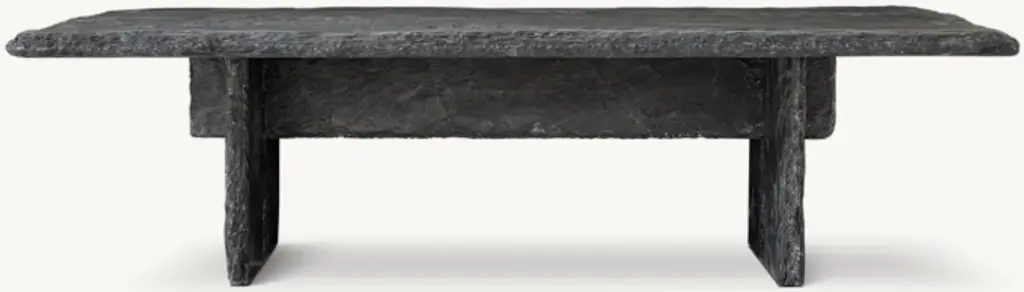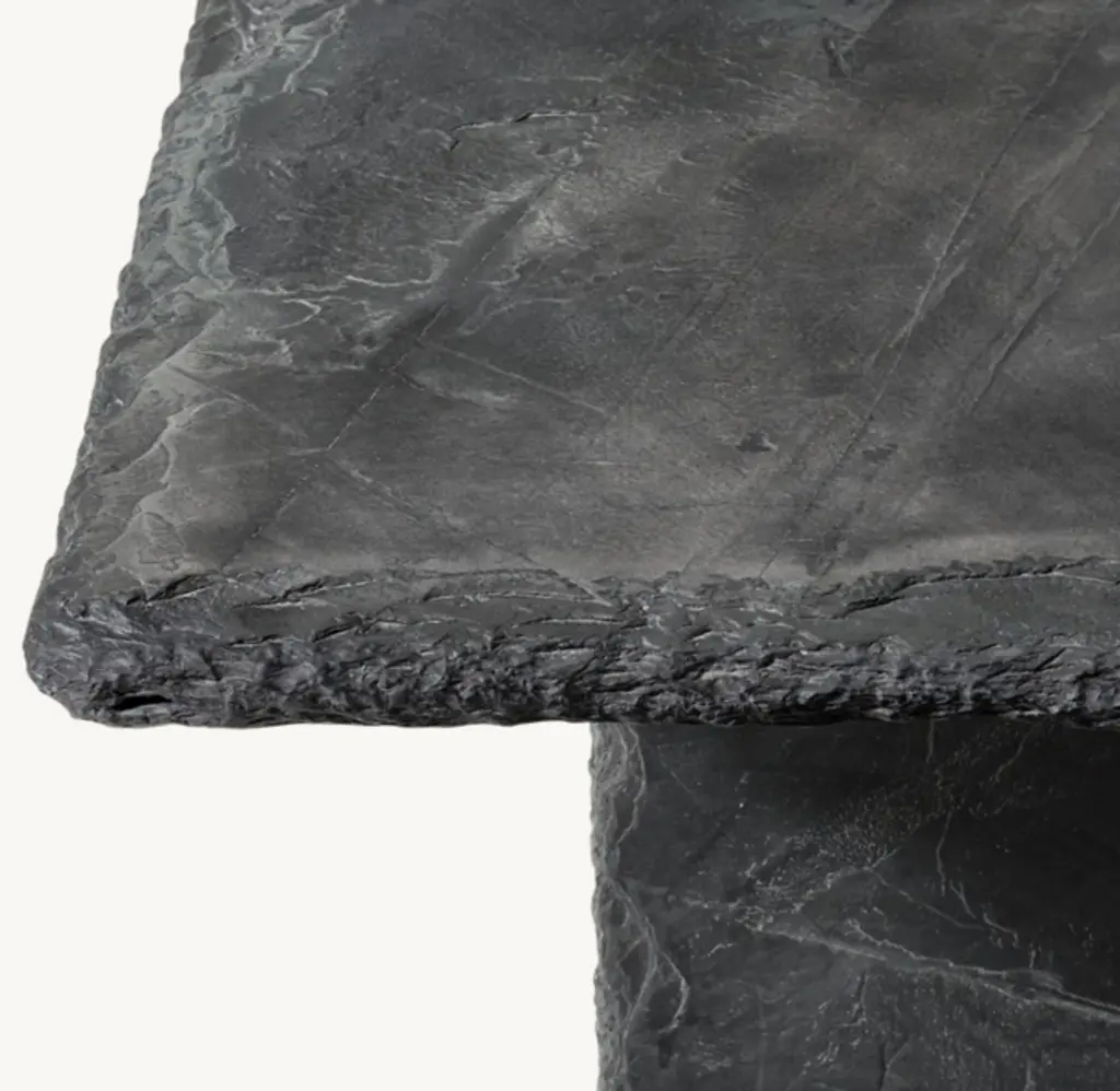 Majestic in scale and monolithic in presence, this collection illustrates the enduring beauty of black slate. A massive stone slab is cantilevered atop the sculptural base, its chiseled edges a counterpoint to the table's smooth planes and sleek lines.