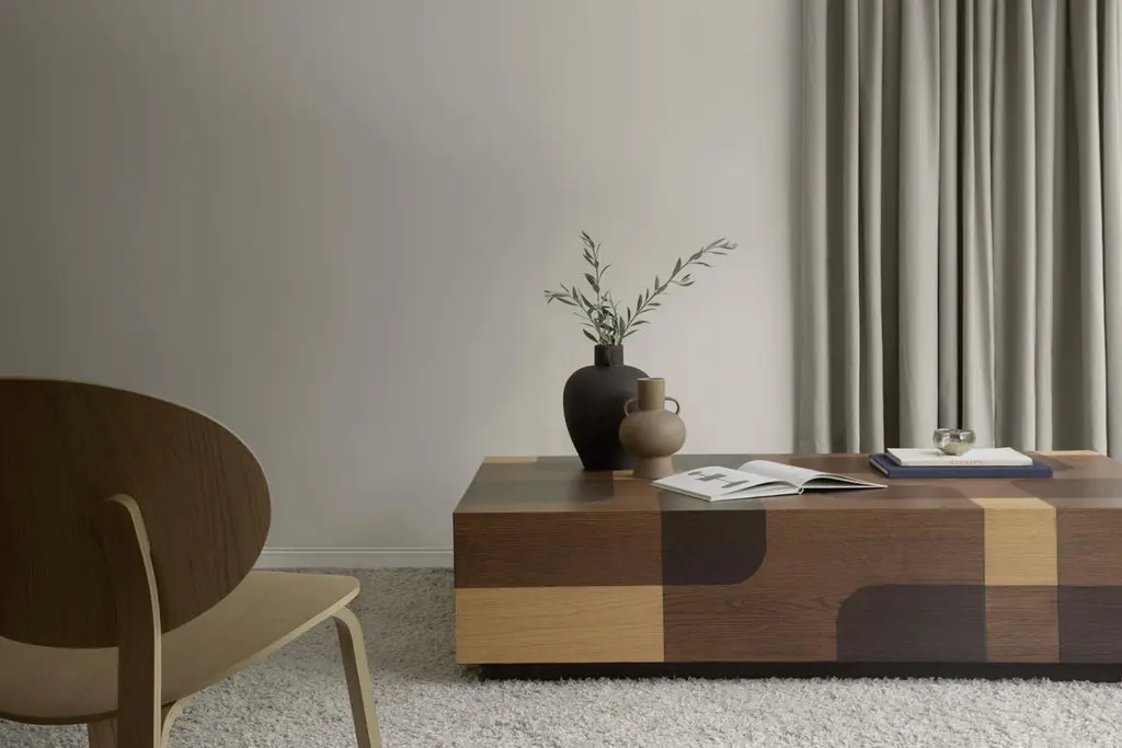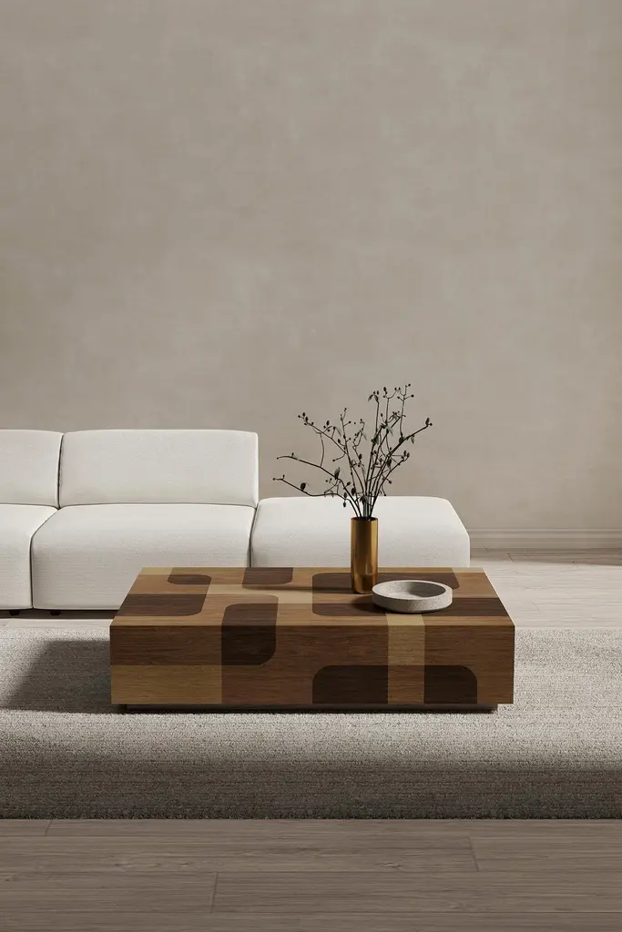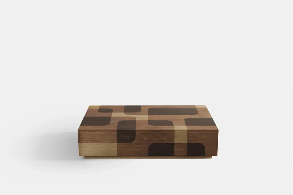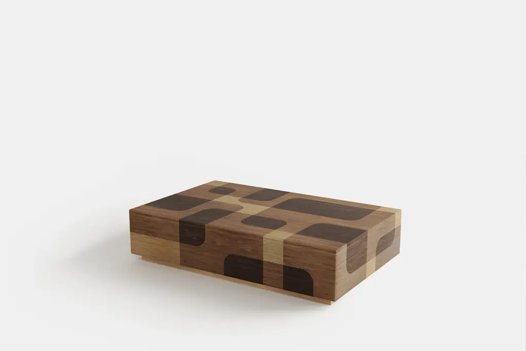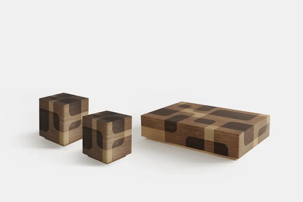Set of Two Bodega Side Tables and One Rectangular Coffee Table in Warm Wood Marquetry by Joel EscalonaBodega Collection refers to cellar art or better known as chiaroscuro, a technique of extreme contrast of light and shadow used by Caravaggio.Designed by Joel Escalona, manufactured in particle board and wood veneer in natural tones or grayscale tones. Finished in semi-gloss lacquer. ——NONO is a Mexican design brand with more than 10 years of experience dedicated to the production of interior furnishings, editions, and custom-made projects. At NONO, we create pieces of extraordinary beauty, accommodating the particular needs and tastes of each client with exclusive high-quality designs.—Joel Escalona is a Mexican designer, difficult to define with a single word. His constant search for clarity, integrity and harmony led to his development as a designer with an obvious inclination towards visual arts, such as painting and sculpture. Joel’s work is characterized by thorough and elegant processes, sometimes creative, other times productive and on occasion, a bit introspective. In his work, it is possible to find glimpses of his charismatic and ironic personality, resorting to elements such as lyric, humor and poetry as attributes that are in constant connection throughout his body of work.————Some details to consider when placing an order with us:• Catalog images are digitally generated. Actual products may slightly vary in texture, grain, and final finish due to natural material differences. Despite these variations, our expertise ensures each piece maintains high quality and matches the intended design.• All of our products are made to order, and the lead time for standard products is estimated to be 9 to 12 weeks, plus shipping time. However, special pieces or sculptures may require a longer lead time.• We offer customization in dimensions and finish for all of our furniture pieces, which may result in additional charges.• We only facilitate freight services by a third party. The client is solely responsible for any associated import/export taxes, as well as any necessary customs paperwork.• We are not responsible for any damages that may occur during shipping or for any customs-related delays.