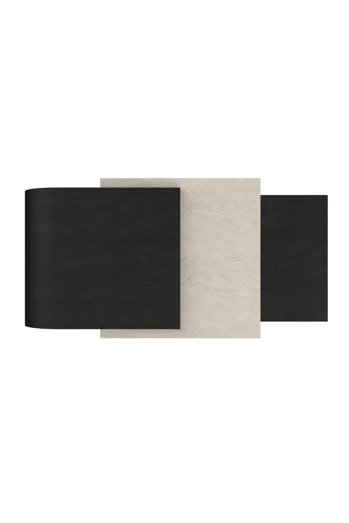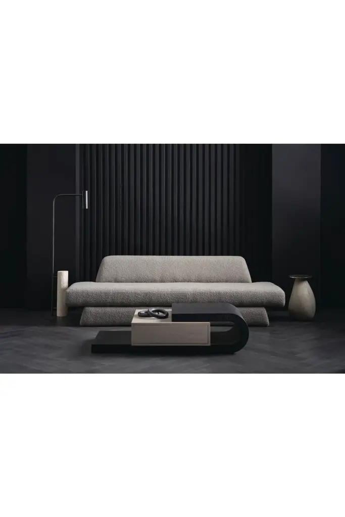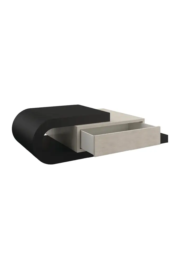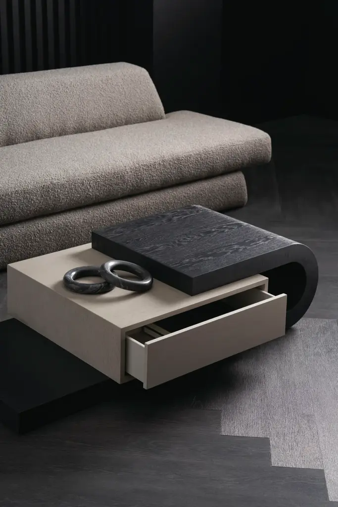 A dark wood, curved coffee table in a Basalt finish, envelopes a smaller square fossil table as a striking centerpiece. Complete with two drawers on either side of the square table as a stylish storage solution.