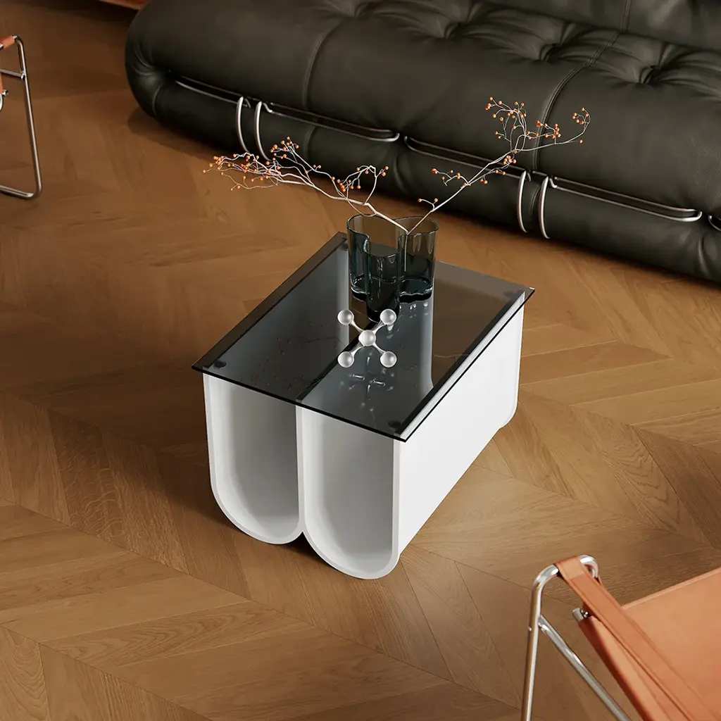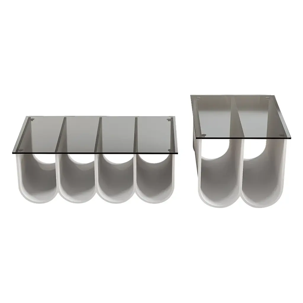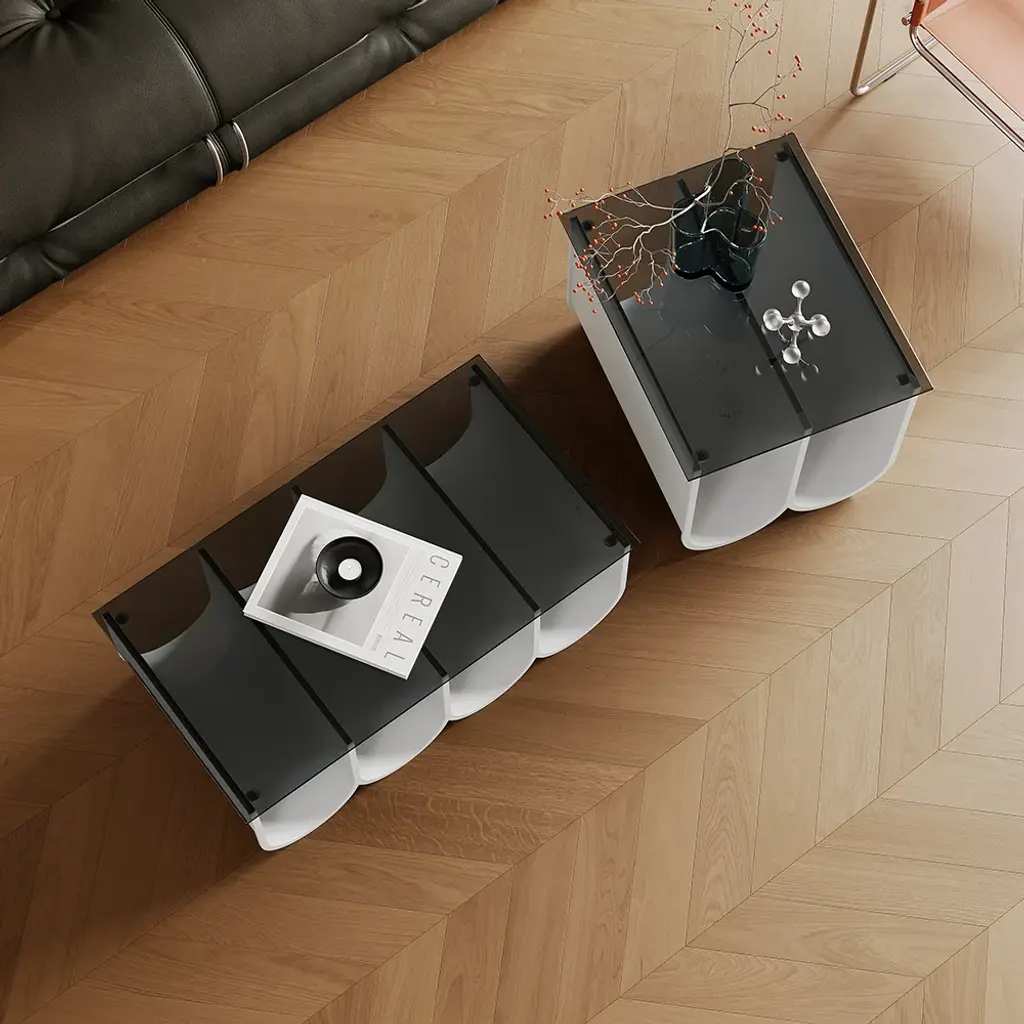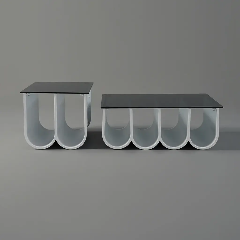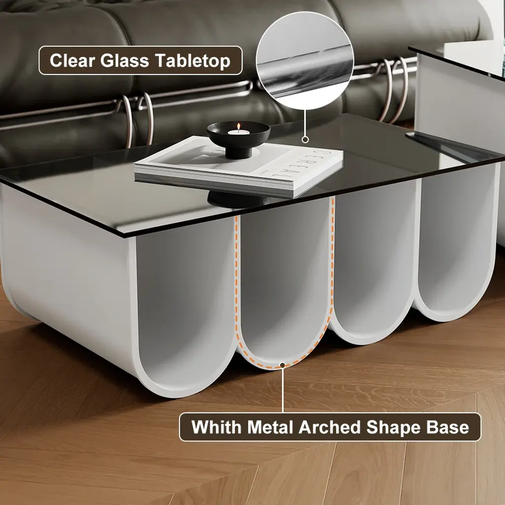 2-Piece Square Coffee Table Set With Black Clear Glass Tabletop & White Metal Arch Base