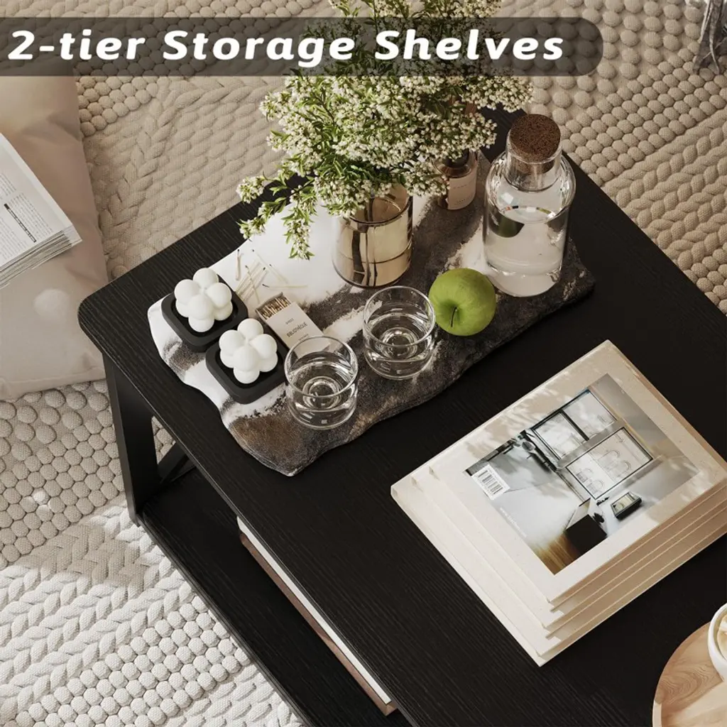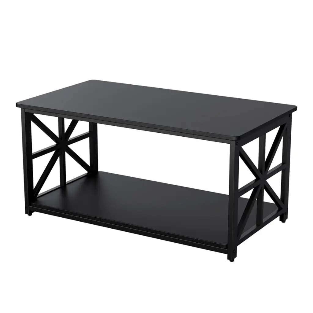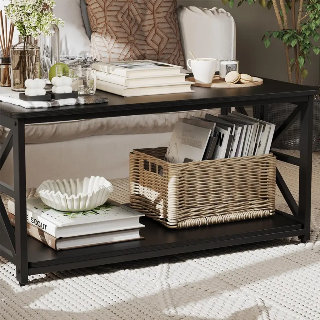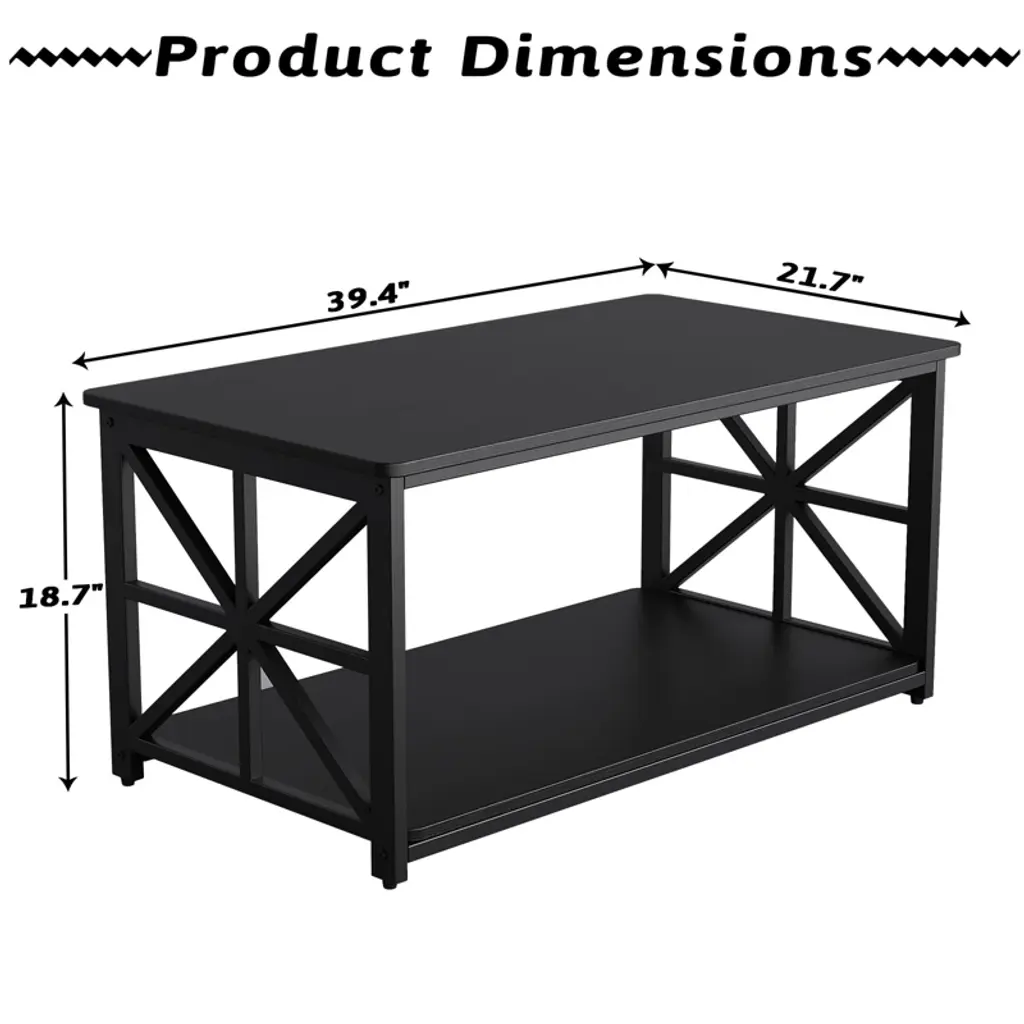 2 Tier Coffee Table for Living Room with Round Corner, Modern Farmhouse Center Table Easy to Assemble, 39" Rectangle Side, Industrial Tea Table with 2-Tier Storage Shelf for Living Room