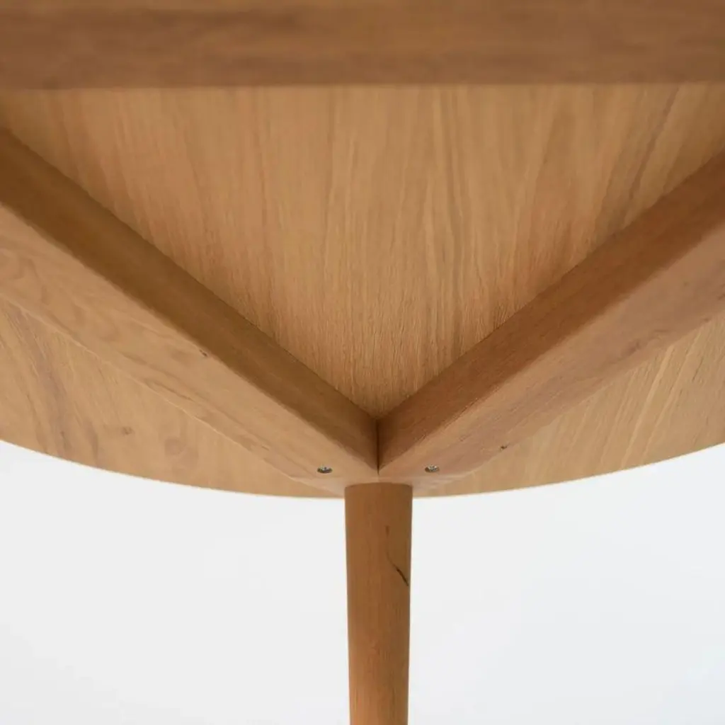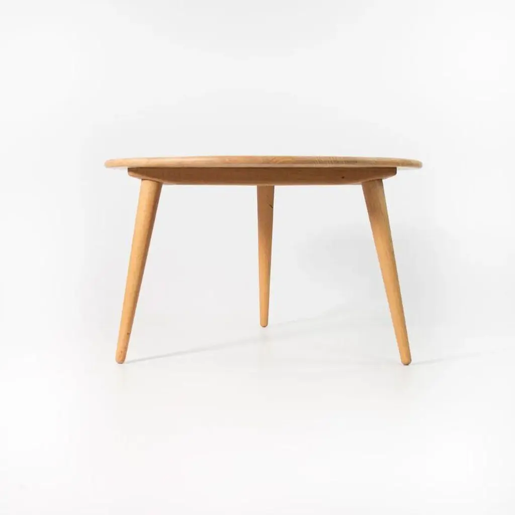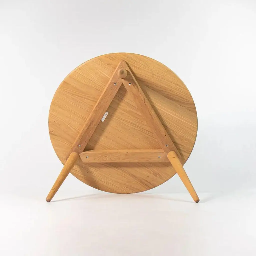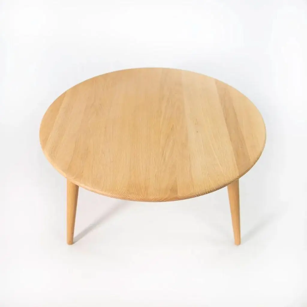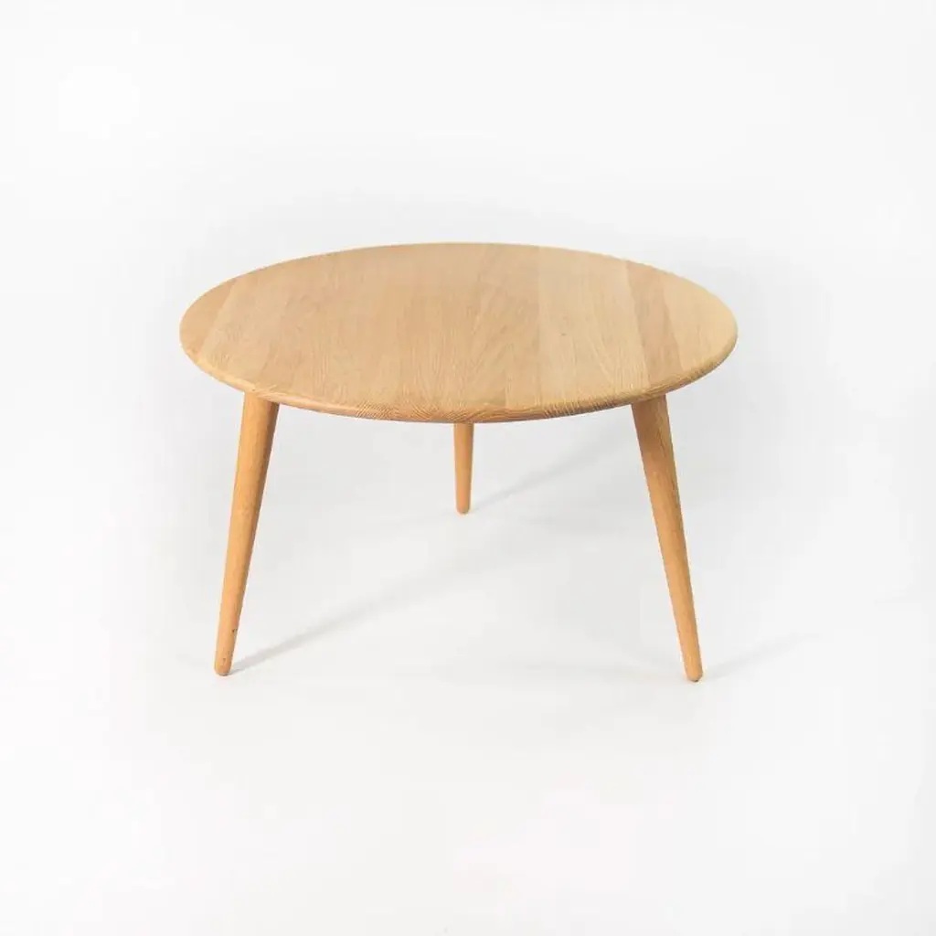 This is a single 2010s production CH008 Coffee Table designed by Hans Wegner and produced by Carl Hansen in Denmark. It appears to be the lacquered finish over oak. This example measures 34.7 inches in diameter with a height of 20.5 inches. Multiple tables are available. The price listed is for each table.