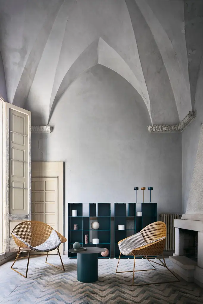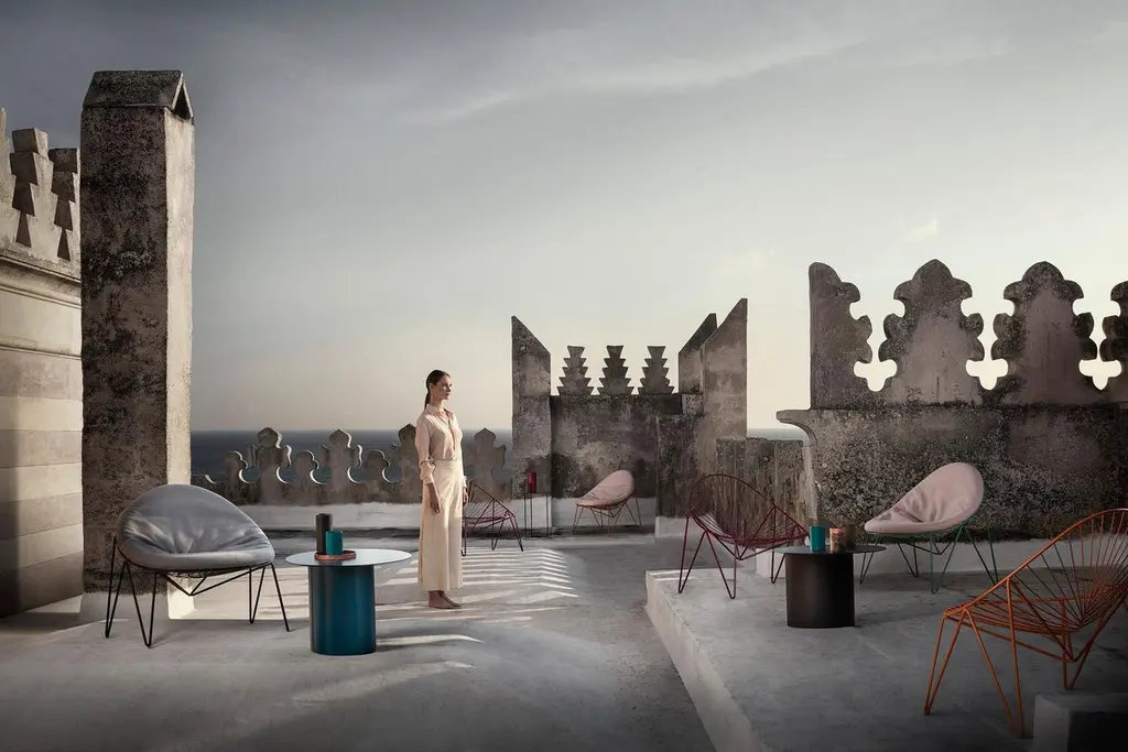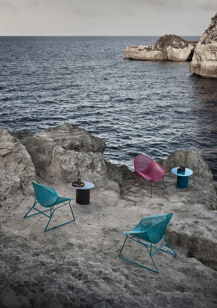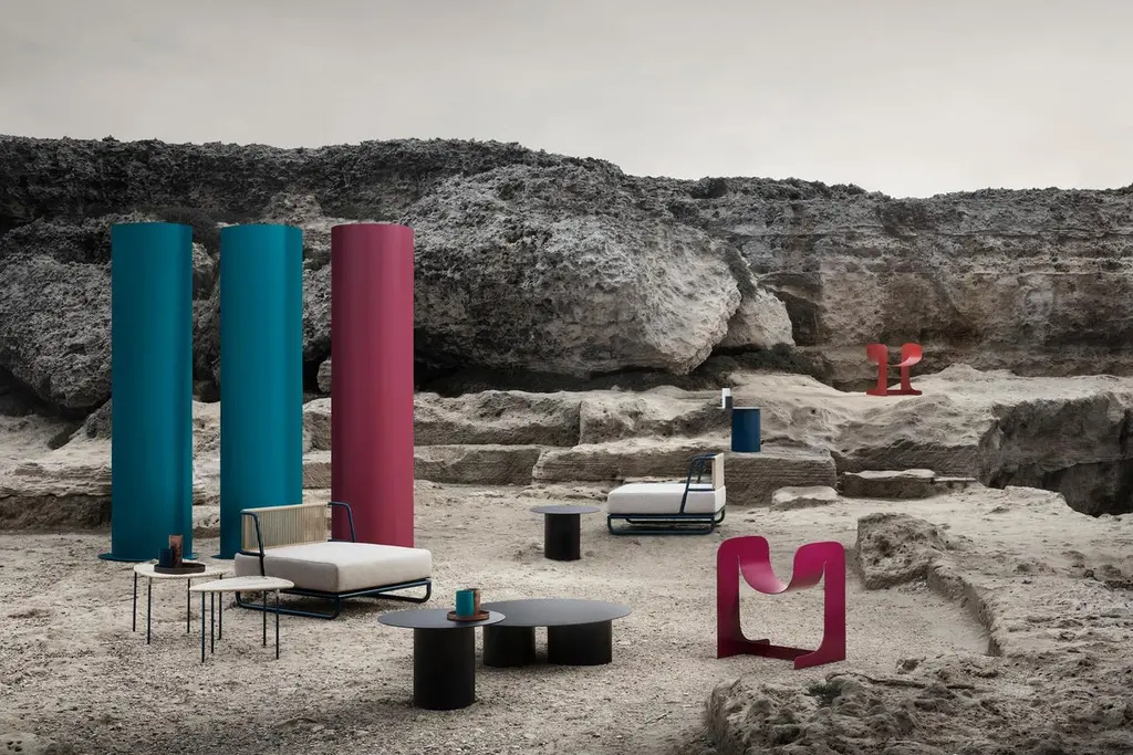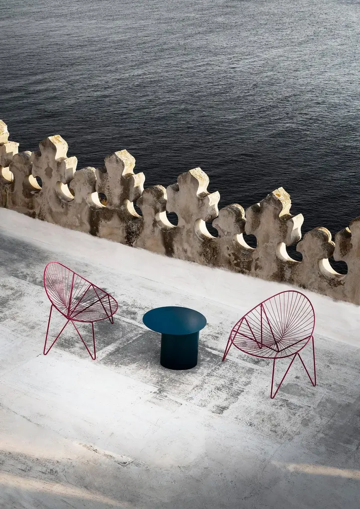Indoor-outdoor coffee table, elongated and curved cylindrical base, steel top.