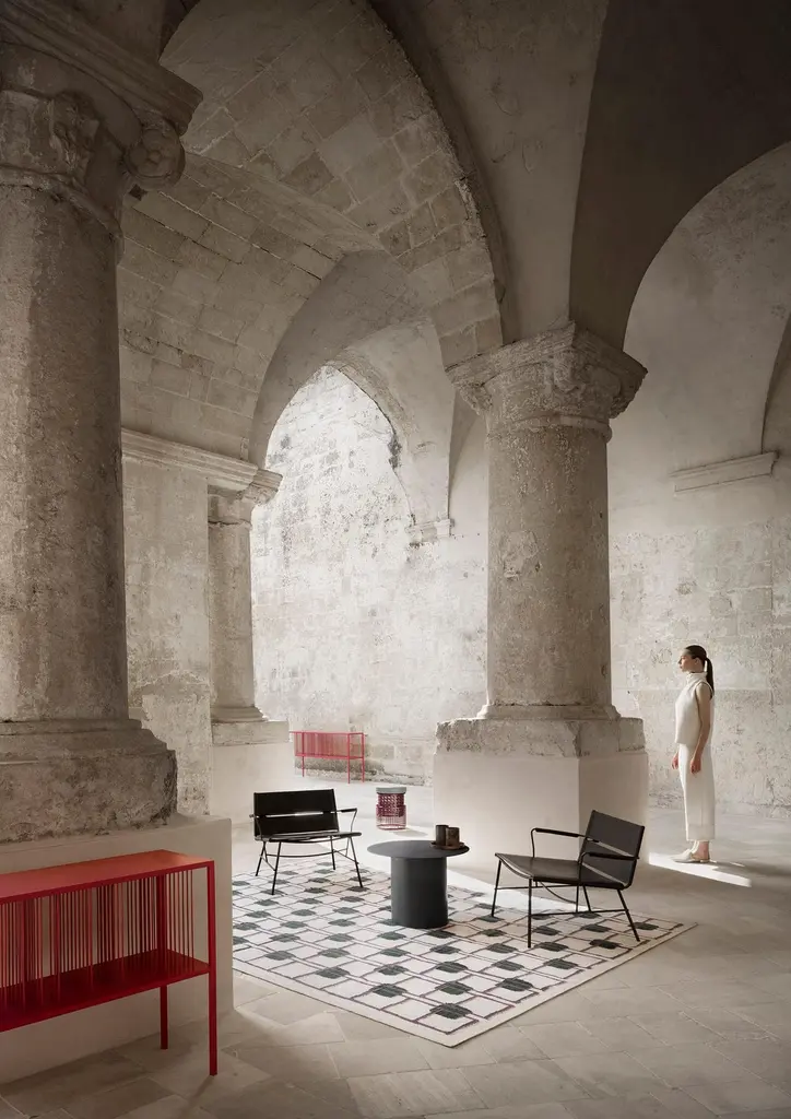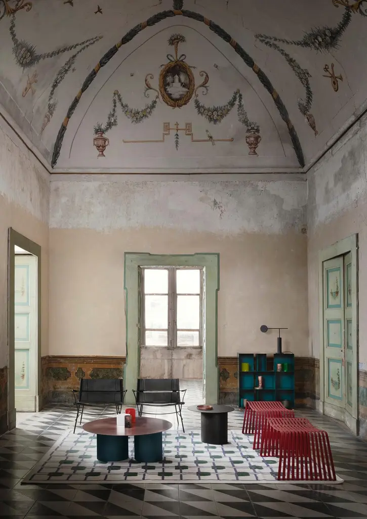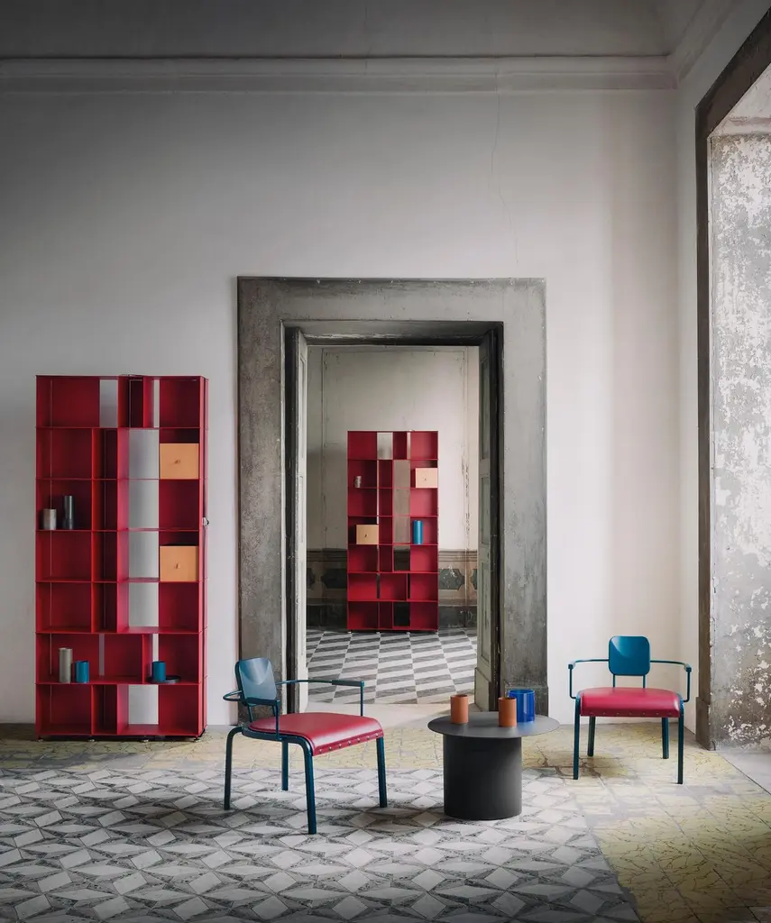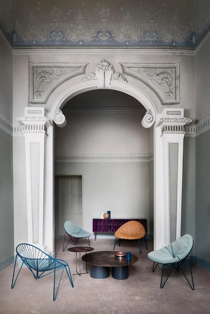 Indoor-outdoor coffee table, elongated and curved cylindrical base, steel top.