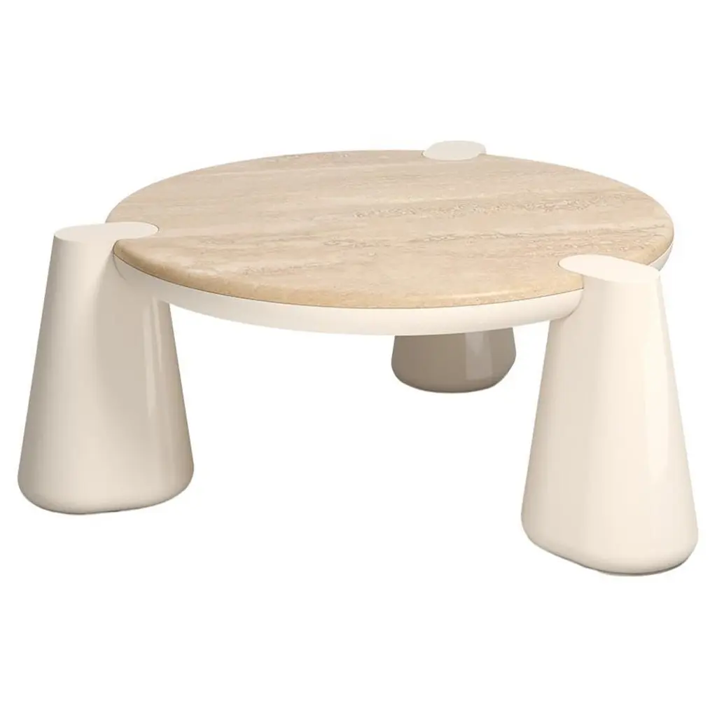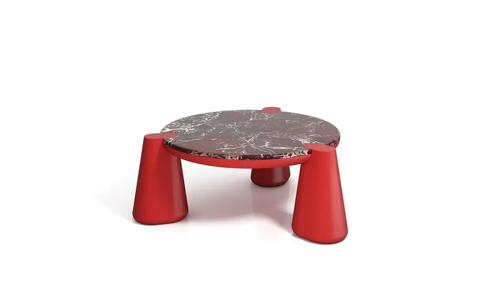 Nuclide Coffee Table design By Elena Salmistraro, product by Scapin CollezioniClean lines, sharp graphics and generous volumes. The expressive power of the table top is combined with a strong three-dimensional support. Amonochromatic effect emphasises the sculptural aspect of this elegant coffee table.Materials: matt lacquered polyurethane base, marble top.Designer and artist Elena Salmistraro takes her inspiration from the historical period between the 1940s and 1960s. During those years the world was a victim of the Cold War and afraid of the imminent nuclear catastrophe, but , despite the scary climate, the public found the strength to imagine a better future.Bold and graphic shapes linked to the fear of the atom were recurrent in the artistic expression of the time as a symbol of the common will to change people’s destiny and defeat the overwhelming sense of fear.The Scapin Collezioni collection by Elena Salmistraro reflects these neo-tribal and post atomic symbols through precious inlays and innovative resin carvings on marble surfaces.