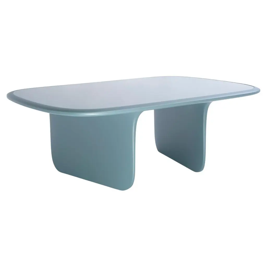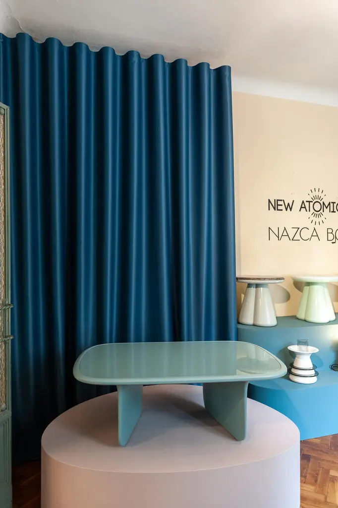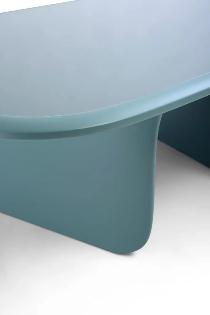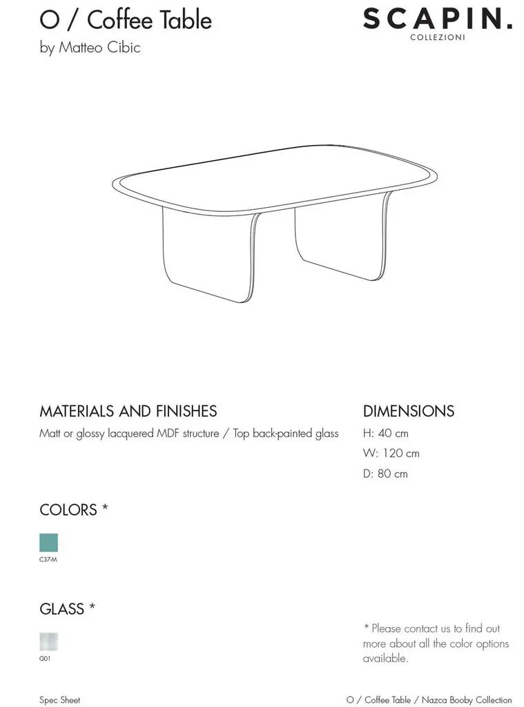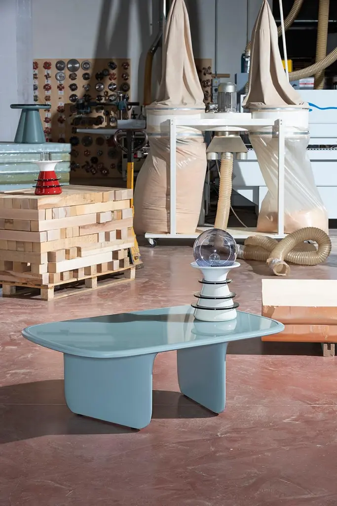 O coffee table, design by Matteo Cibic, product by Scapin CollezioniIn its coffee table version, the O table retains the lightness of a dining table, with thin and tapered legs, but comes in air force blue to blend with an extra-clear glass top. Perfect for living rooms, but also for hotel lobbies, airports, and corporate offices.Nazca Booby Collection by Matteo CibicWorking with colors and their juxtapositions, Matteo Cibic has created a truly outstanding universe of unique and sophisticated pieces. While designing the collection, he took his inspiration from the slender and faded paws of the Nazca Booby, a particular South American specie of birds. The search for ancient mysteries, shapes and animals coming from remote and mysterious lands, inspired Cibic to create a collection that stands out for the lightness of its elements and for the unique use of faded lacquered surfaces.