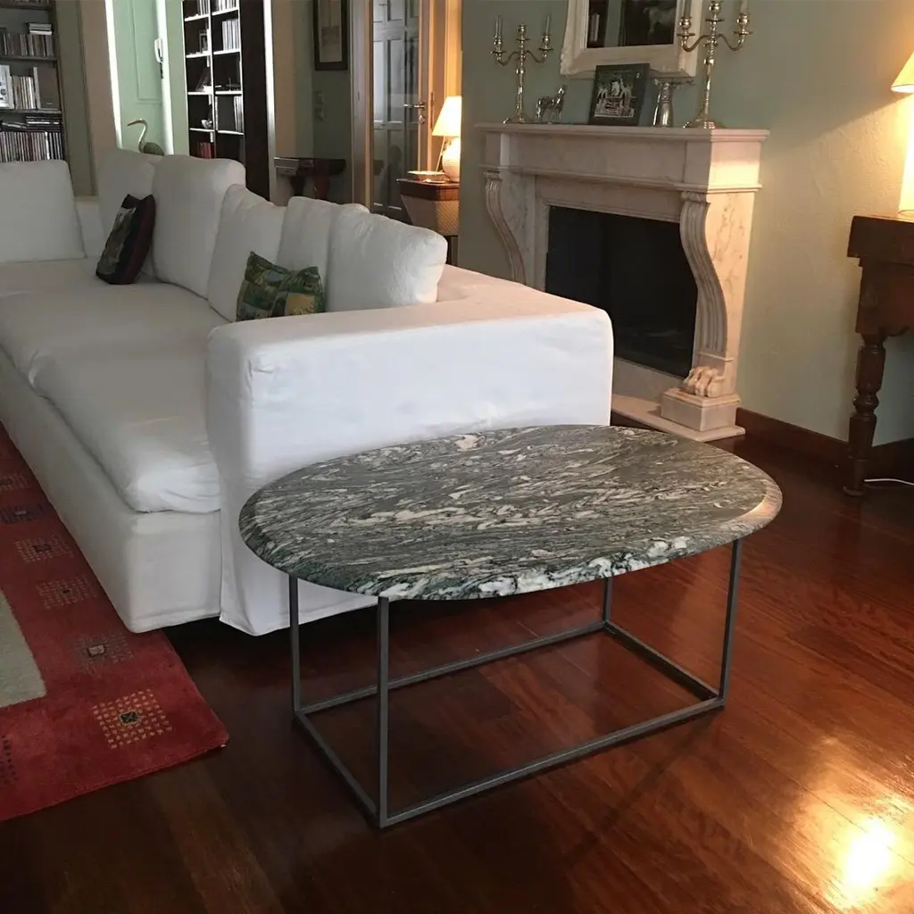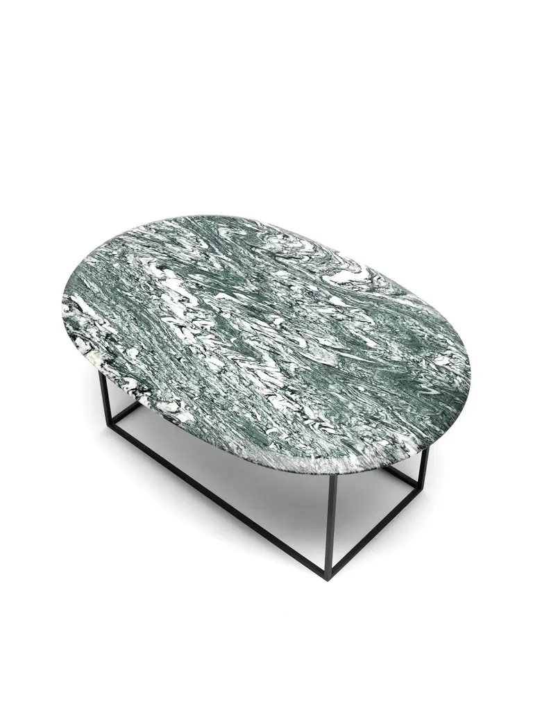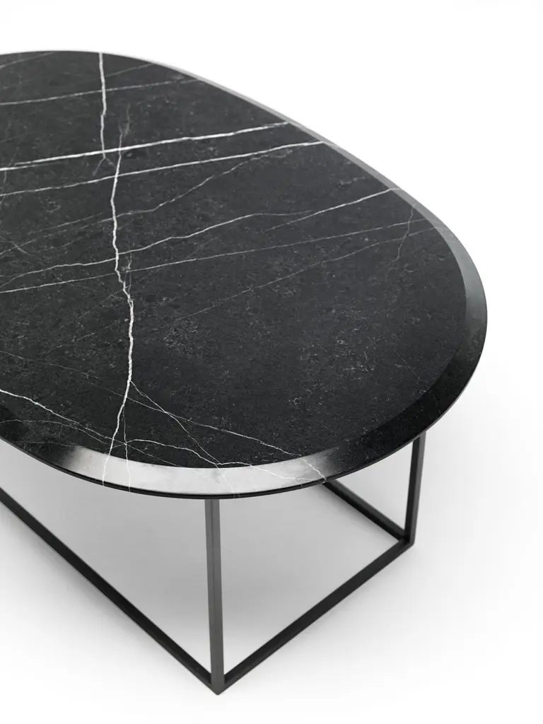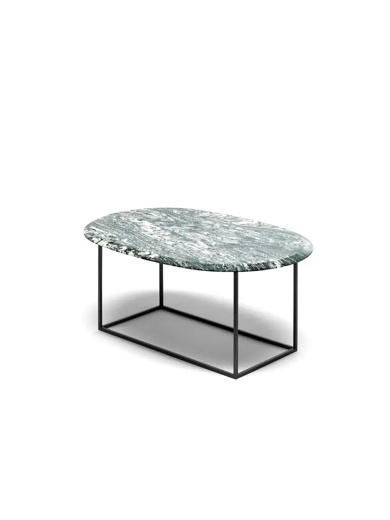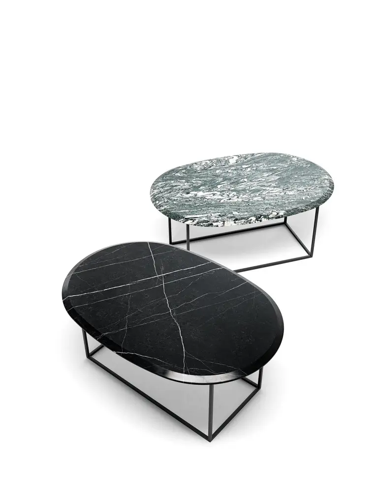 Our MT coffee table is at once simple and rich. The base is made with a very thin squared metal tubing which results in physically and visually light and clean geometric structure. The oval top is thick solid marble made visually lighter by a bevelled edge. Available in 2 heights.Grey cadet painted steel structure with marble top in New Saint Laurent, Carrara or Cipollino marble. Other stones are available upon request.