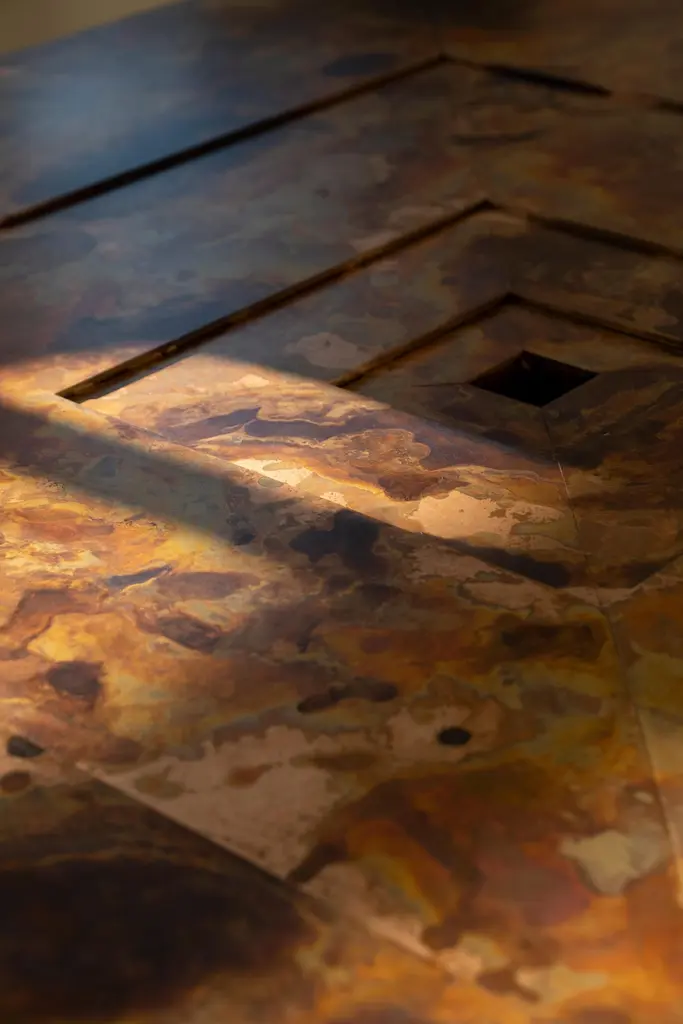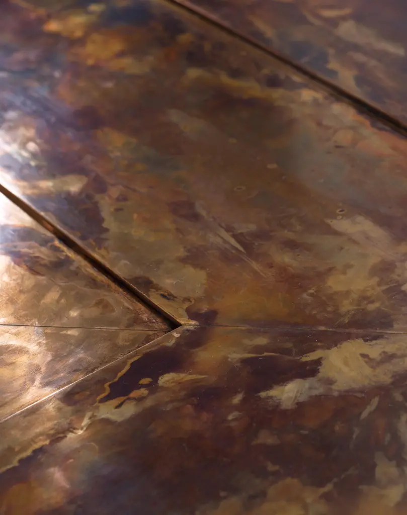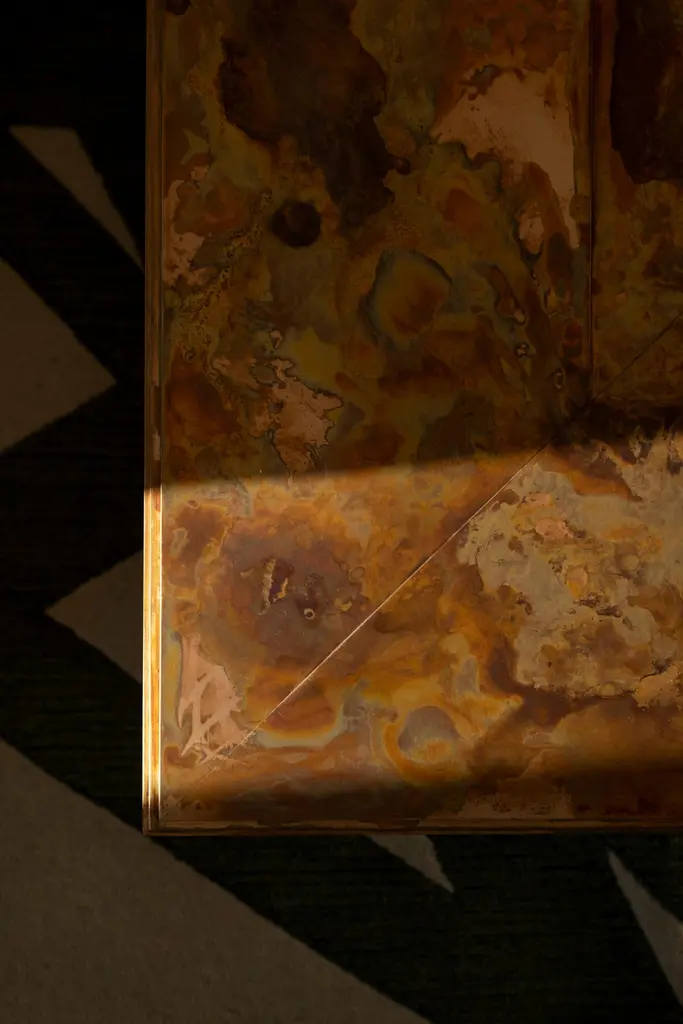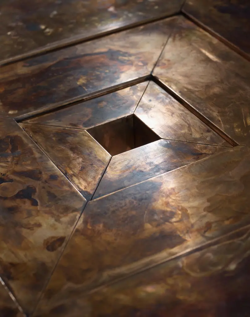 The timeless coffee table, a patinated bronze coffee tableB.B.- The simplicity of design belies the complexity of construction. The top is sandwich cut, stepping down three times before the open centre, all encased in 4mm bronze. The rich marbled patination gives the feeling of constant movement.