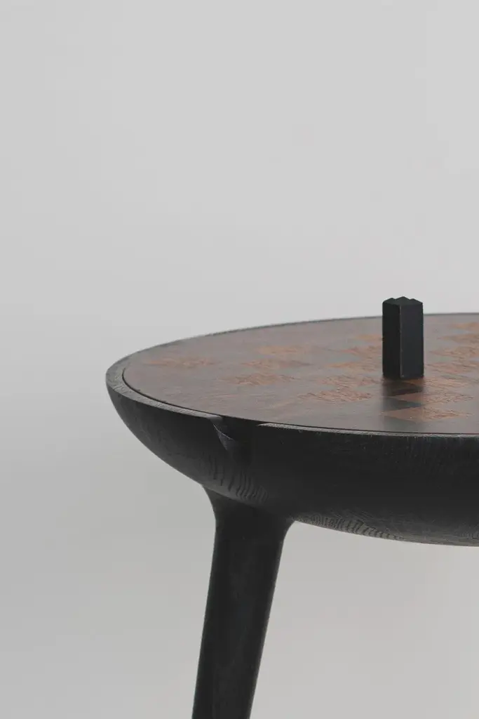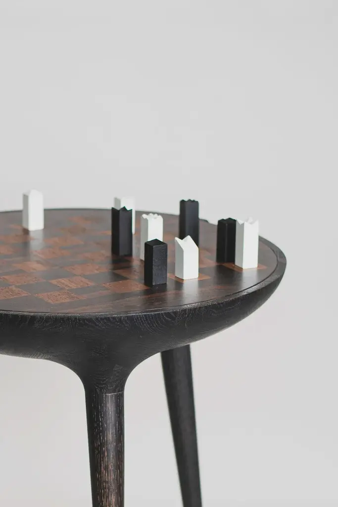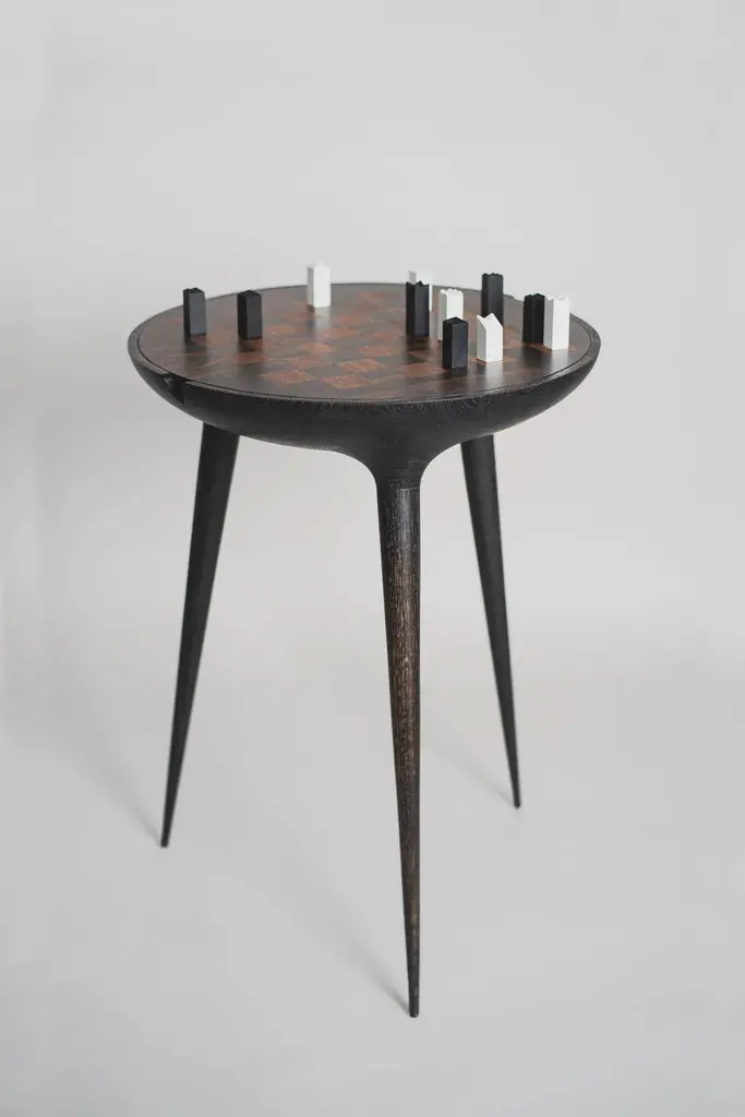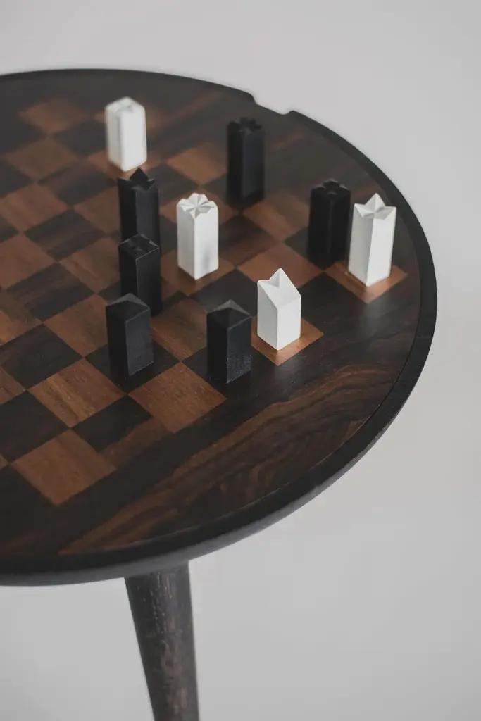 TROJAN, a coffee table at first sight, is hiding space that holds similar amount of fighters as a legendary Trojan horse. 32 chess pieces made by TOWARNA, are cast from concrete, one of first composite materials, used already in ancient Rome. Chess, which evolved from the Persian chess-like game Shatranj, purportedly developed from the first known variant - an Indian game of Chaturanga, are the best gymnastics for our brains. We've broadened our family of Trojan chess tables with a richly dark variant. The hue is achieved through a chemical reaction, so it doesn't rely on using a color pigment that might fade over time. Both the chessboard and the opposite side of the tabletop are adorned with ziricote wood veneer. Surface finish: polyurethane varnish Chessboard is made of 68 hand-folded parts of a special wood veneer with an unusual wood texture that can be seen for example in interiors of luxury cars. The double-sided table top can turn a chess table into a coffee or storage table. The appearance of the board can be designed individually. Under the table top is a “box of chocolates” with beds for sleeping warriors. The chess pieces designed by us were meticulously manufactured and supplied by TOWARNA. Hight: 19.6 in (50 cm) Diameter: 17.7 in (45 cm)