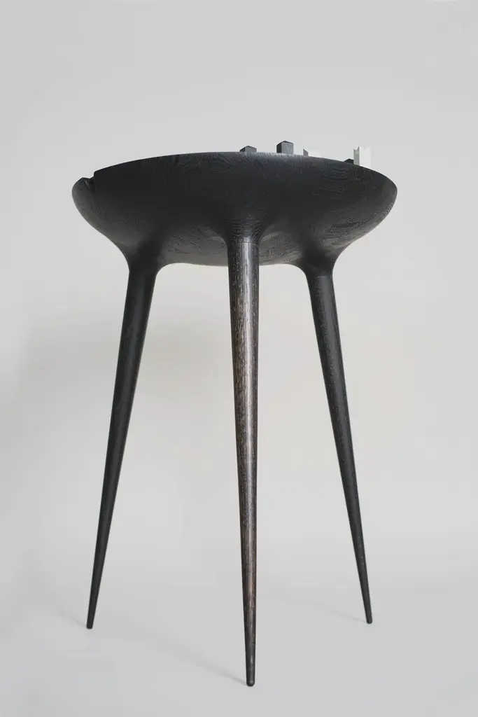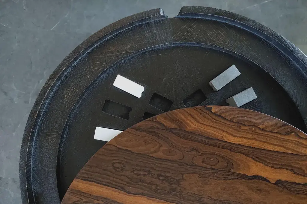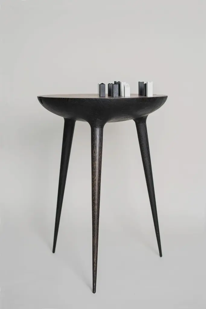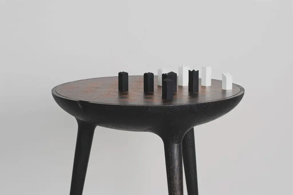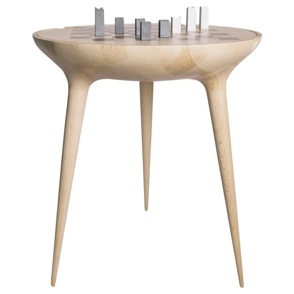 TROJAN, a coffee table at first sight, is hiding space that holds similar amount of fighters as a legendary Trojan horse. 32 chess pieces made by TOWARNA, are cast from concrete, one of first composite materials, used already in ancient Rome. Chess, which evolved from the Persian chess-like game Shatranj, purportedly developed from the first known variant - an Indian game of Chaturanga, are the best gymnastics for our brains. We've broadened our family of Trojan chess tables with a richly dark variant. The hue is achieved through a chemical reaction, so it doesn't rely on using a color pigment that might fade over time. Both the chessboard and the opposite side of the tabletop are adorned with ziricote wood veneer. Surface finish: polyurethane varnish Chessboard is made of 68 hand-folded parts of a special wood veneer with an unusual wood texture that can be seen for example in interiors of luxury cars. The double-sided table top can turn a chess table into a coffee or storage table. The appearance of the board can be designed individually. Under the table top is a “box of chocolates” with beds for sleeping warriors. The chess pieces designed by us were meticulously manufactured and supplied by TOWARNA. Hight: 19.6 in (50 cm) Diameter: 17.7 in (45 cm)
