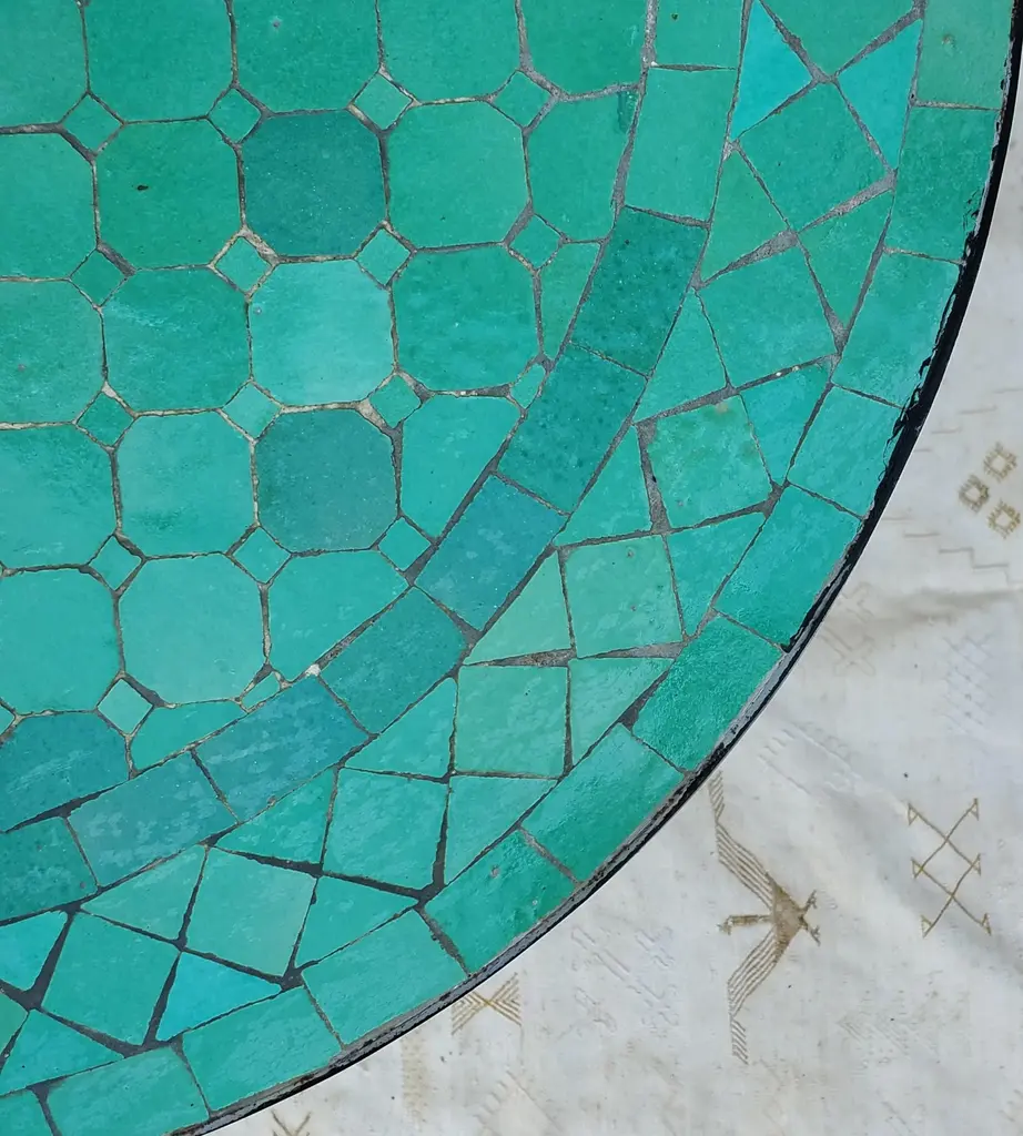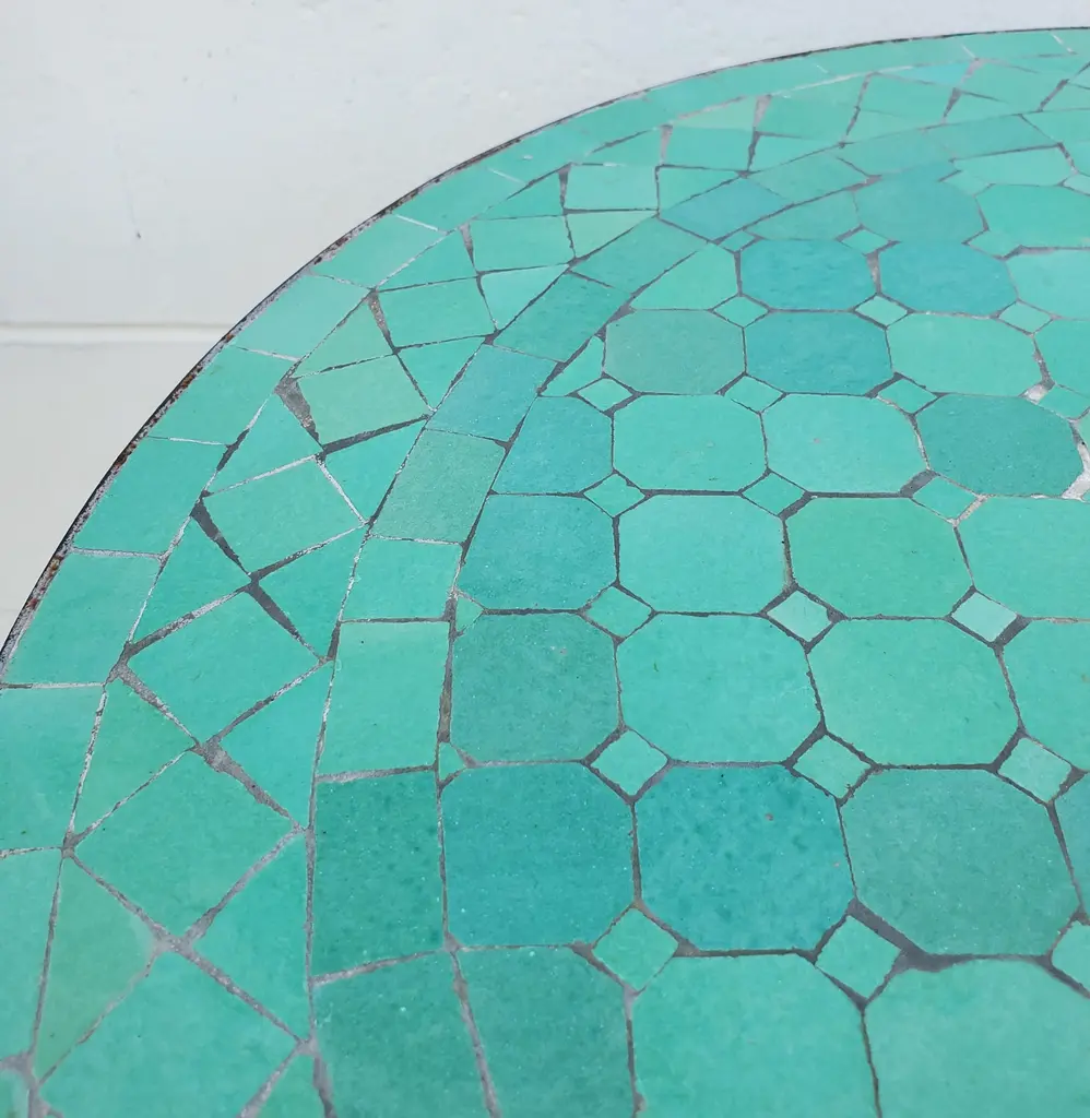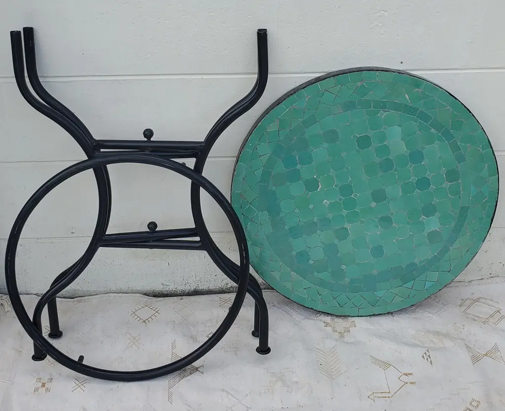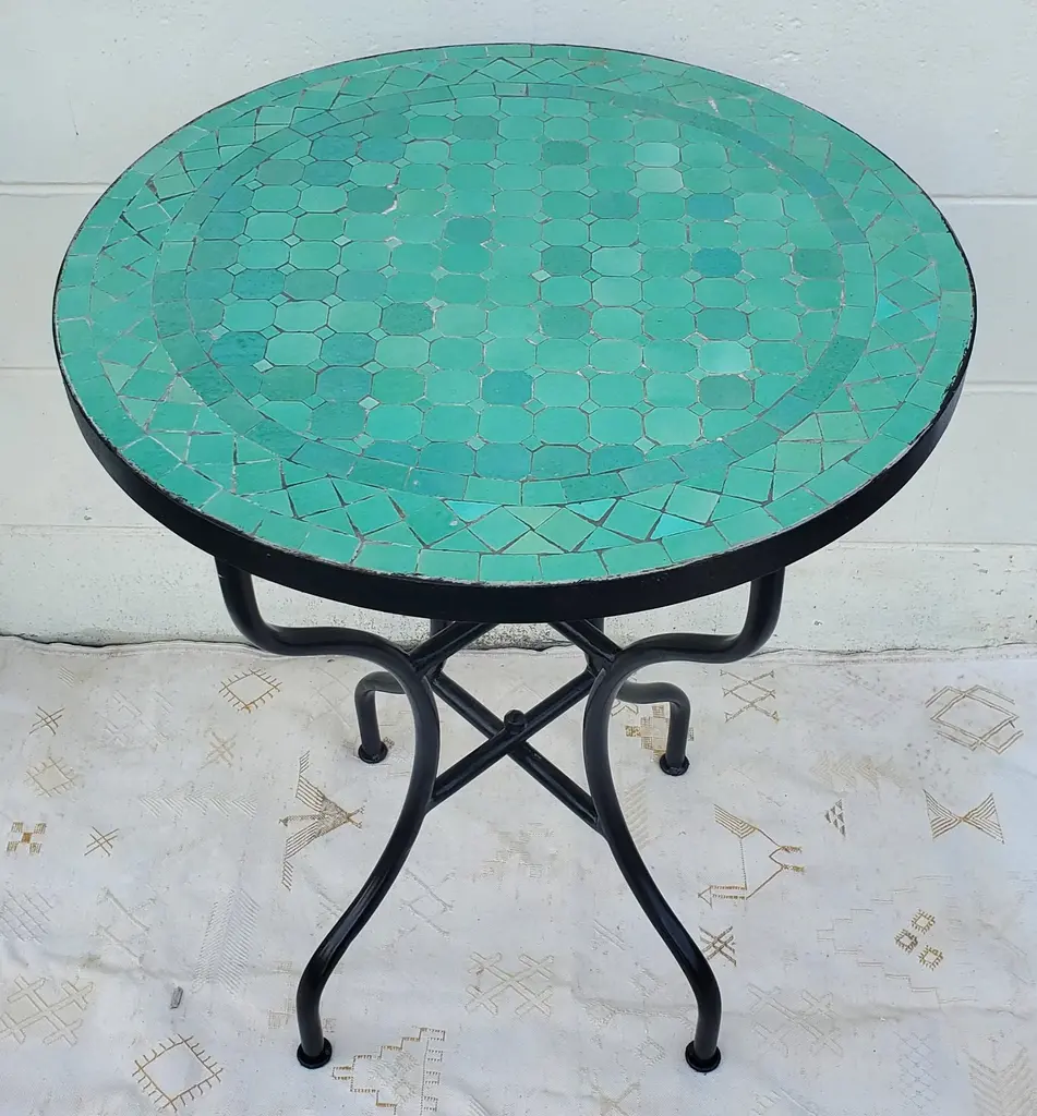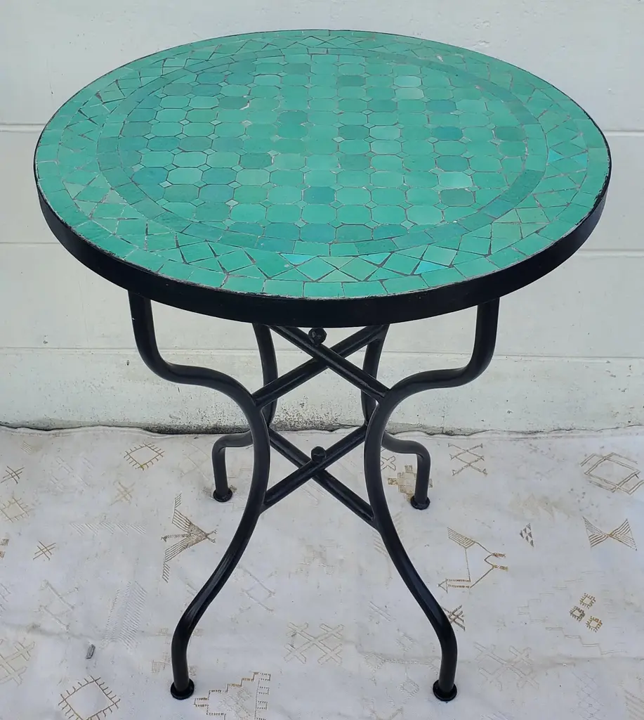 100 % glazed round. Moroccan mosaic table measuring approximately 24″ in diameter and 29" in height. Aqua is the color. For both indoors and outdoors. Great as a cocktail table. Vibrant color. Intricate patterns. Included in the price is a wrought iron folding base. Please contact us for details. Mosaic tables and Mosaic fountains are our specialty. We have many to choose from. Different sizes, shapes, and colors are available in stock. Please contact us if you don't see what you are looking for. The subtle variations and small flaws in a handmade item are what give it a unique personality and undeniable charm.
