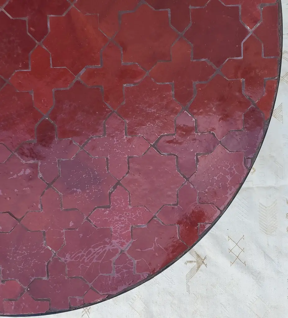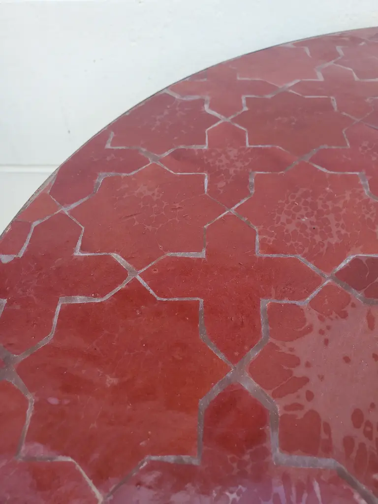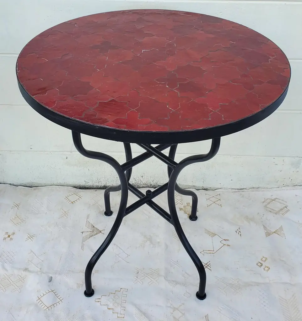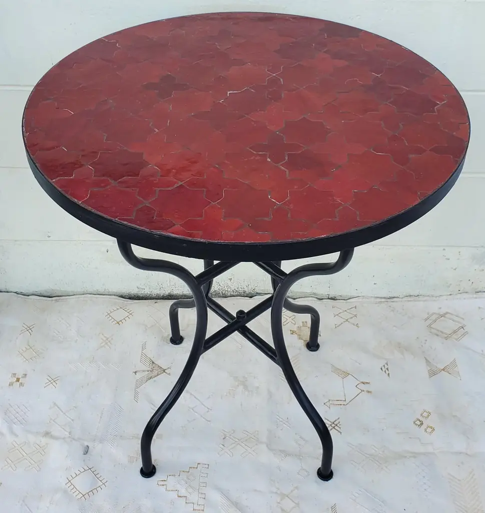 100 % glazed round. Moroccan mosaic table measuring approximately 27″ in diameter and 29" in height. Red is the color. For both indoors and outdoors. Great as a cocktail table. Vibrant color. Intricate patterns. Included in the price is a wrought iron folding base. Please contact us for details. The subtle variations and small flaws in a handmade item are what give it a unique personality and undeniable charm. Mosaic tables and Mosaic fountains are our specialty. We have many to choose from. Different sizes, shapes, and colors are available in stock. Please contact us if you don't see what you are looking for. Following many clients' suggestions, most iron bases and table top rims are rustic and roughed up. If you want them to be nice and clean in a flat black finish, please let us know.