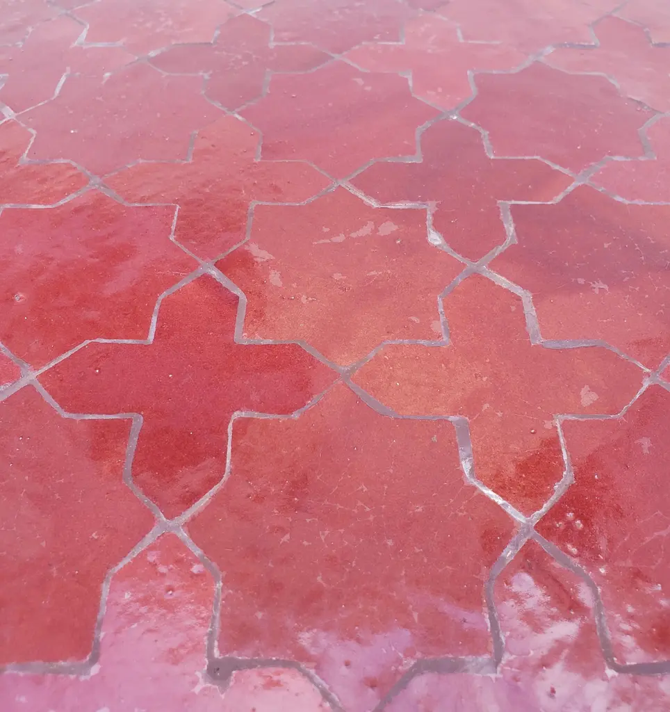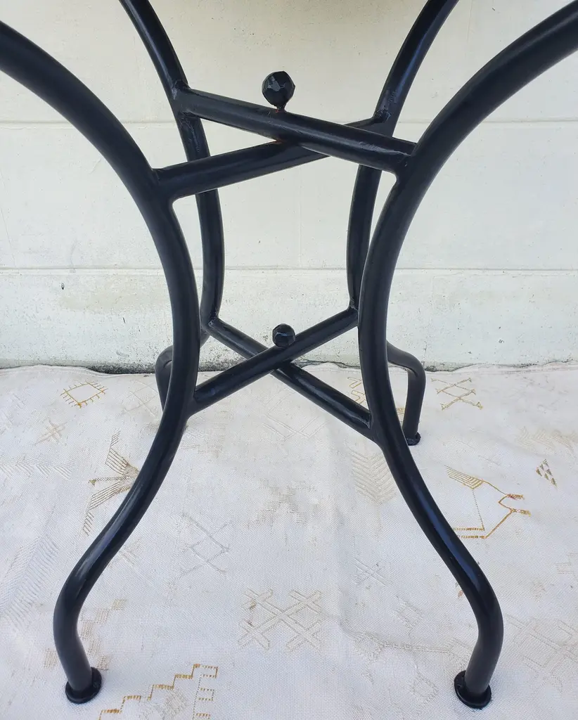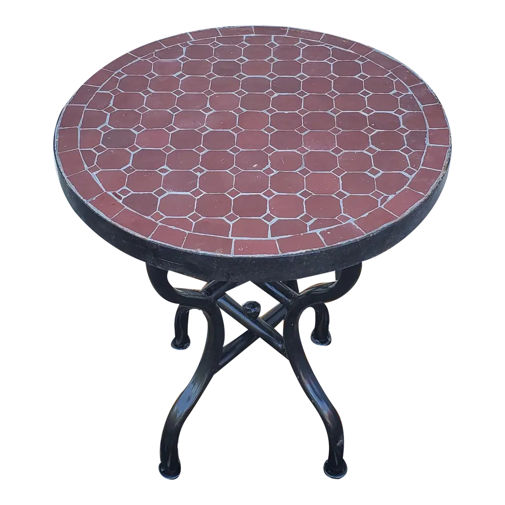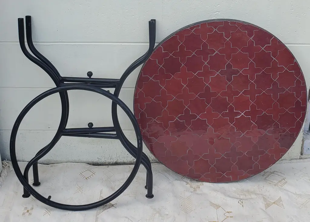 100 % glazed round. Moroccan mosaic table measuring approximately 27″ in diameter and 29" in height. Red is the color. For both indoors and outdoors. Great as a cocktail table. Vibrant color. Intricate patterns. Included in the price is a wrought iron folding base. Please contact us for details. The subtle variations and small flaws in a handmade item are what give it a unique personality and undeniable charm. Mosaic tables and Mosaic fountains are our specialty. We have many to choose from. Different sizes, shapes, and colors are available in stock. Please contact us if you don't see what you are looking for. Following many clients' suggestions, most iron bases and table top rims are rustic and roughed up. If you want them to be nice and clean in a flat black finish, please let us know.
