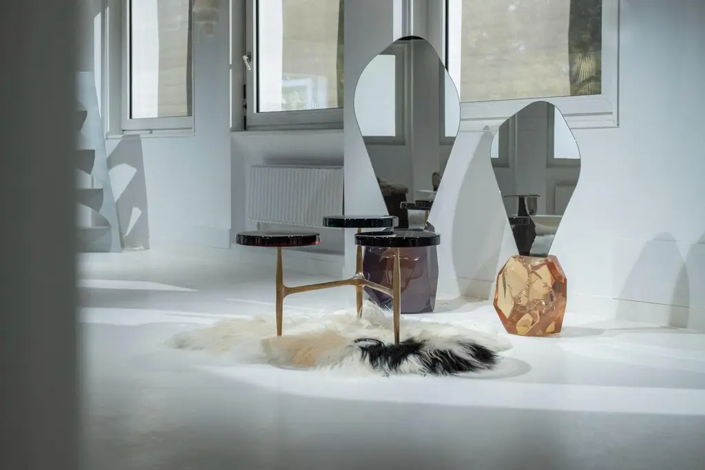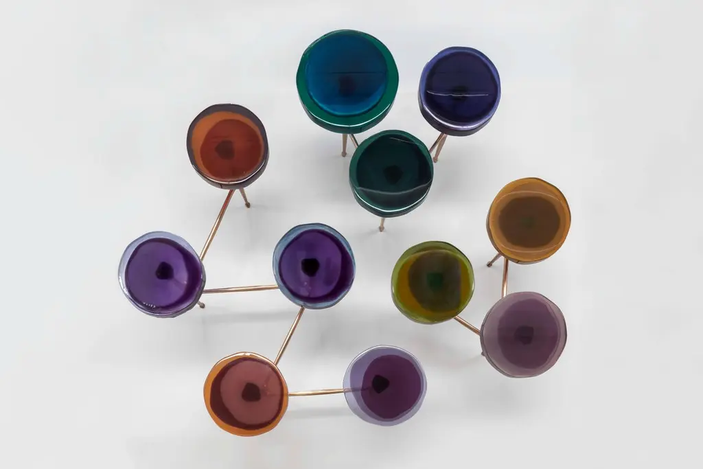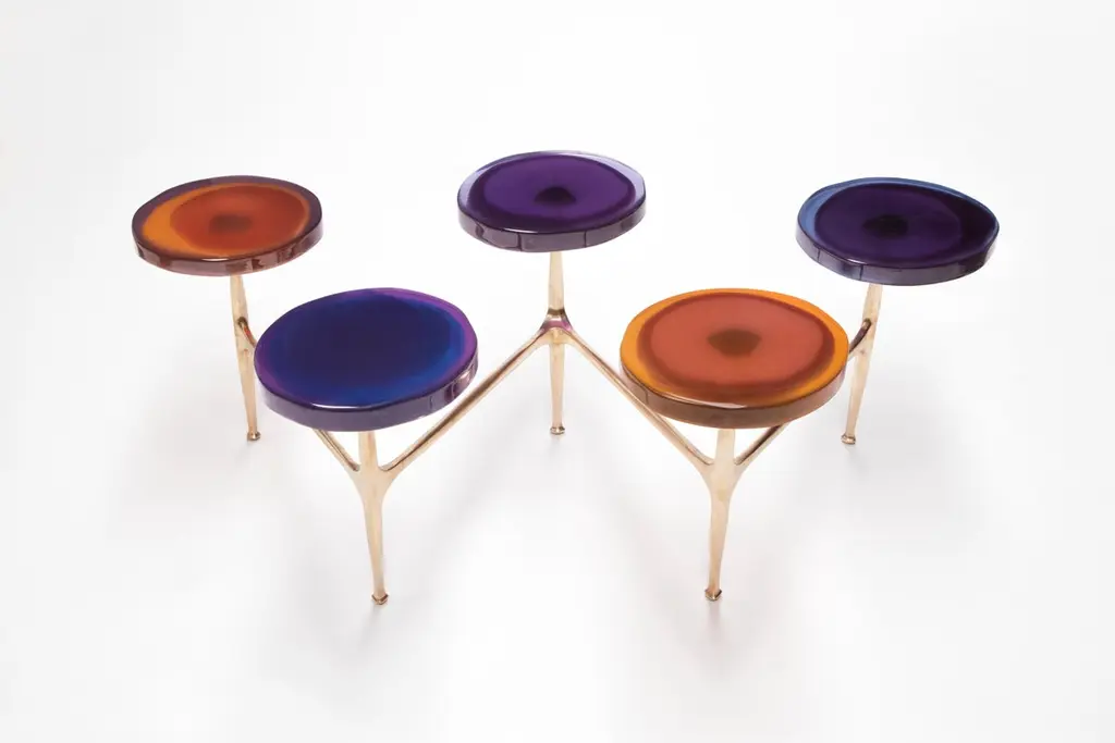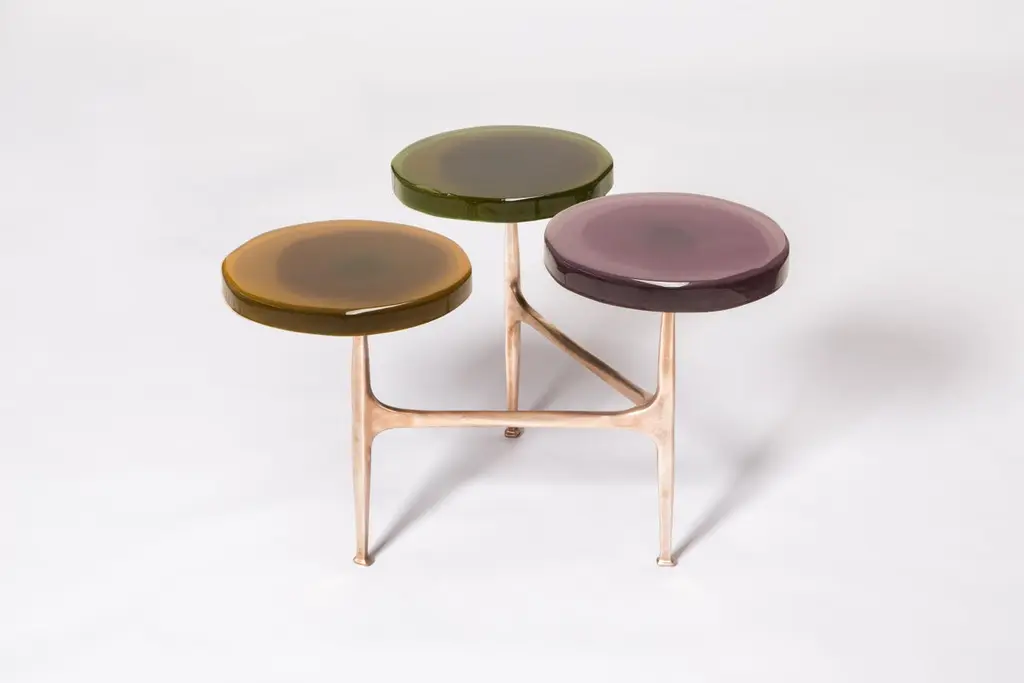 Agatha coffee table by Draga & AurelDimensions: W 121 x D 80 x H 50 cm top Ø 32/40 cmMaterials: Resin, bronzeThe Agatha coffee tables are featured by irregular circular tops of transparent andcolorful resin sit on a bronze frame with a staggered placement, inspired by clustersof wildflowers.The table tops’ process of creating requires a special technique of casting resinentirely made by hand in the Draga & Aurel laboratory of Como. Playing with vibrantcolour combinations, also incorporating any random mistakes and accidents, thematerial is melted into several layers creating fluid, deep, unique table tops. Thestructure in bronze is made by casting. Thanks to a handcrafted, artistic process thecoffee tables are featured by a special matte effect in earth-colored.Founded in 2007 in the town of Como, Italy, Draga & Aurel is a multidisciplinary design studio that works along the spectrum of furniture, textile and interior design. Draga Obradovic began her career in the fashion industry, first working in London and Milan as a textile designer before eventuallysettling in Como. Aurel K. Basedow graduated from Milan’s Accademia di Belle Arti with a degree in Fine Arts, having previously trained as a carpenter and woodworker. Thanks to their sympathetic methods, combined with an artist’s approach to material and composition Draga & Aurel are widelyrecognized for their clever reinvention of bespoke vintage design pieces.Their showing at 2009’s Salone del Mobile introduced the duo to the world stage; it followed the partnerships with several companies that have pushed the pair’s domain beyond the reinvention of singular vintage pieces. While interior projects have expanded their sought after aesthetic into the realm of hospitality and lifestyle. In occasion of the 2019 Milan Design Week the design duo presented Transparency Matters, an exhibition of limited edition pieces, entirely fabricated by hand in their Como atelier.