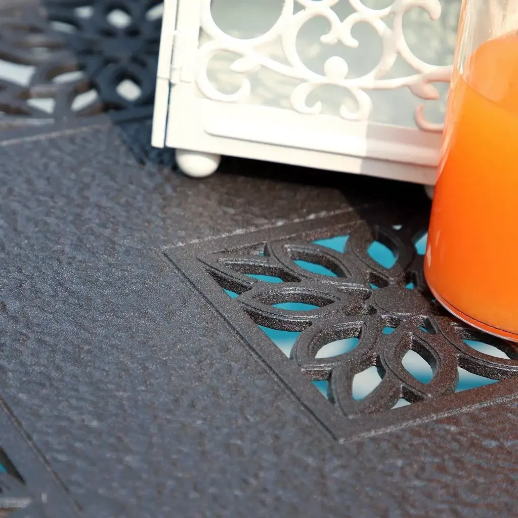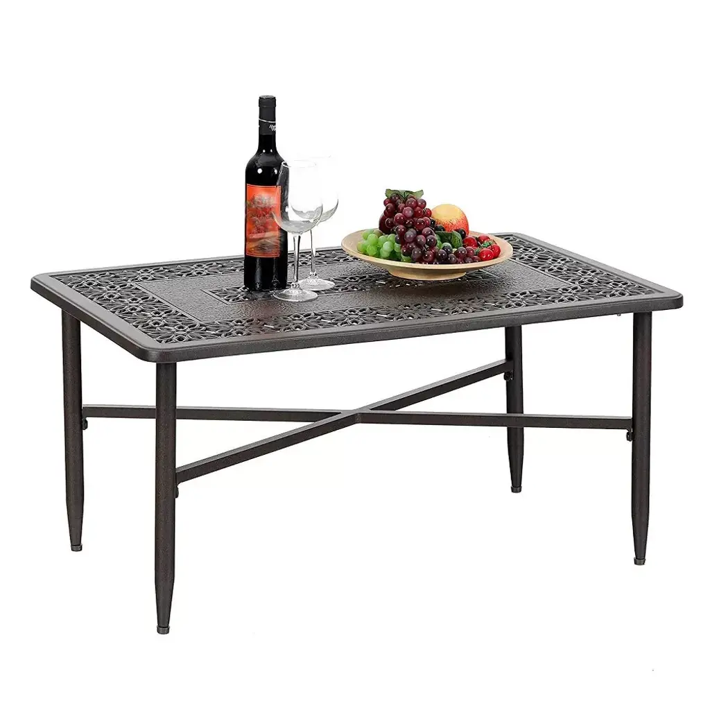 [CAPTIVA DESIGNS] Experience the ideal blend of style and durability with our Cast Aluminum Rectangle Bistro Table. Made from lightweight aluminum and aluminum alloy, it’s easy to move and features a 1.75" umbrella hole for sun protection, along with skid-resistant foot mats for stability. Reinforced with an X-shaped brace and finished with E-coating and powder coating, this rectangle table is designed to withstand various weather conditions, ensuring lasting beauty and functionality in your outdoor space.FEATURESGenerously Spacious Design: Accommodates up to 6 peopleLightweight Yet Strong: Aluminum and Aluminum Alloy construction.Secure Grip: Skid-resistant foot mats ensure stability and prevent tilting.Stylish Support: An X-shaped brace connects legs, aesthetics and stability.Weatherproof Finish: E-coating and powder-coat resist water and weather.SPECIFICATIONDining Table: 38.6"D x 23"W x 18.9"H, Tabletop Thickness: 1.6"Package Includes1 x Rectangle Table (1 box)Instruction Manual (come with the box)(Decorations on the table are not included)Tips: Allow all the holes in the section to line up correctly and then tighten the screws. Assembly: 20 minutes to put the bar height table together