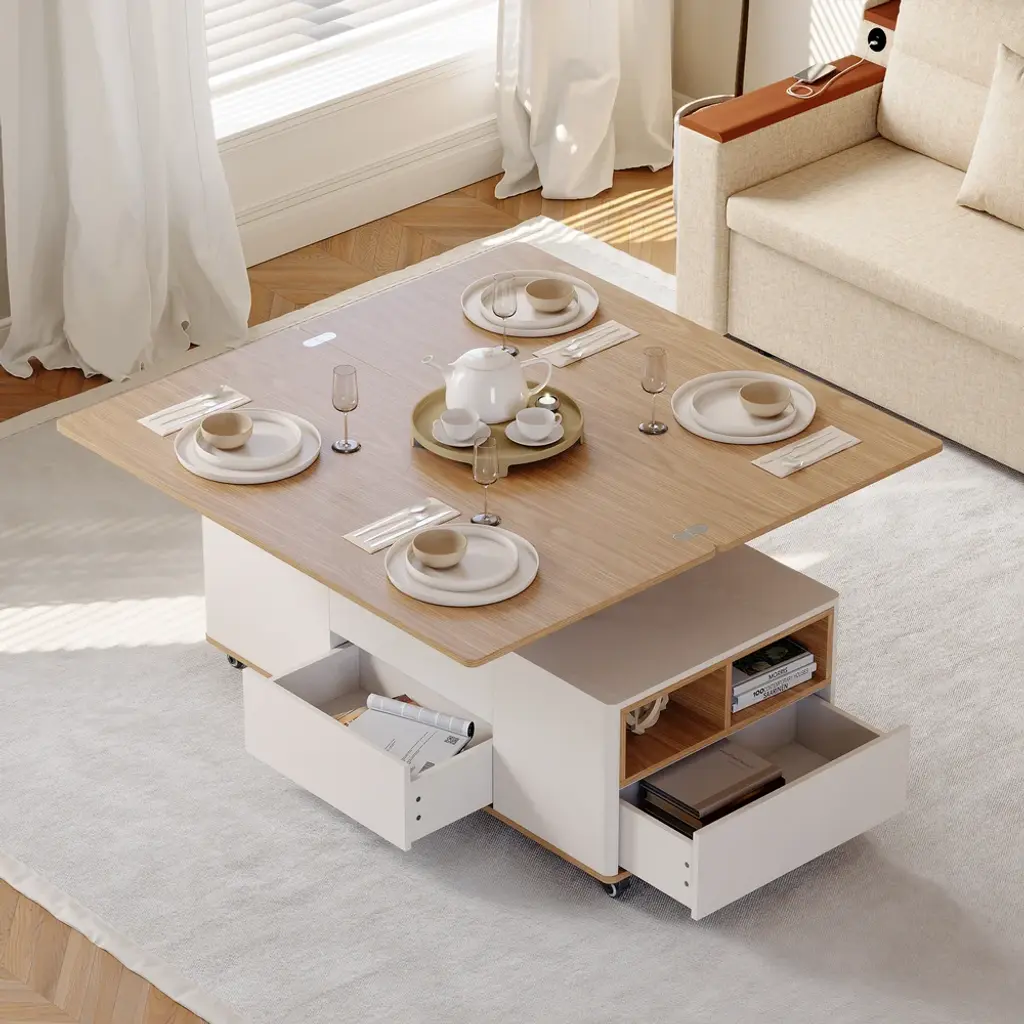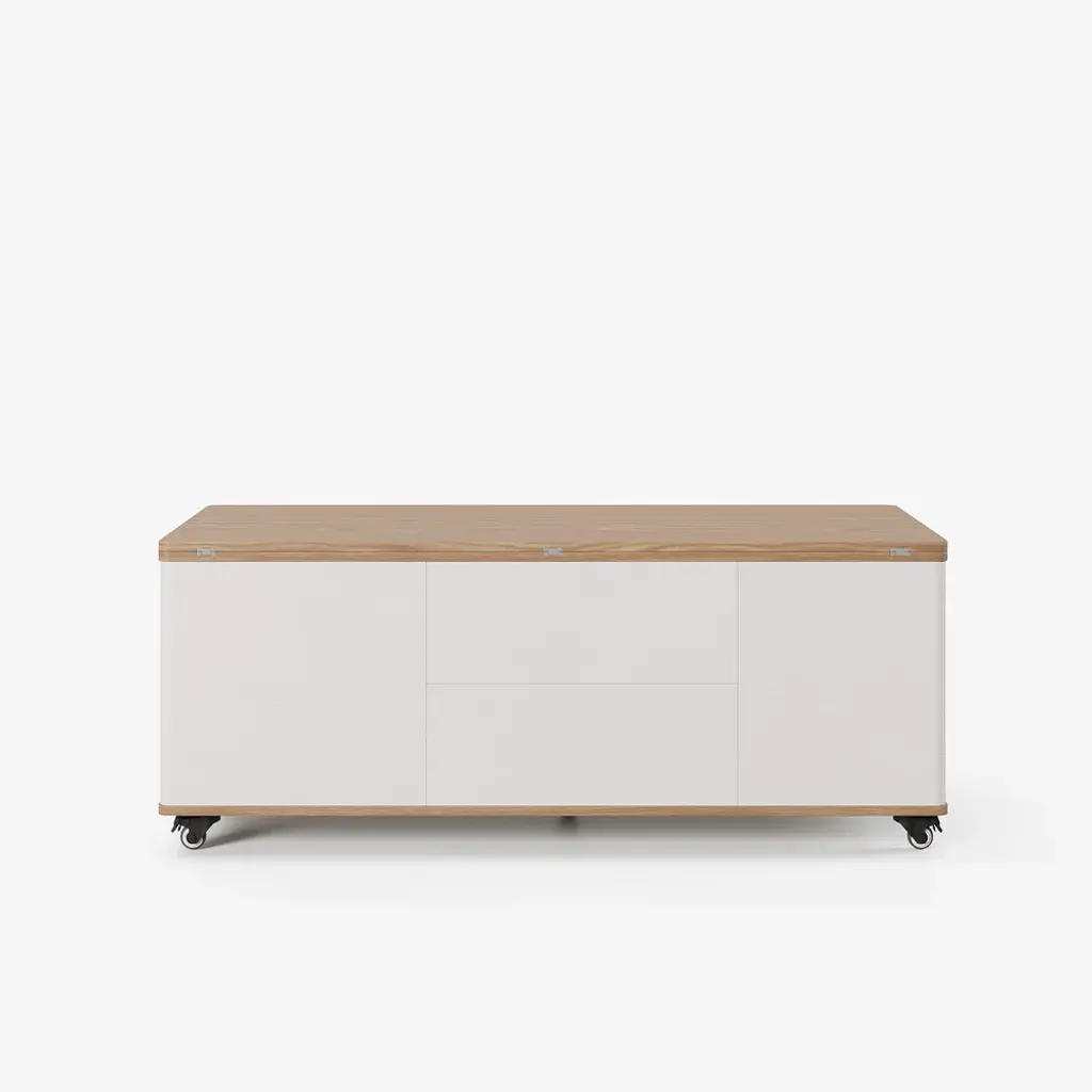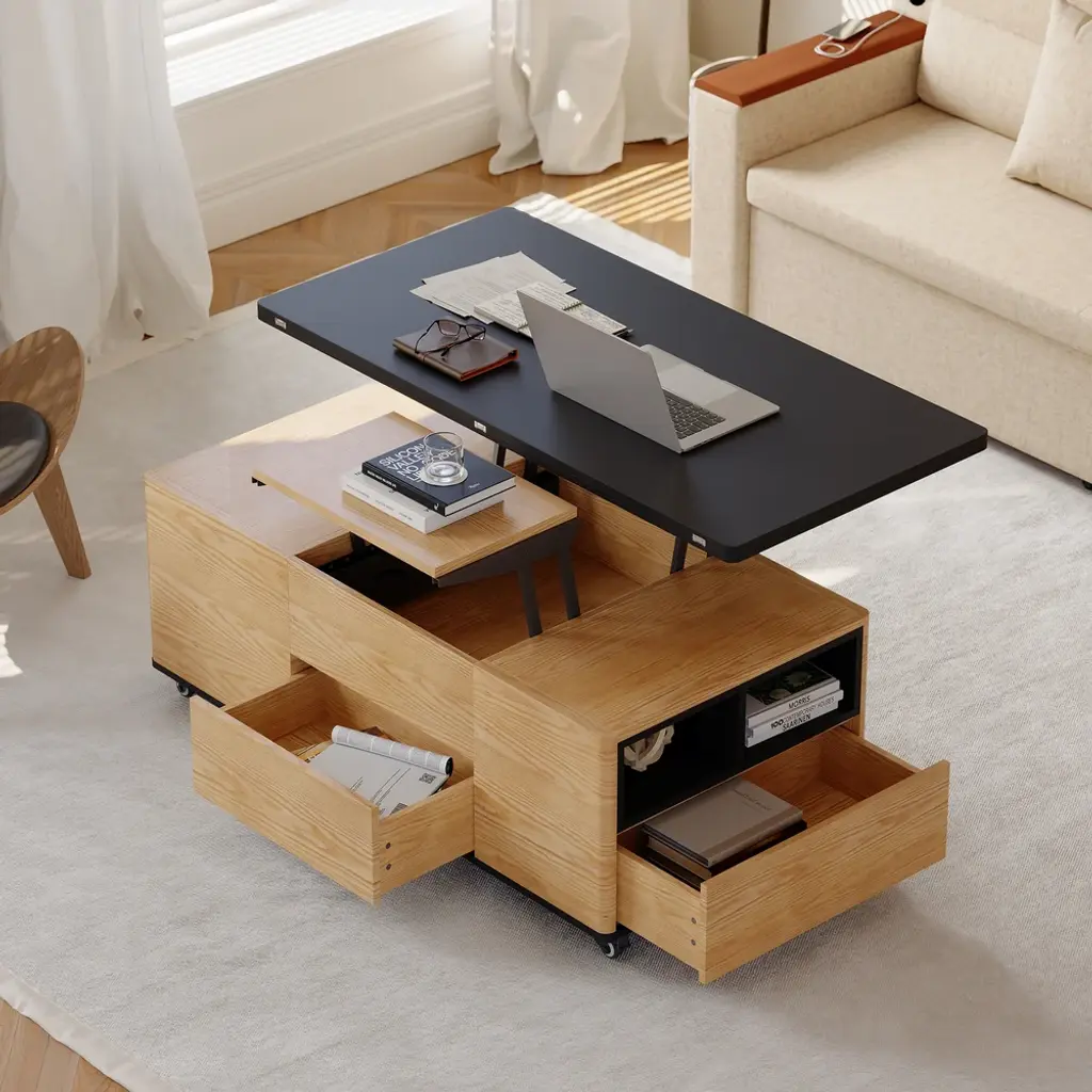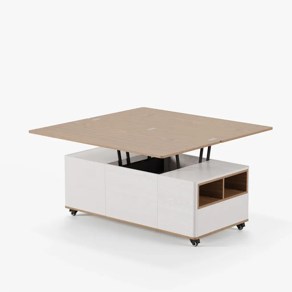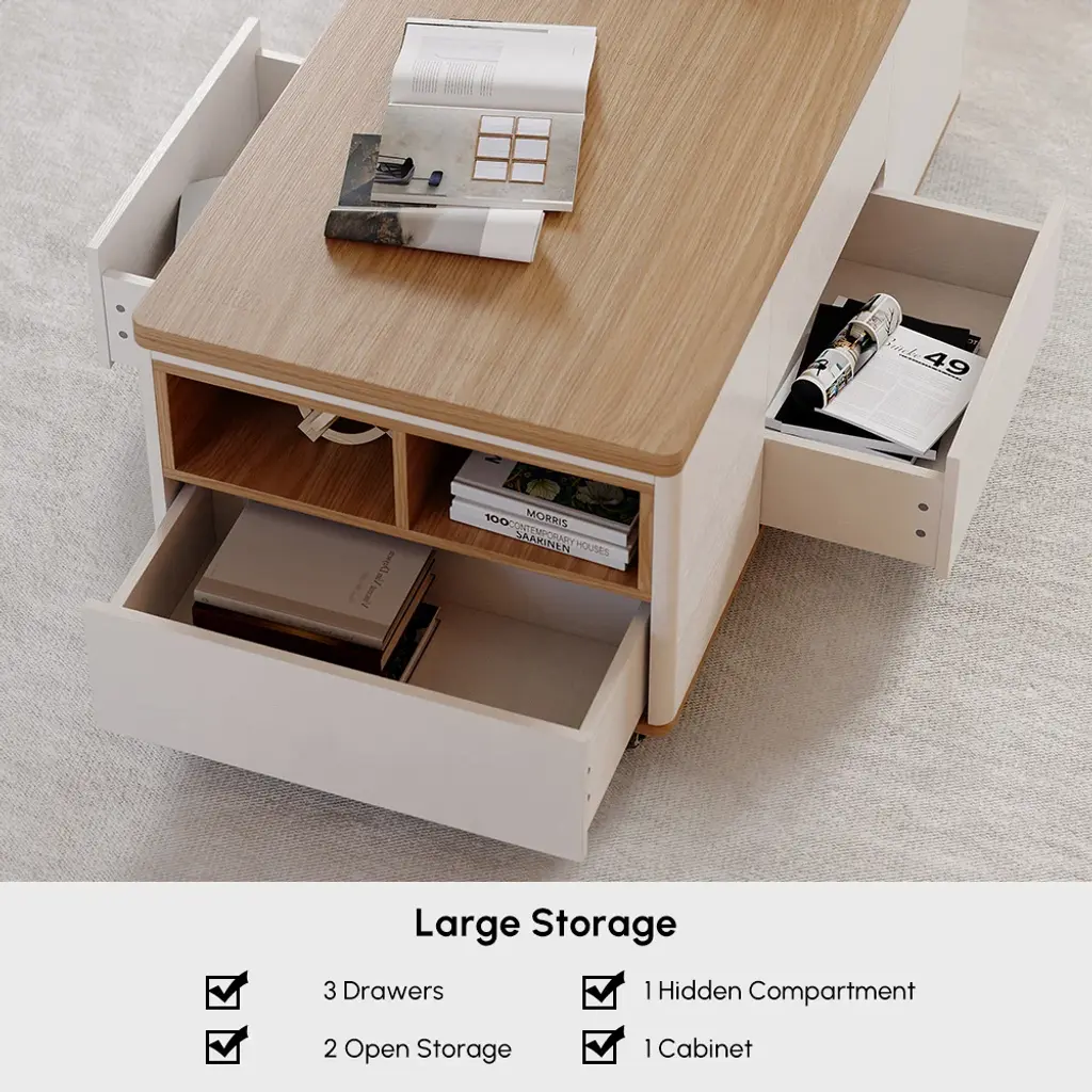 The lift-top coffee table transforms into a spacious dining table when fully extended, an office table when semi-extended state, or a regular coffee table when stowed away. This coffee table features 2 drawers, open storage, and hidden storage compartments for laptops, books, snacks, and more.
