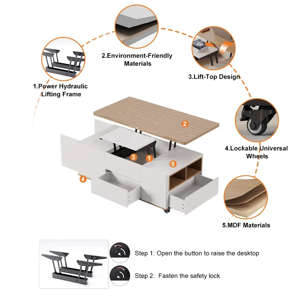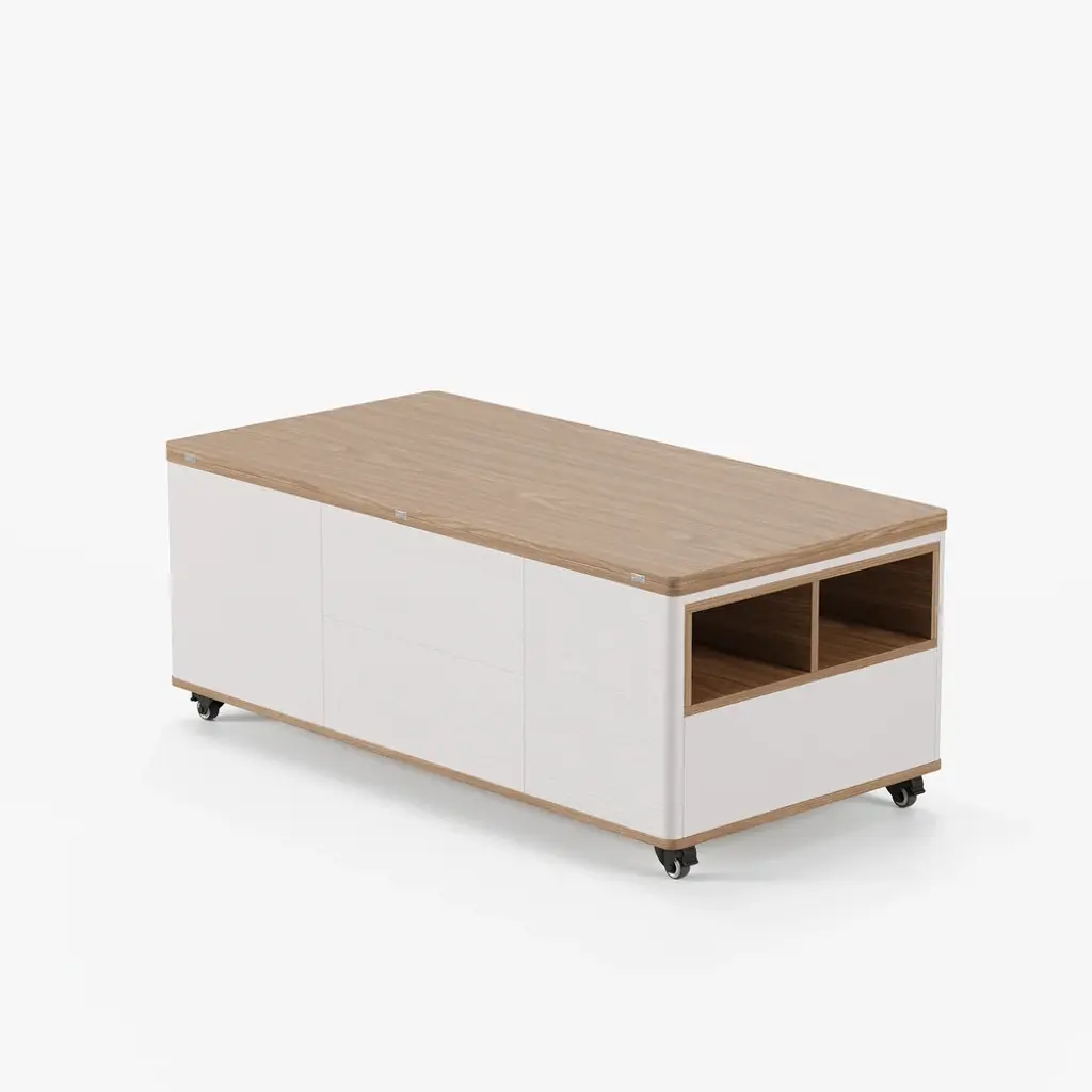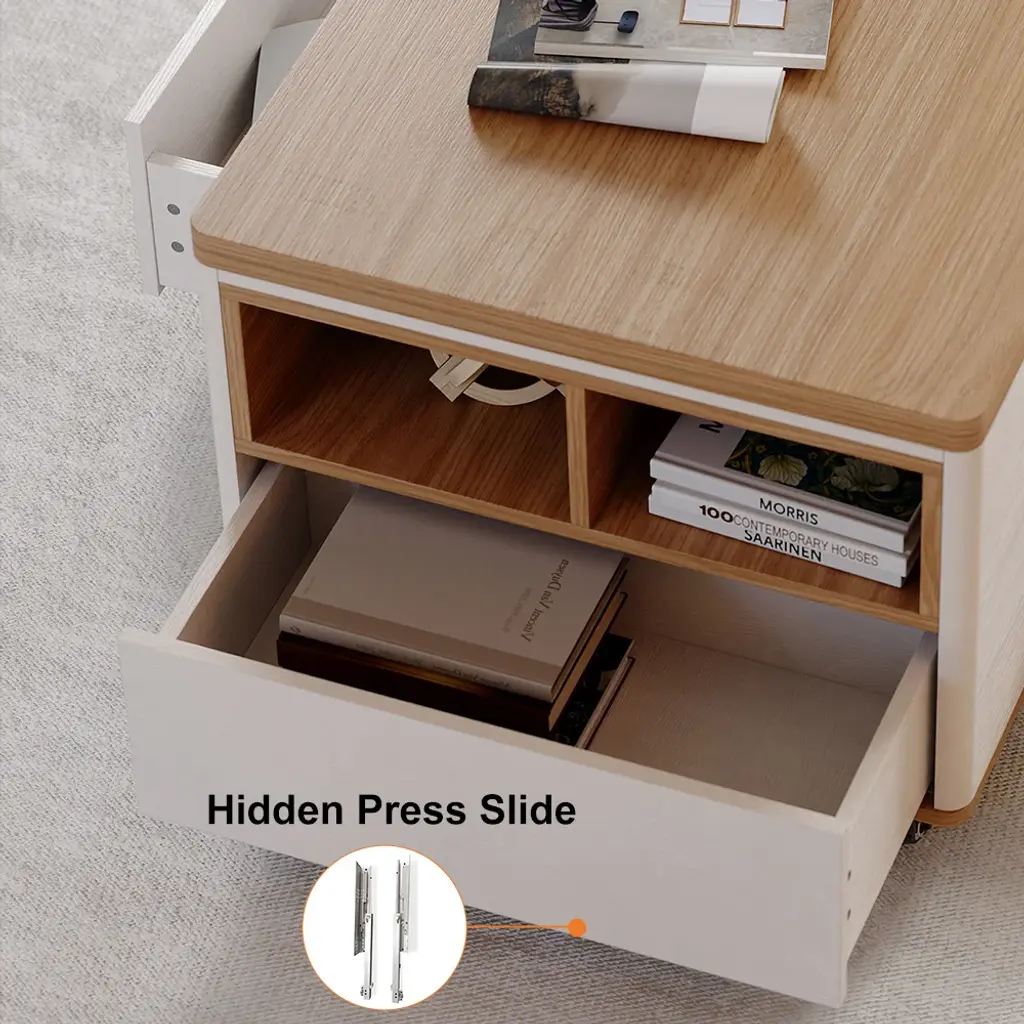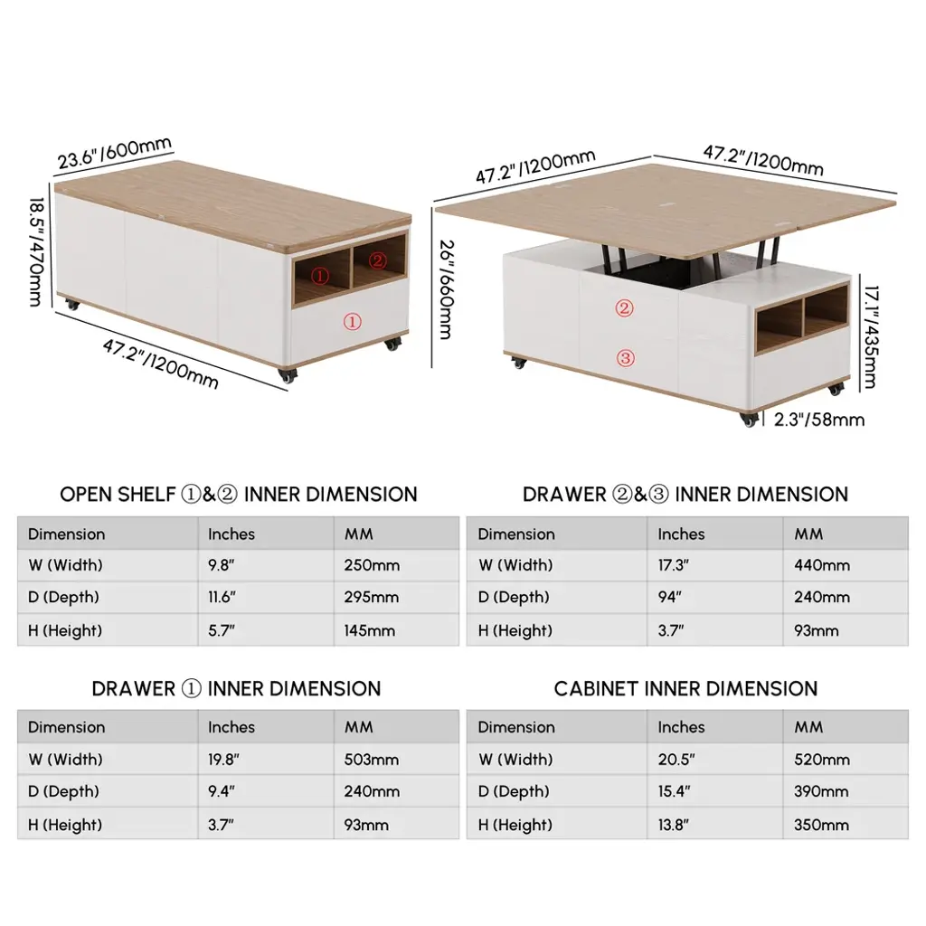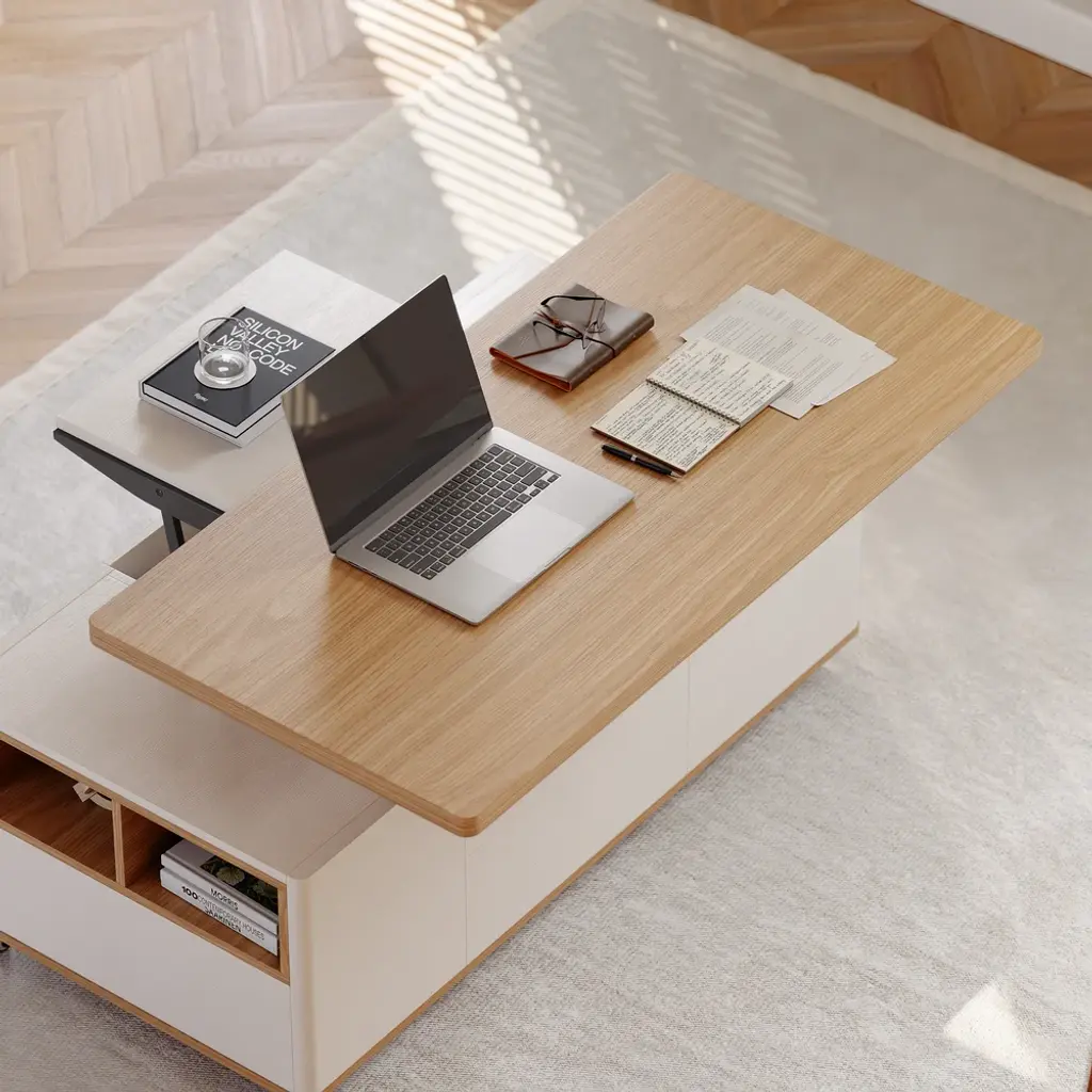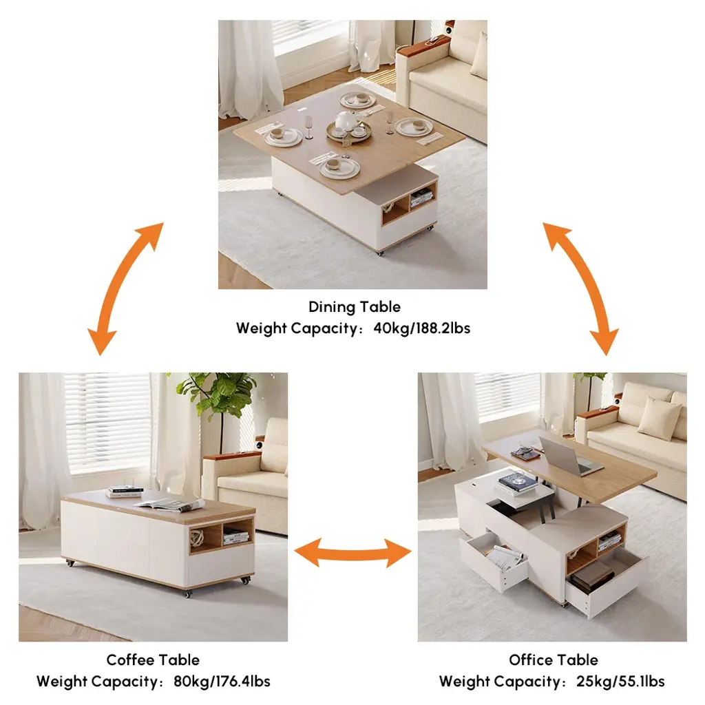 The lift-top coffee table transforms into a spacious dining table when fully extended, an office table when semi-extended state, or a regular coffee table when stowed away. This coffee table features 2 drawers, open storage, and hidden storage compartments for laptops, books, snacks, and more.