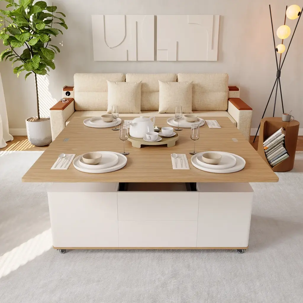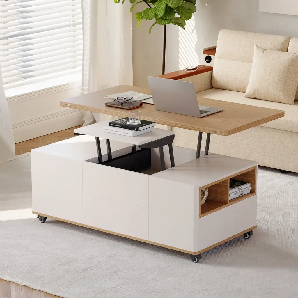 47" Lift-Top Foldable Natural & White Coffee Table With Drawers & Cabinet