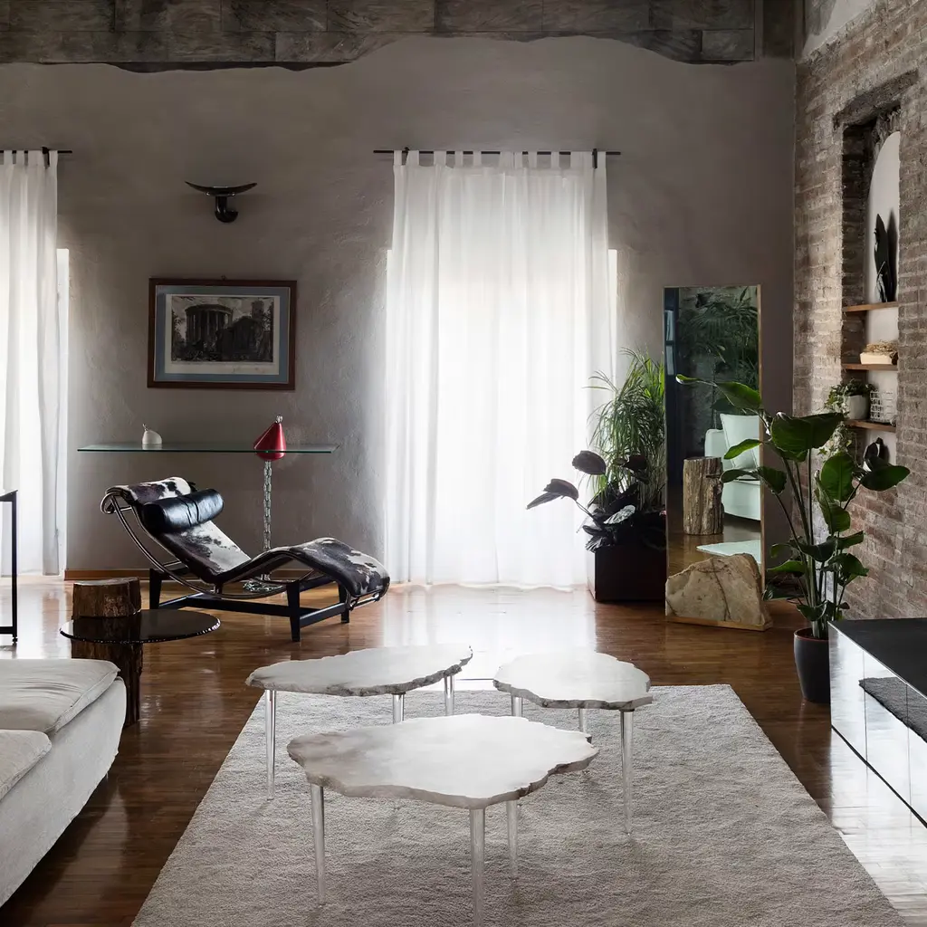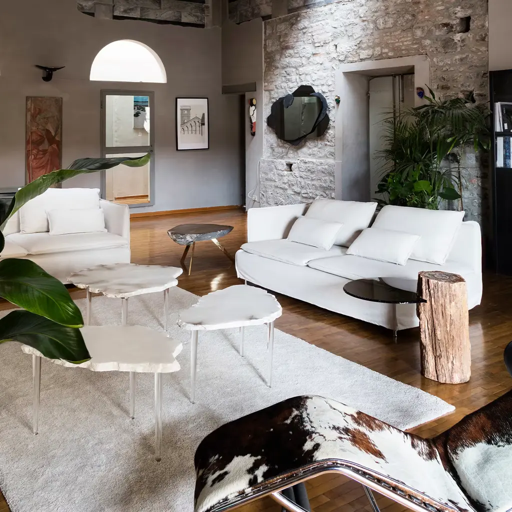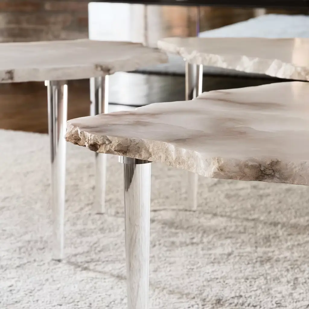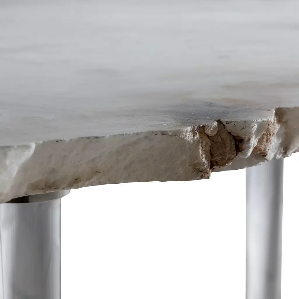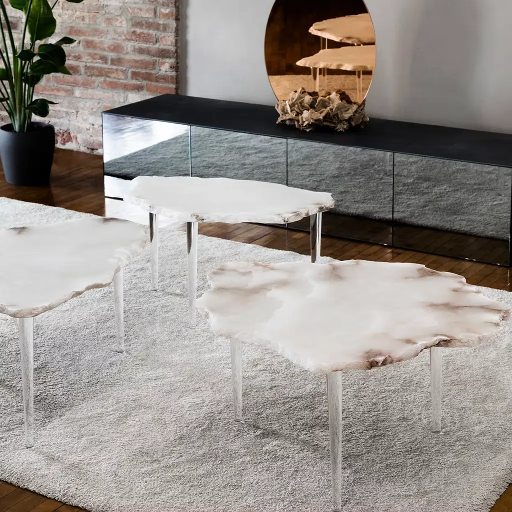 Designed to resemble drifting banquise ice blocks. Its name refers to the Larsen Ice shelf, a long ice shelf in the northwest part of the Weddell Sea. The tables are made of alabaster and acrylic legs. The a-68 piece is essentially a set of three tables providing a representation of the now scattered pieces of what was once a single iceberg. Each piece has been designed from the white Volterra alabaster. The handmade legs in acrylic are a hint of stalactites originating from the melting iceberg.