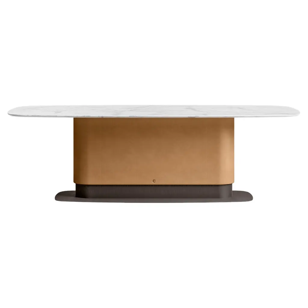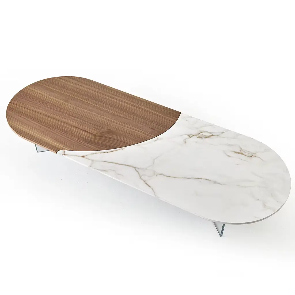 Bold, captivating, and daring. This coffee table captures the essence of less is more. The table's oval silhouette is comprised of 2 materials, solid Canaletto walnut and white Calacatta ceramic slab, arranged to seamlessly fit along an undulating edge that delineates their contrasting yet complementary textures and colors. Supported by tempered clear glass feet, which infuse an airy and dynamic touch. Superb for a Scandinavian-inspired, modern living room or office lounge.