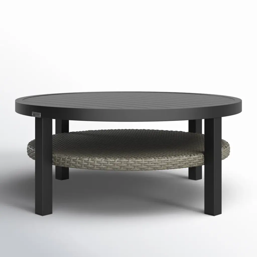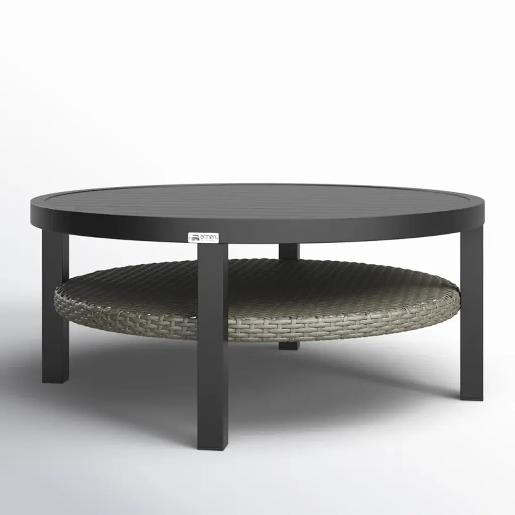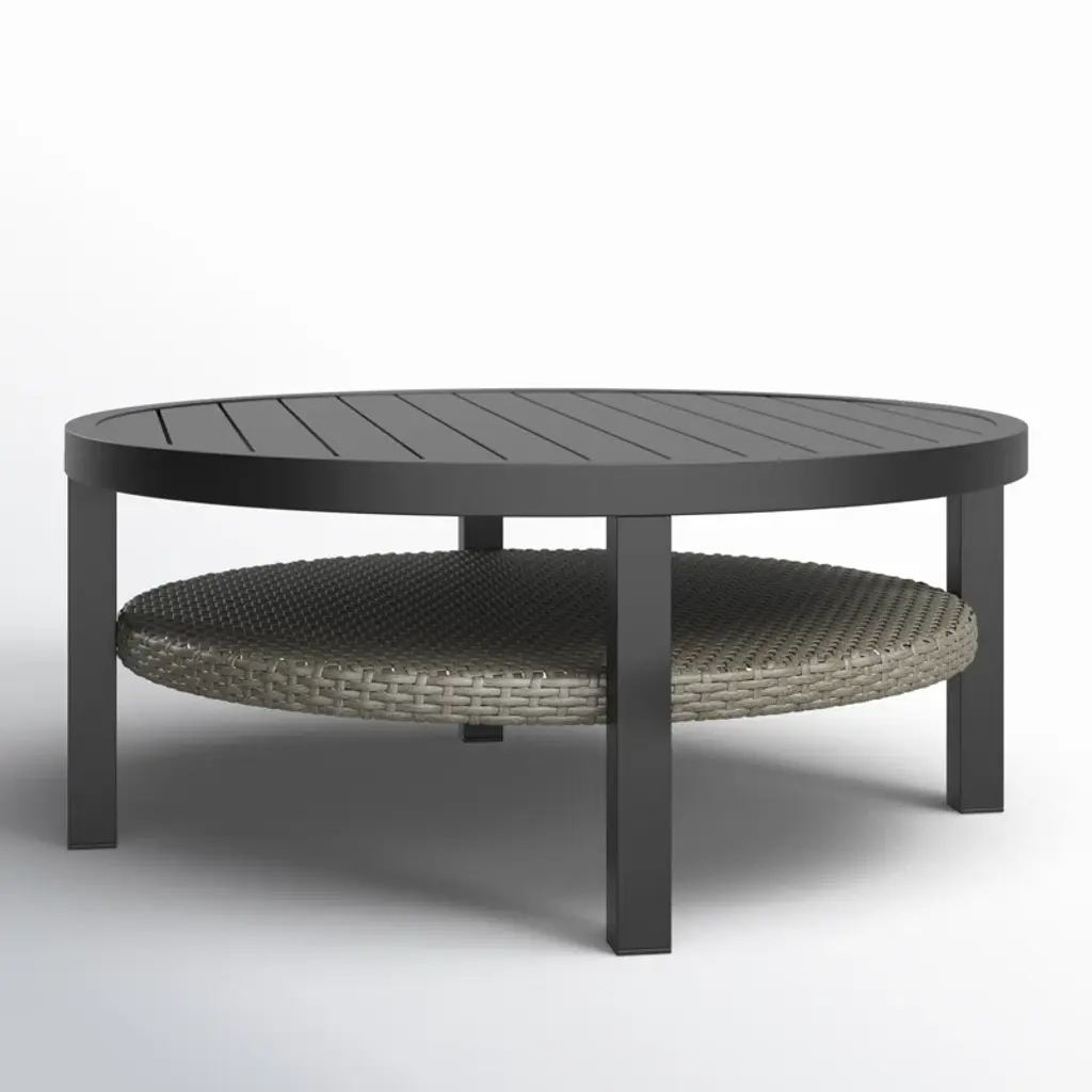 Say hello to this fantastic round coffee table that's just waiting to host your next social gathering. Crafted from sleek and sturdy metal, it offers a built-in storage shelf made from resilient wicker for that extra touch of convenience. Its round silhouette makes it a versatile centerpiece for any outdoor seating arrangement, ensuring ample surface space to cater to all your guests' needs. Plus, its lightweight aluminum construction means easy repositioning or redecorating. Just the piece you need to elevate your alfresco setup!