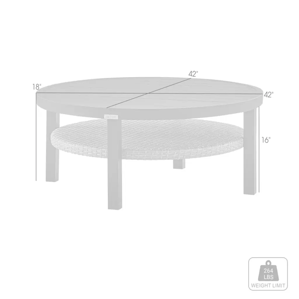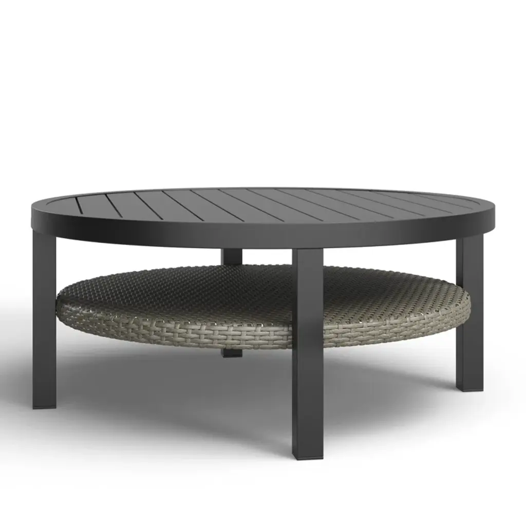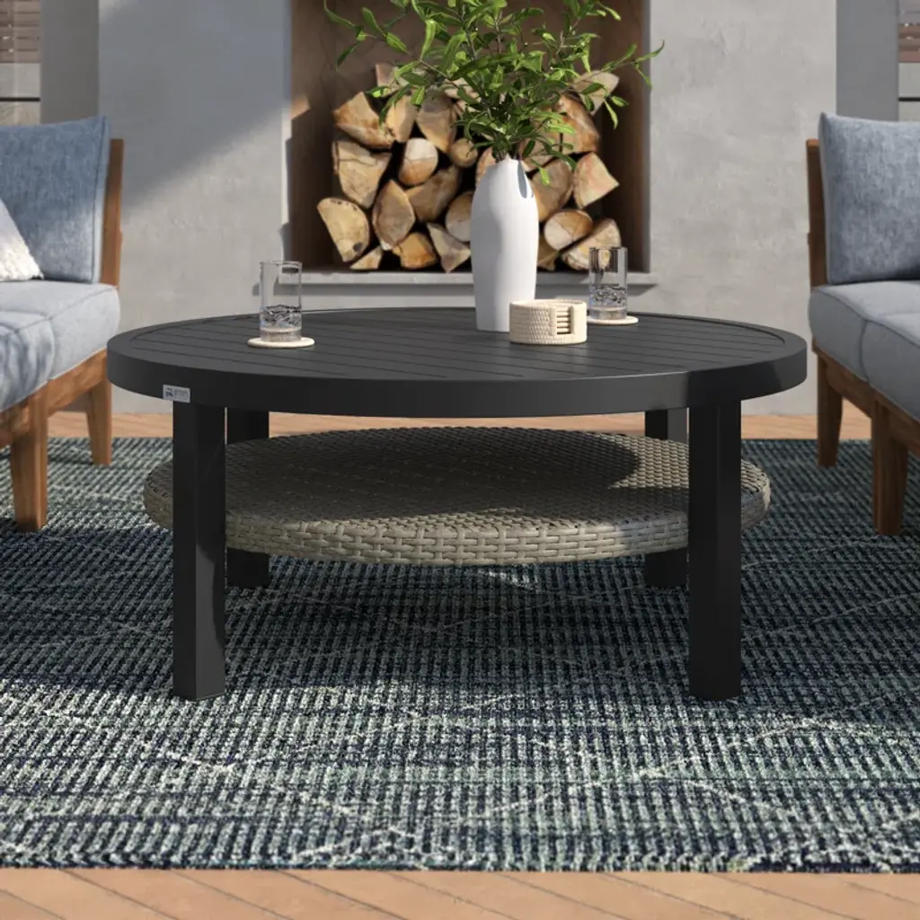 Say hello to this fantastic round coffee table that's just waiting to host your next social gathering. Crafted from sleek and sturdy metal, it offers a built-in storage shelf made from resilient wicker for that extra touch of convenience. Its round silhouette makes it a versatile centerpiece for any outdoor seating arrangement, ensuring ample surface space to cater to all your guests' needs. Plus, its lightweight aluminum construction means easy repositioning or redecorating. Just the piece you need to elevate your alfresco setup!