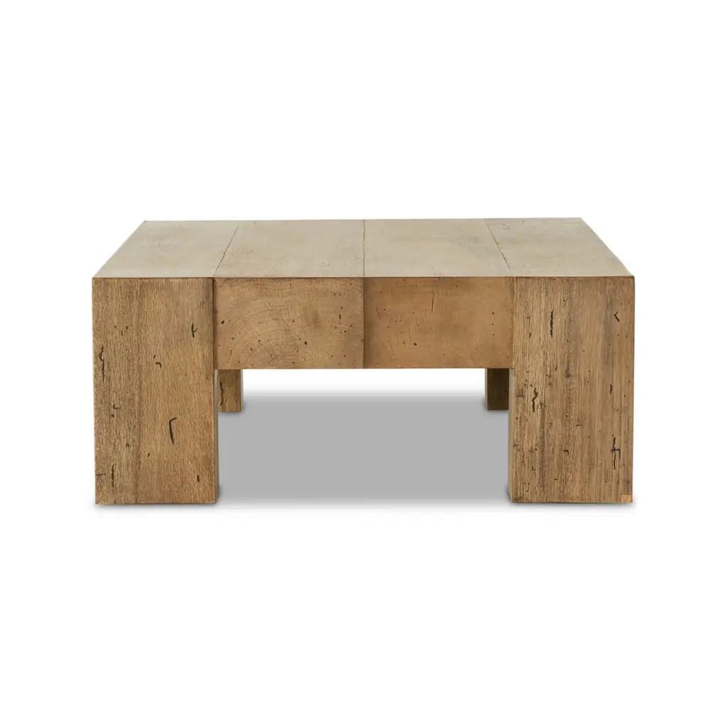 Made from thick-cut oak veneer with a faux rustic finish made to emulate wormwood, this large, rectangular coffee table features chunky squared legs and dovetail joinery detailing. Features