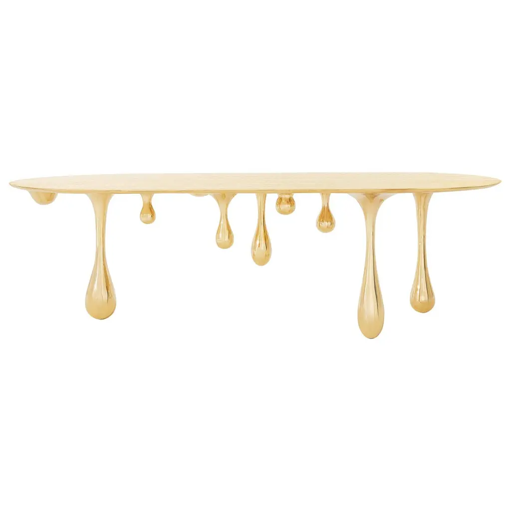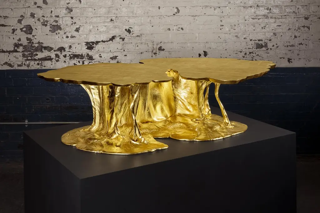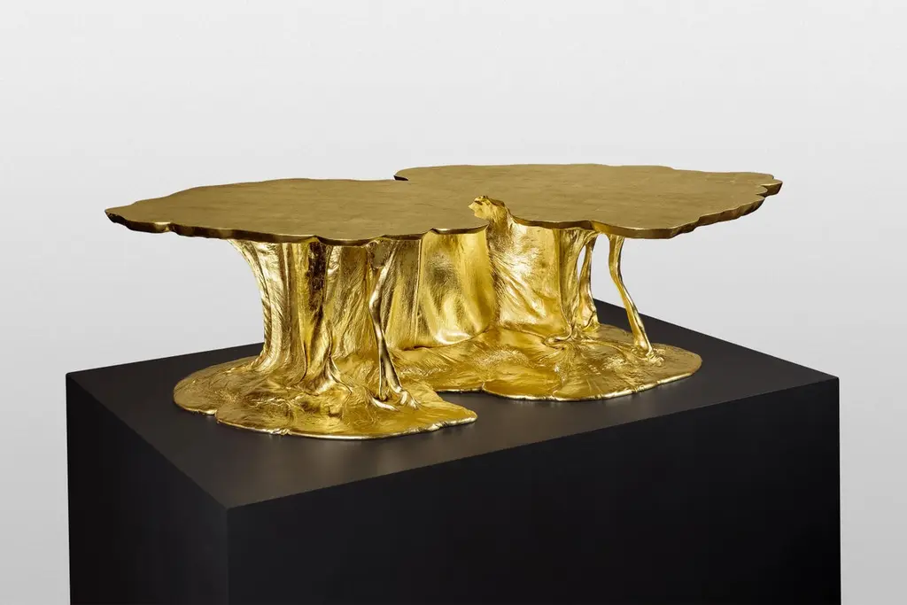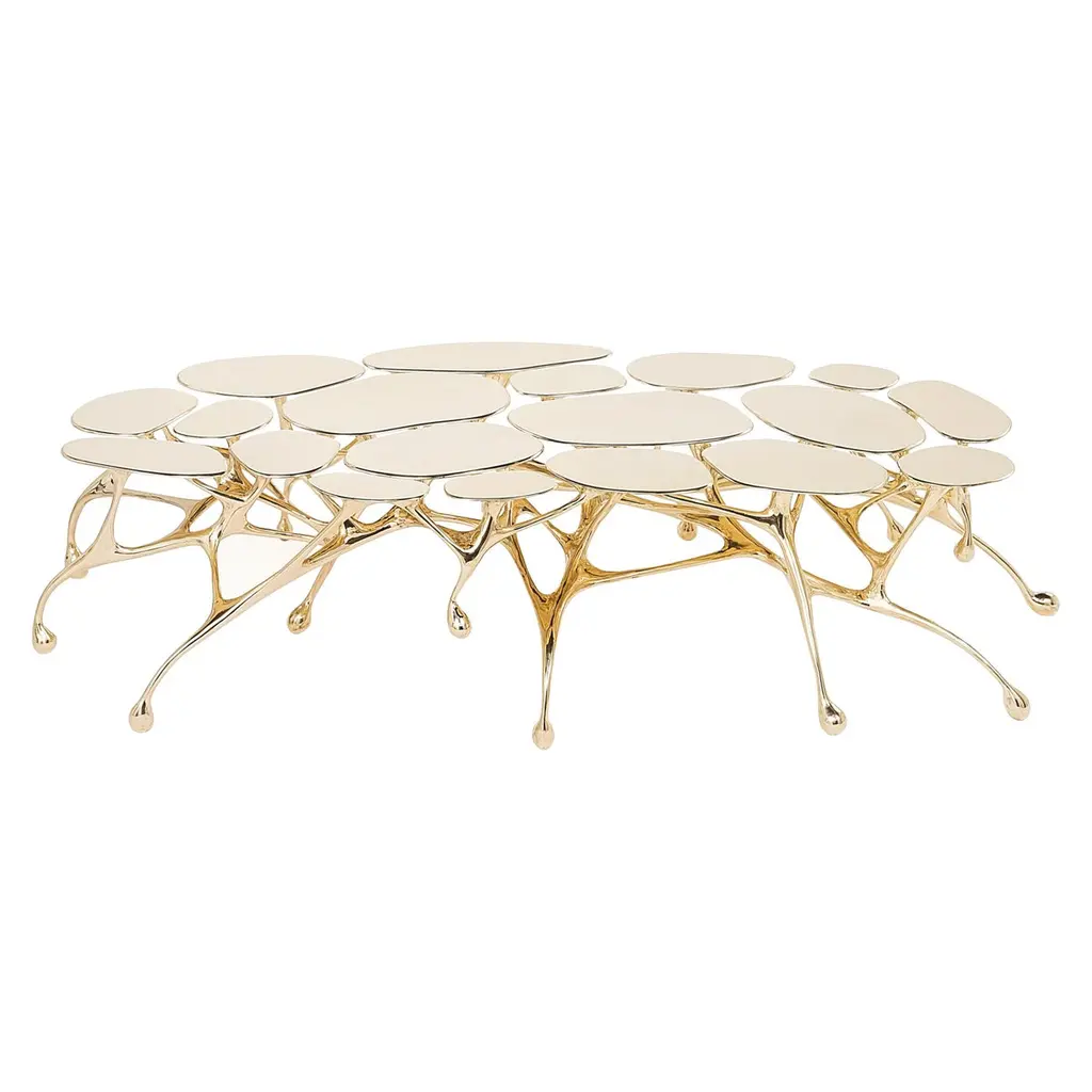 Abstraction II Coffee Table by Kris Lamba StudioDimensions: W 150 x D 80 x H 45 cmMaterials: 24ct gold, bio-polymer.Weight: 60 Kg.Kris Lamba was born in London in 1984. He creates large and small-scale sculpture, paintings and edition based collectible design. Eschewing tradition media, he works with a variety of industrial biopolymers which Lamba manipulates whilst still molten, often at extreme temperatures. Using a combination of great force, gravity and a pioneering technique of polymer-stretching, he creates otherworldly forms; shapes that defy convention and echo the spontaneous and often violent moments of interstellar creation. Aiming to partly remove the element of ‘self’ Lamba adjusts only certain parameters: temperature, quantity, molecular weight and the applied force. Then, using custom designed machinery he pulls apart the molten material, selectively freezing and re-heating where necessary; the resulting shapes seemingly grown rather than made. After a period of consideration, the forms are refined and re-worked over a period of weeks and are either cast in bronze using the traditional ‘lost-wax’ method, or are finished in precious metals, pigment rich paints and composite resin fabrics.Creating work is an energetic process for Lamba, his pieces becoming expressions of a singularity; ideas forged though intense experimentation, later undergoing gradual stages of refinement and craftsmanship. Originally a trained classical percussionist Lamba then went on to study contemporary design. His stretched and manipulated sculptures can be seen as a rebellion against the confines of working within tradition; their spontaneous forms defying and reworking traditional artistic practice. His recent series of raw pigment sculptures go further to reinforce this point, warping the very space that they occupy. Lamba’s work has been published worldwide to widespread critical acclaim and is held in several prominent collections. He currently lives and works near Brighton, UK.